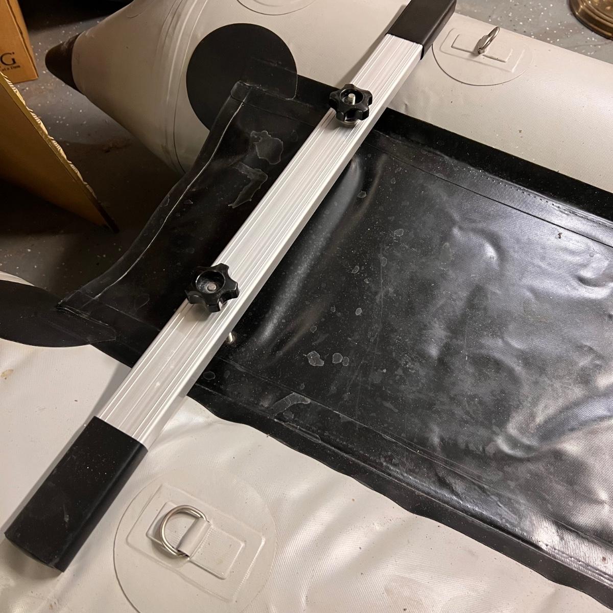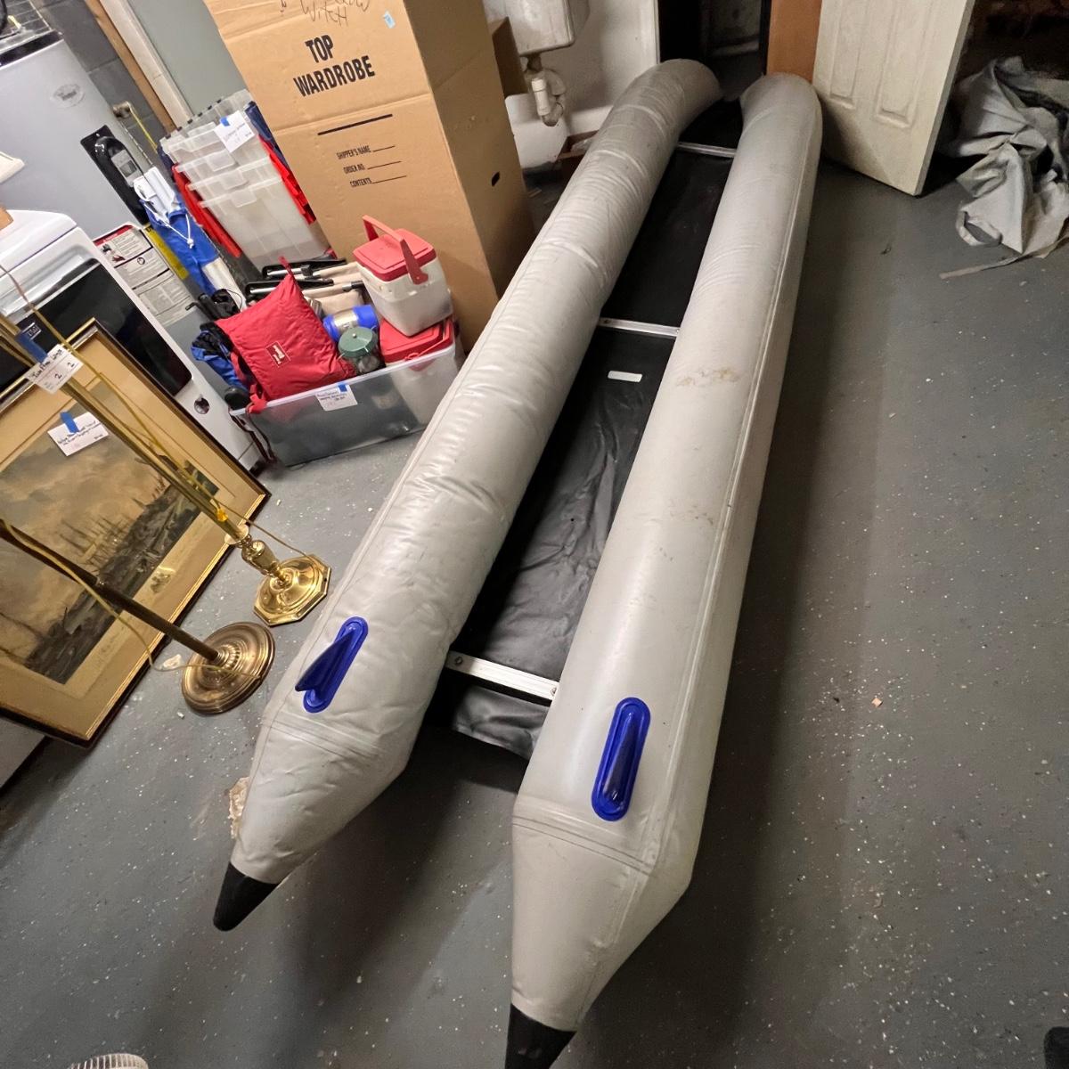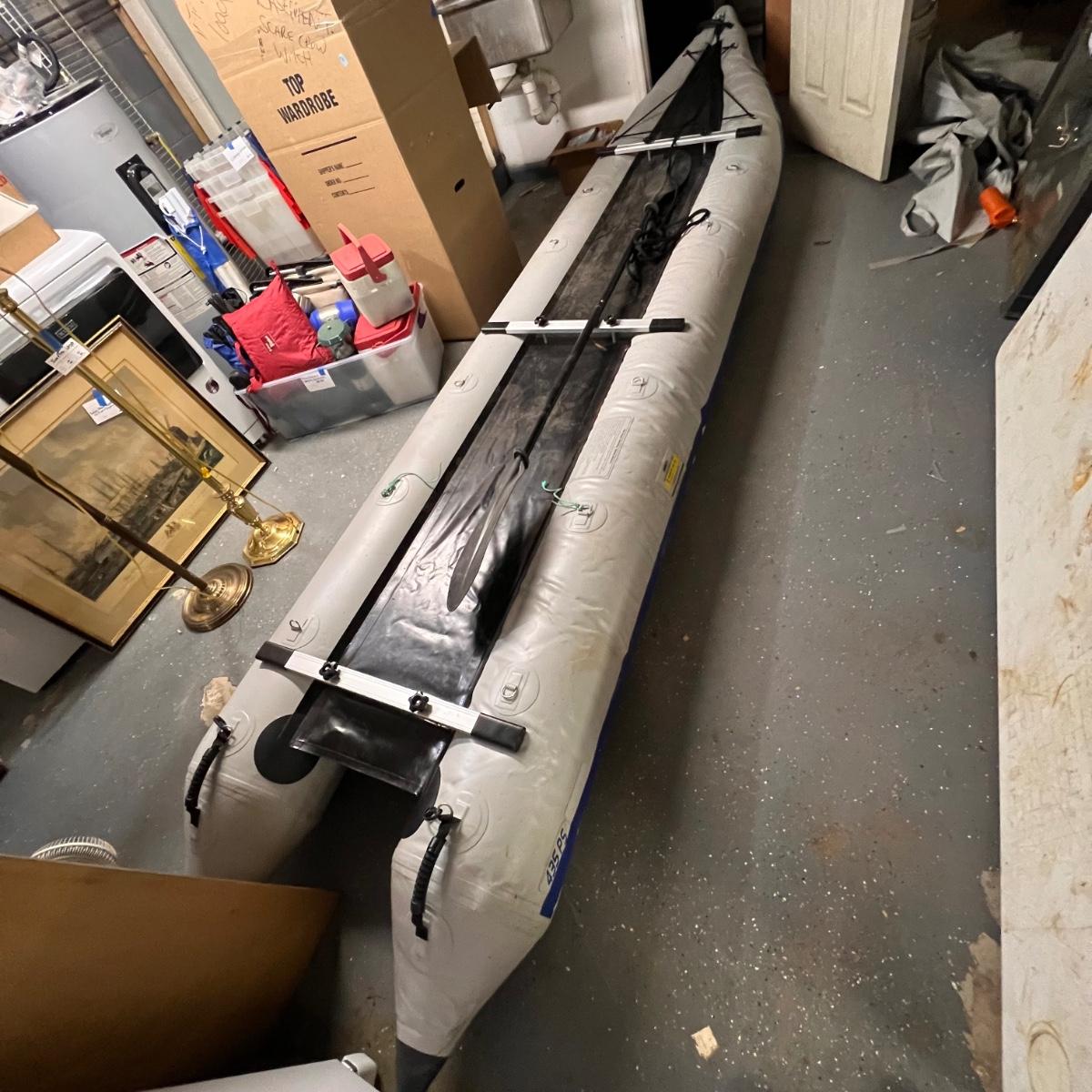This Sea Eagle inflatable boat comes with oar, patch kit and a carry bag. See images for more information. It has been deflated for transportation. There are seats in other lots in this sale that would work for this boat.