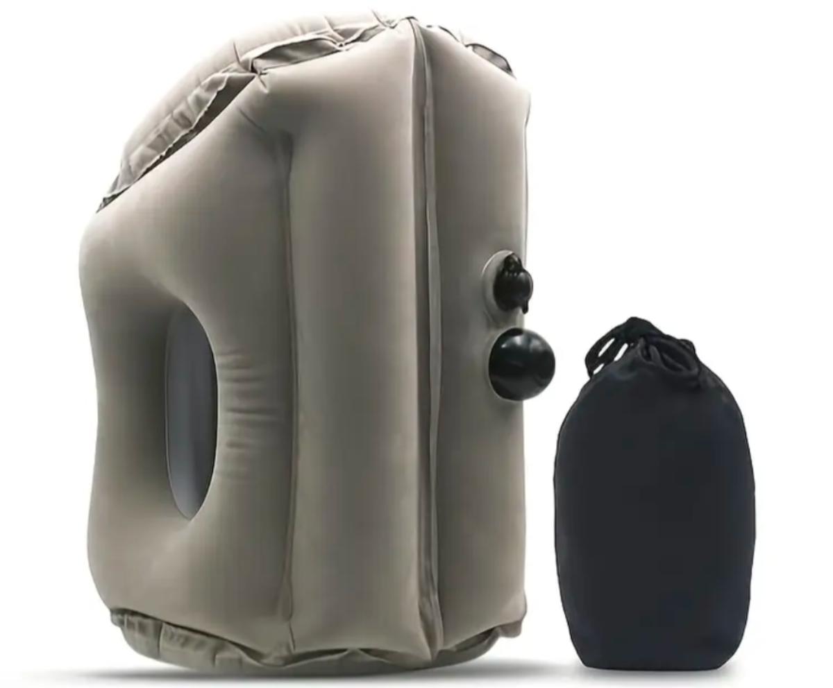 inflatable travel pillow, airplane pillow, neck rest, portable sleep cushion, ergonomic design, travel accessory, nap pillow, arm rest pillow, comfort travel gear, compact pillow, sleep aid, travel essentials, gray pillow, carry bag included, flight comfort
