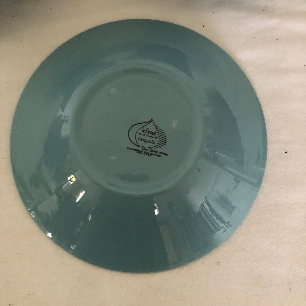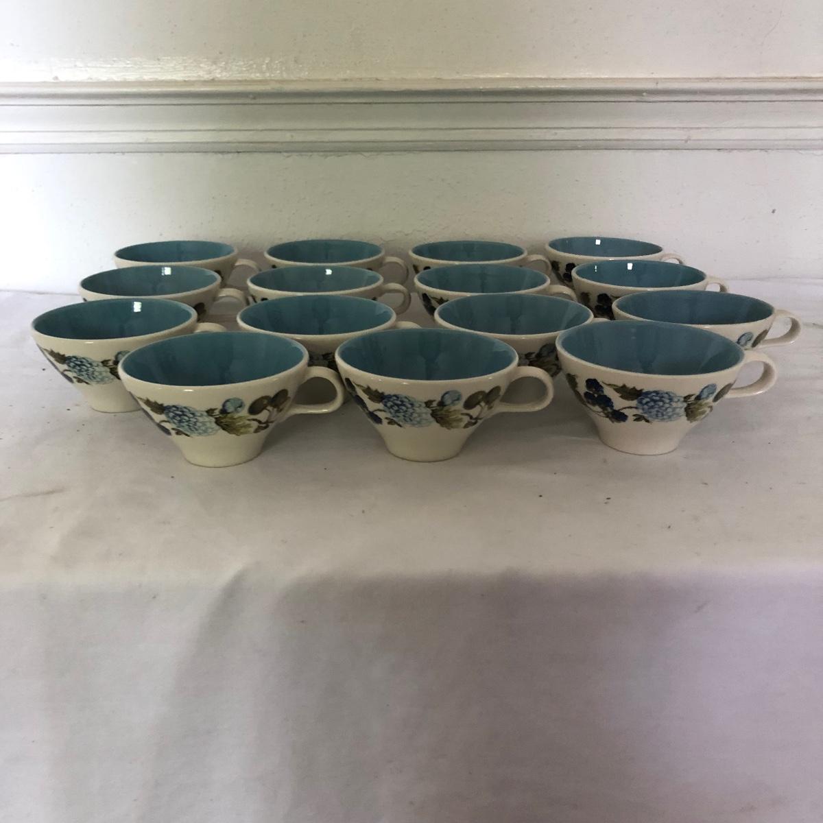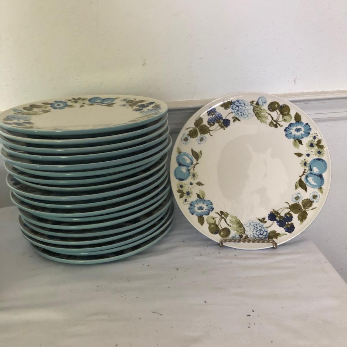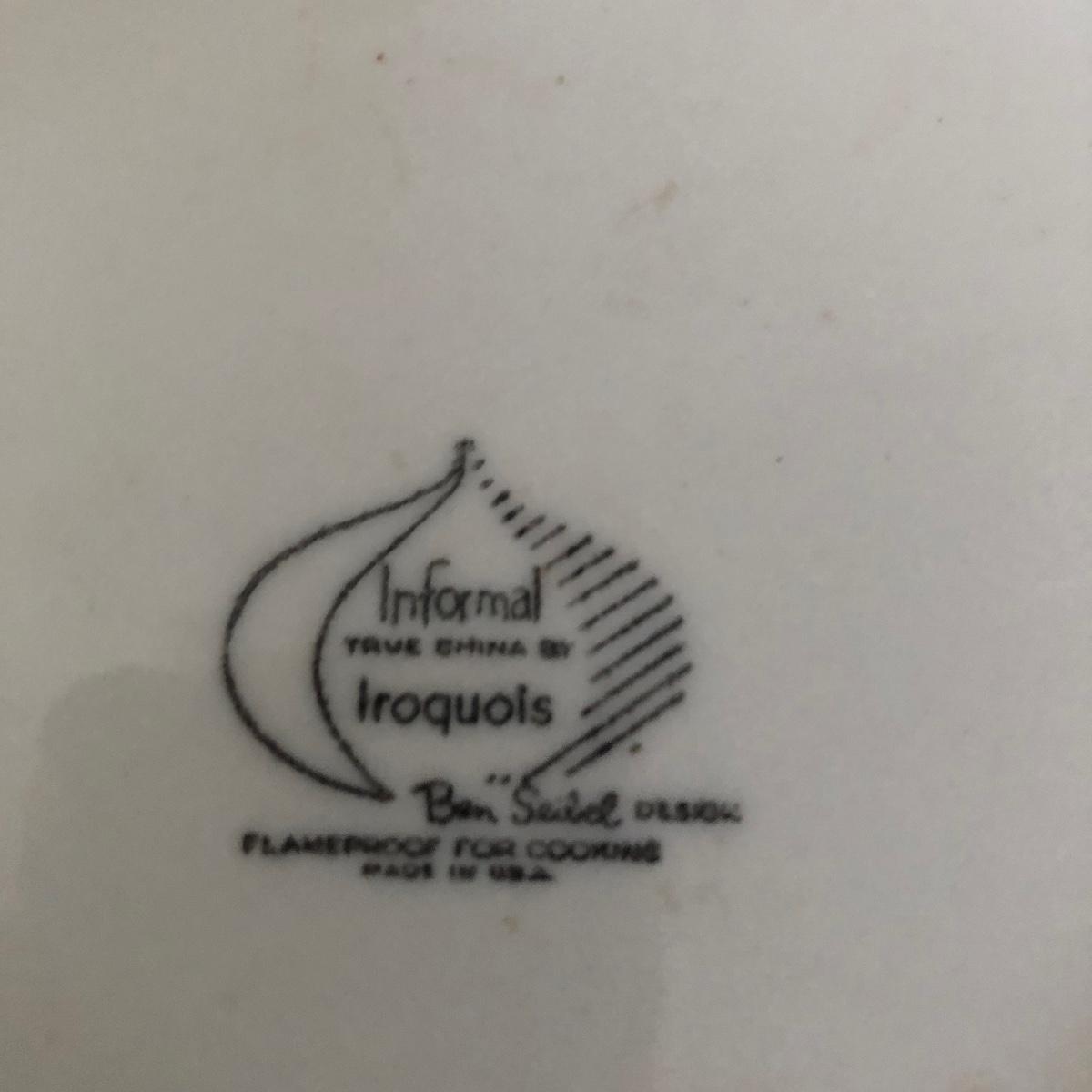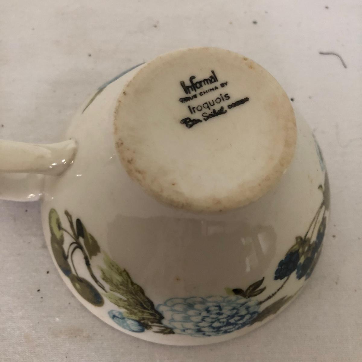 Lot includes Informal True China by Iroquois in the Vineyard pattern. Includes fifteen salad plates, nineteen dinner plates, fifteen cups, eleven saucers, three bowls, platter, serving dish, creamer, sugar bowl and a butter dish that is missing bottom piece.
