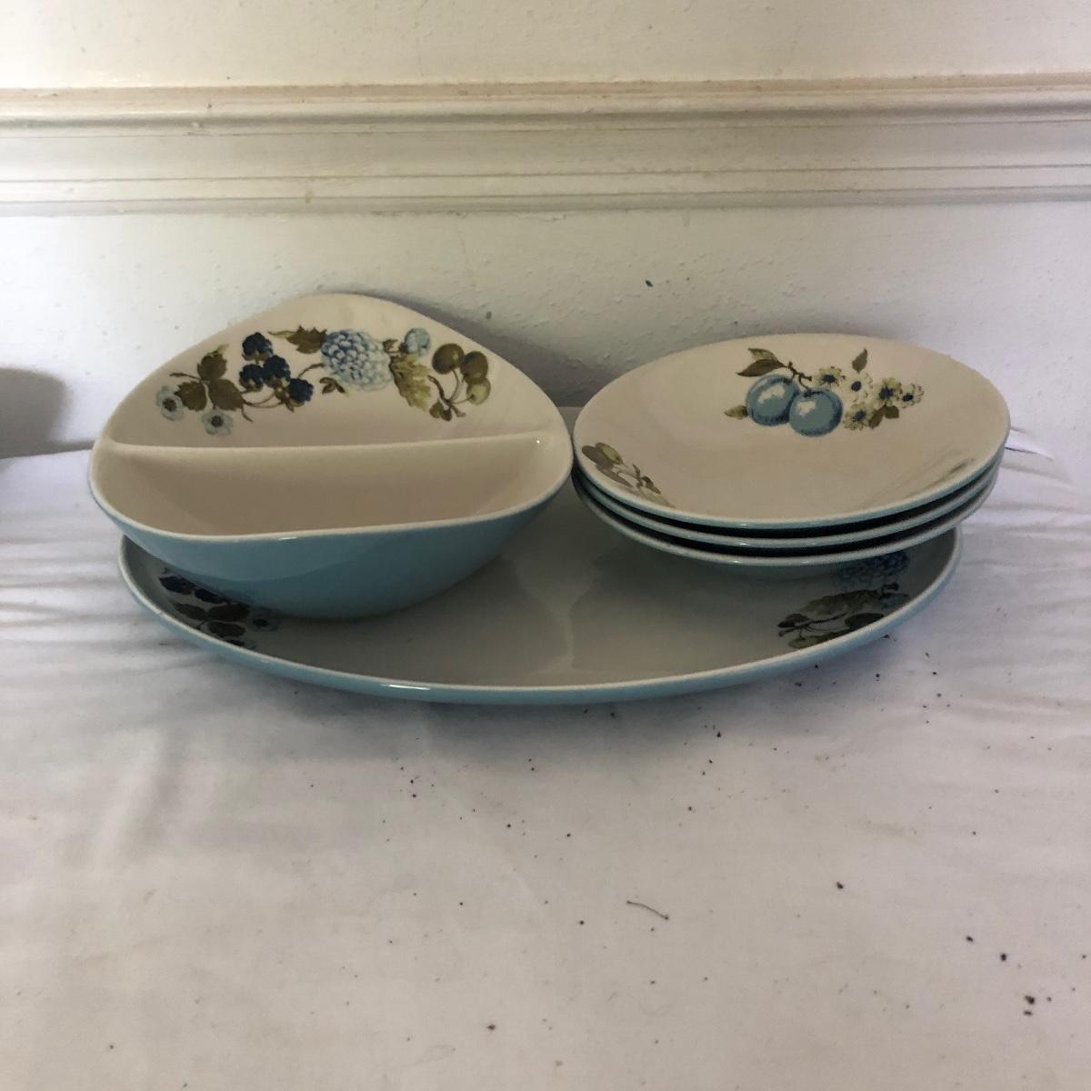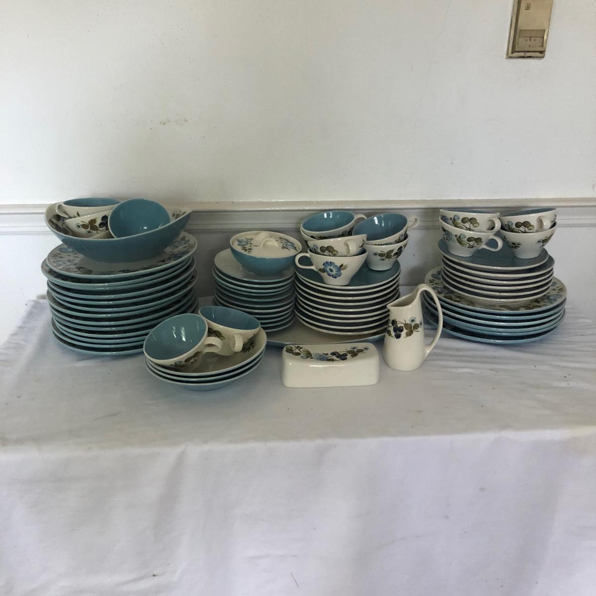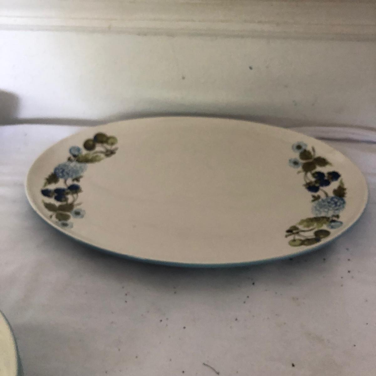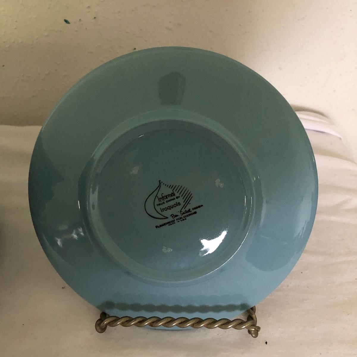 Lot includes Informal True China by Iroquois in the Vineyard pattern. Includes fifteen salad plates, nineteen dinner plates, fifteen cups, eleven saucers, three bowls, platter, serving dish, creamer, sugar bowl and a butter dish that is missing bottom piece.