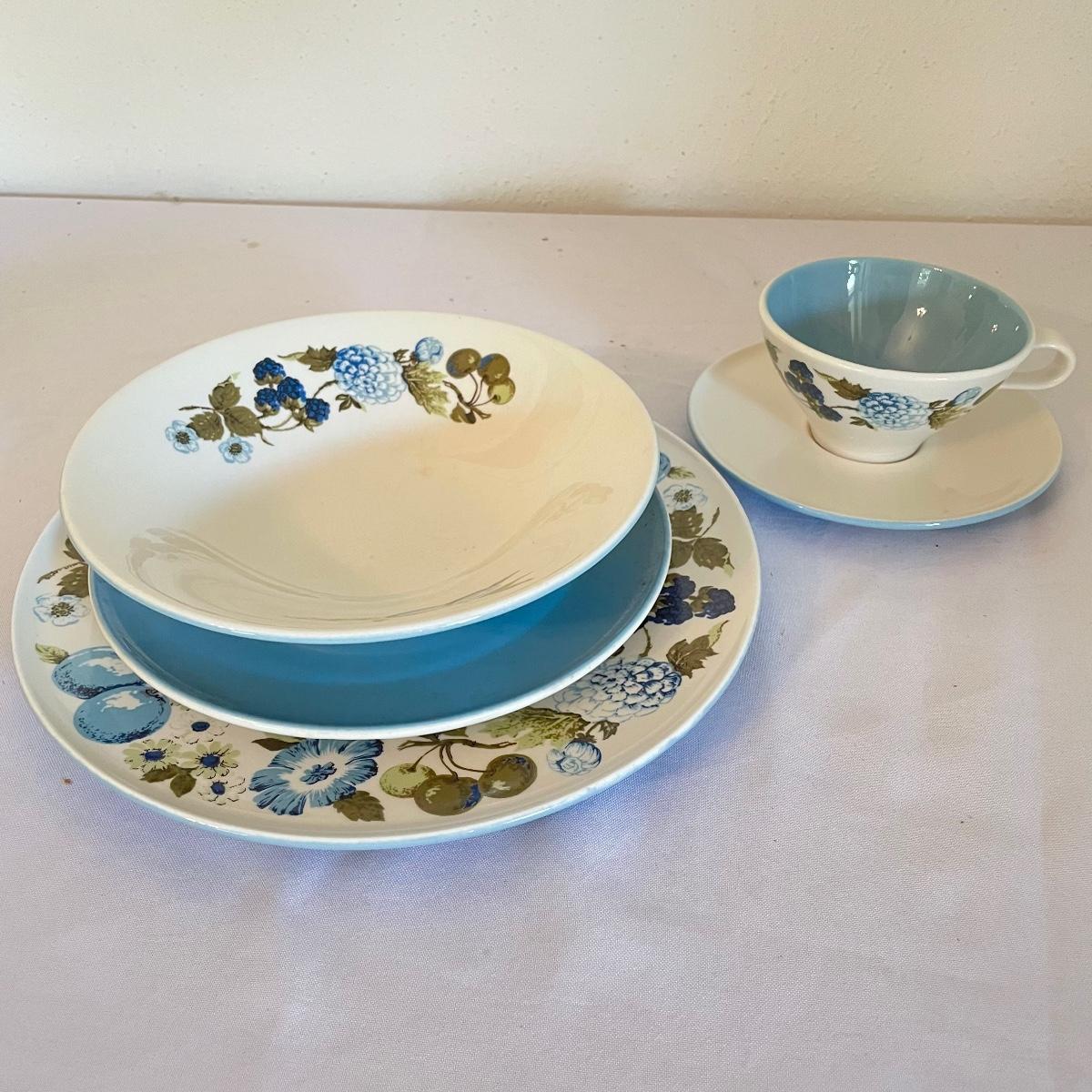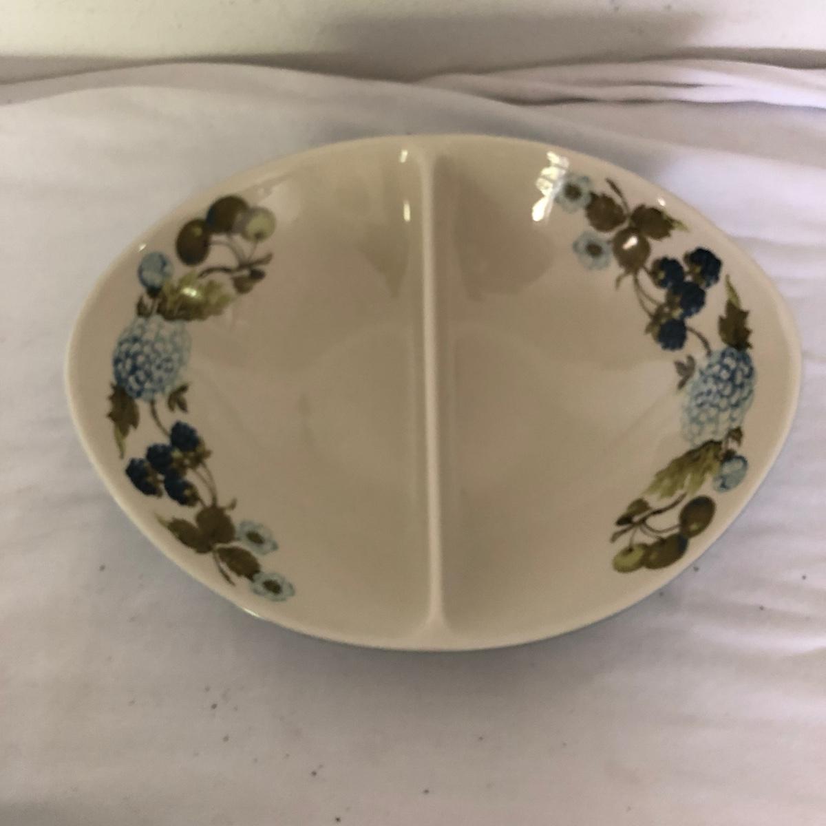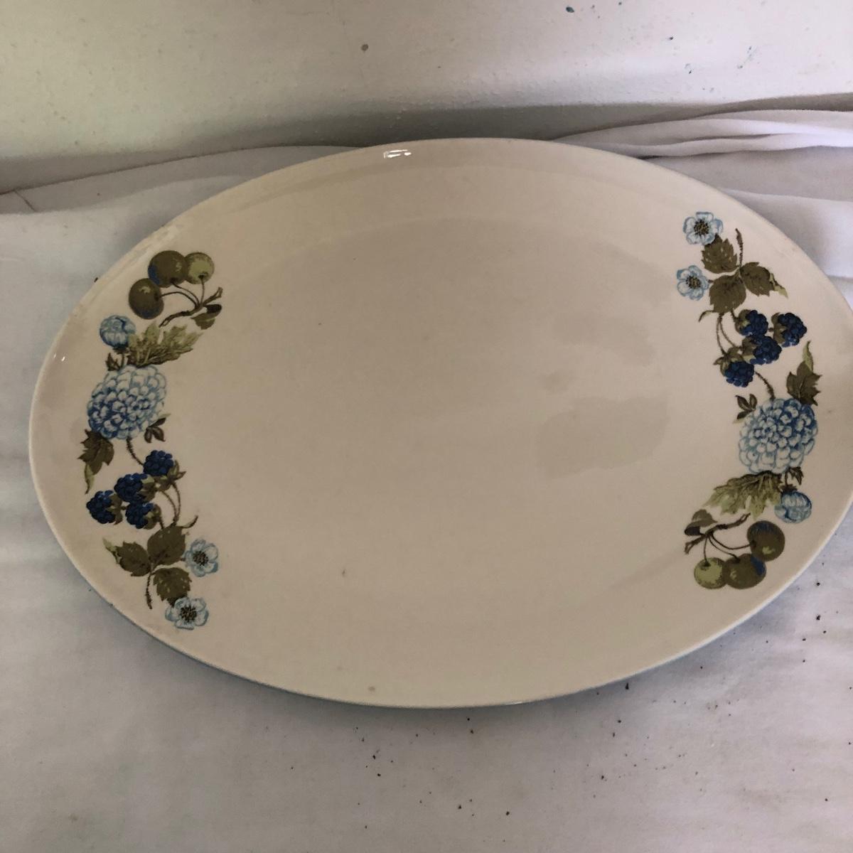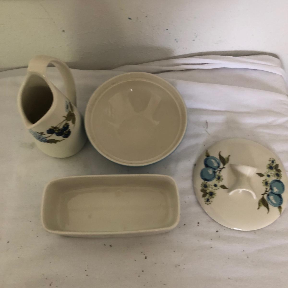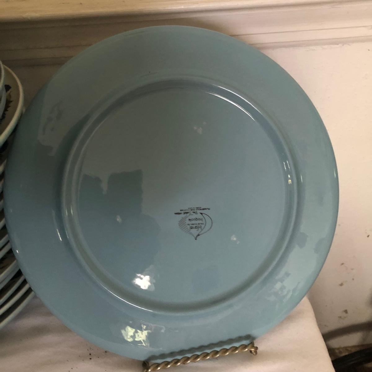 Lot includes Informal True China by Iroquois in the Vineyard pattern. Includes fifteen salad plates, nineteen dinner plates, fifteen cups, eleven saucers, three bowls, platter, serving dish, creamer, sugar bowl and a butter dish that is missing bottom piece.