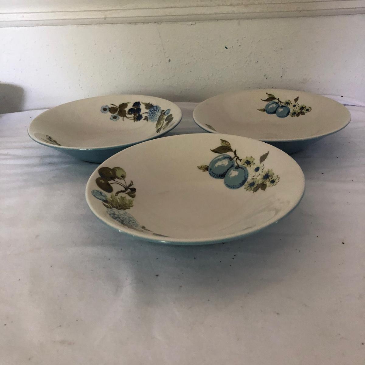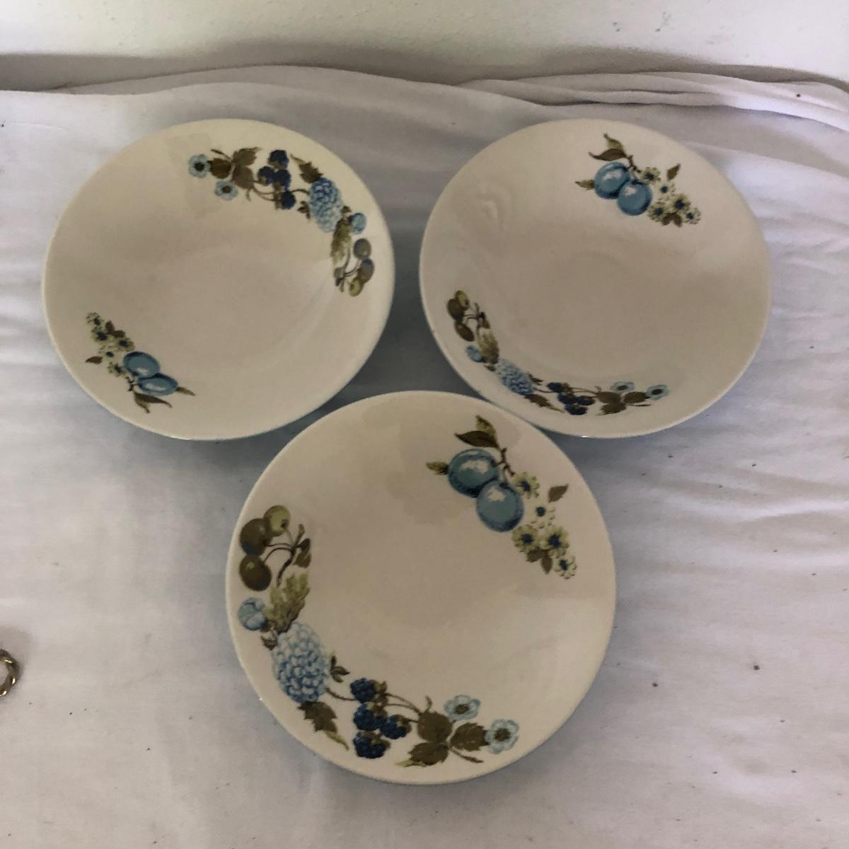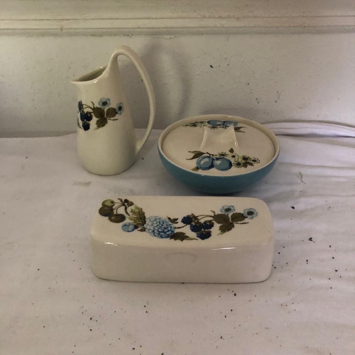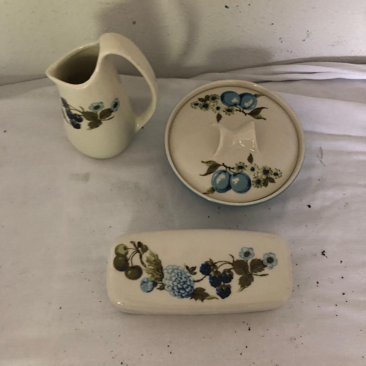 Lot includes Informal True China by Iroquois in the Vineyard pattern. Includes fifteen salad plates, nineteen dinner plates, fifteen cups, eleven saucers, three bowls, platter, serving dish, creamer, sugar bowl and a butter dish that is missing bottom piece.
