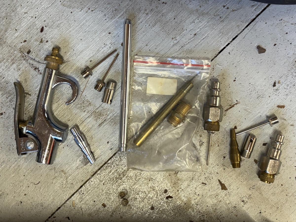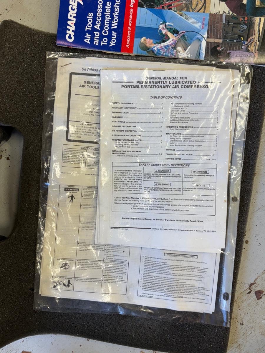 Compact compressor is 6.5” x 11.25” x 10.5H” and powered on when plugged in. See images for the various accessories and case that are included.
