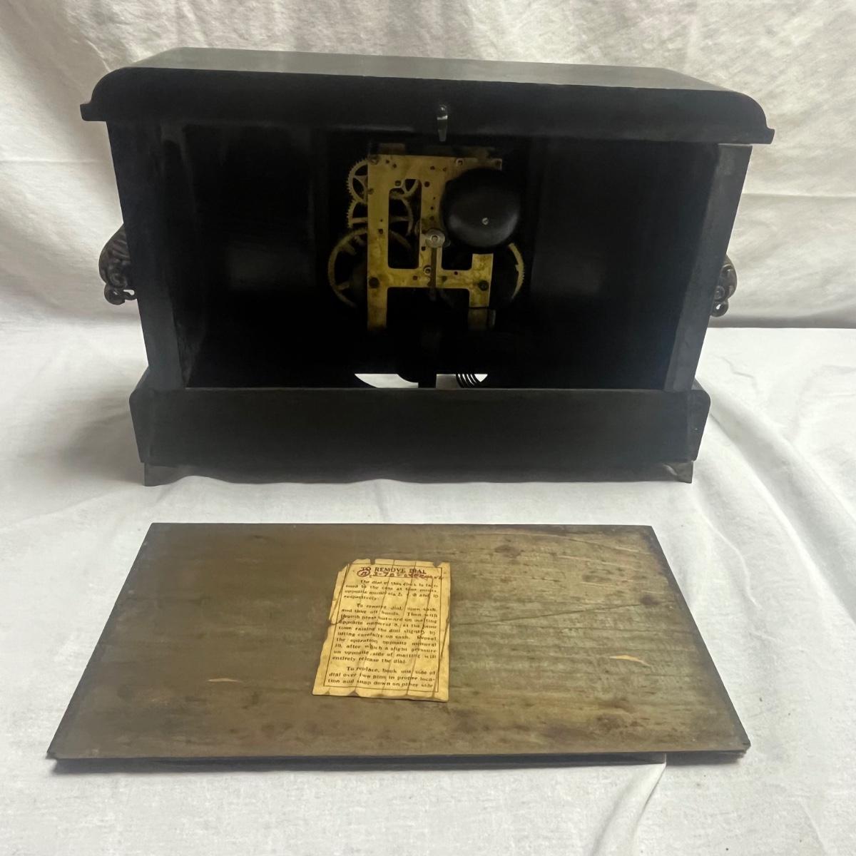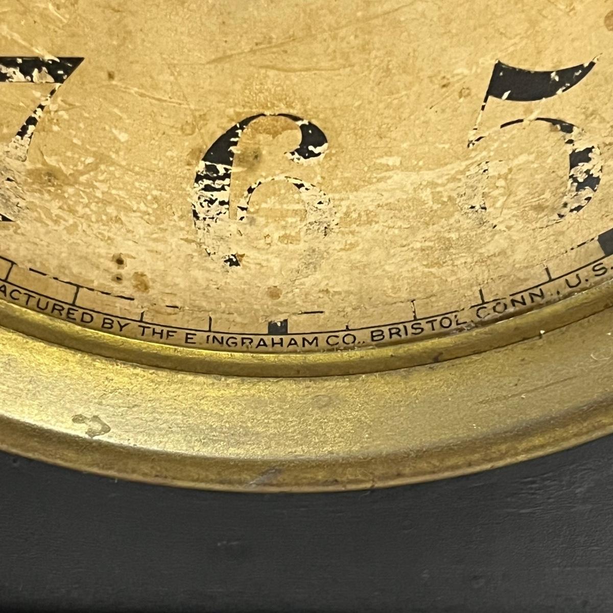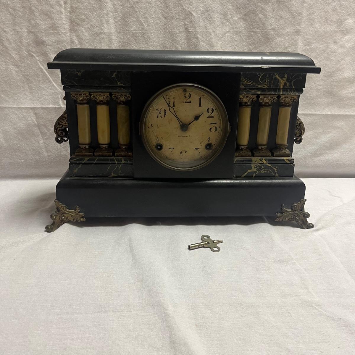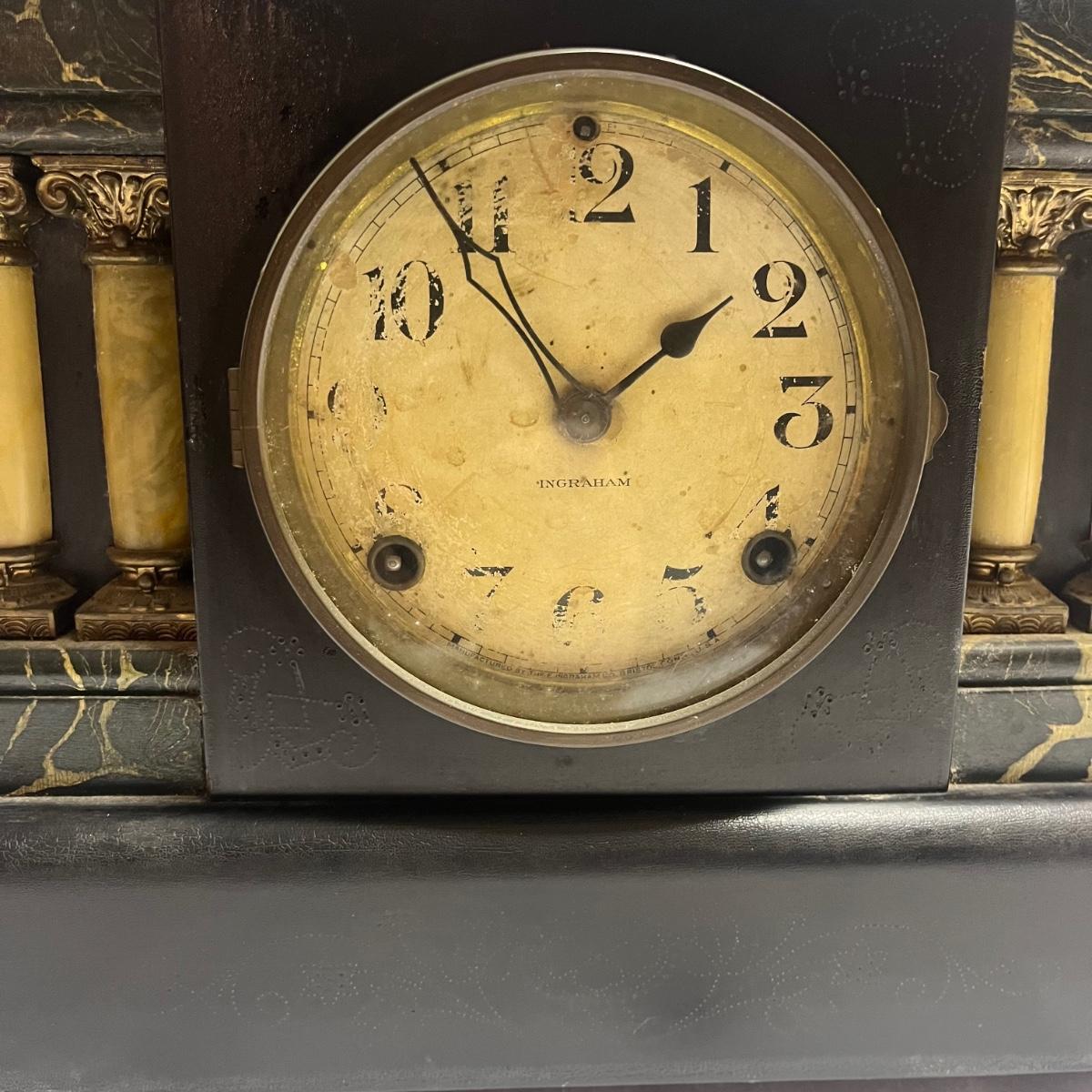 Lot includes a Ingraham mantel clock with key. Clock measures 6.75” x 16” x 11”H. Clock was not tested. Clock door back has some splitting of wood, see pictures.