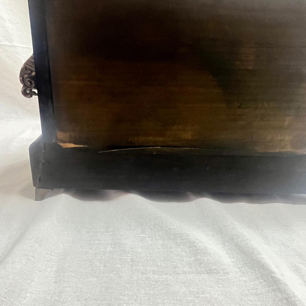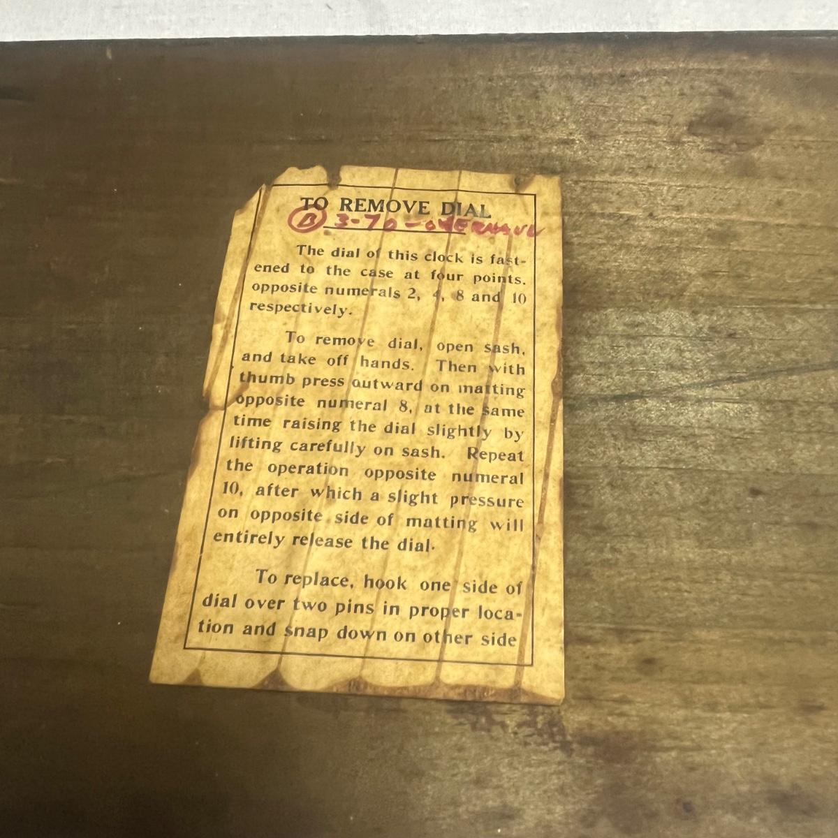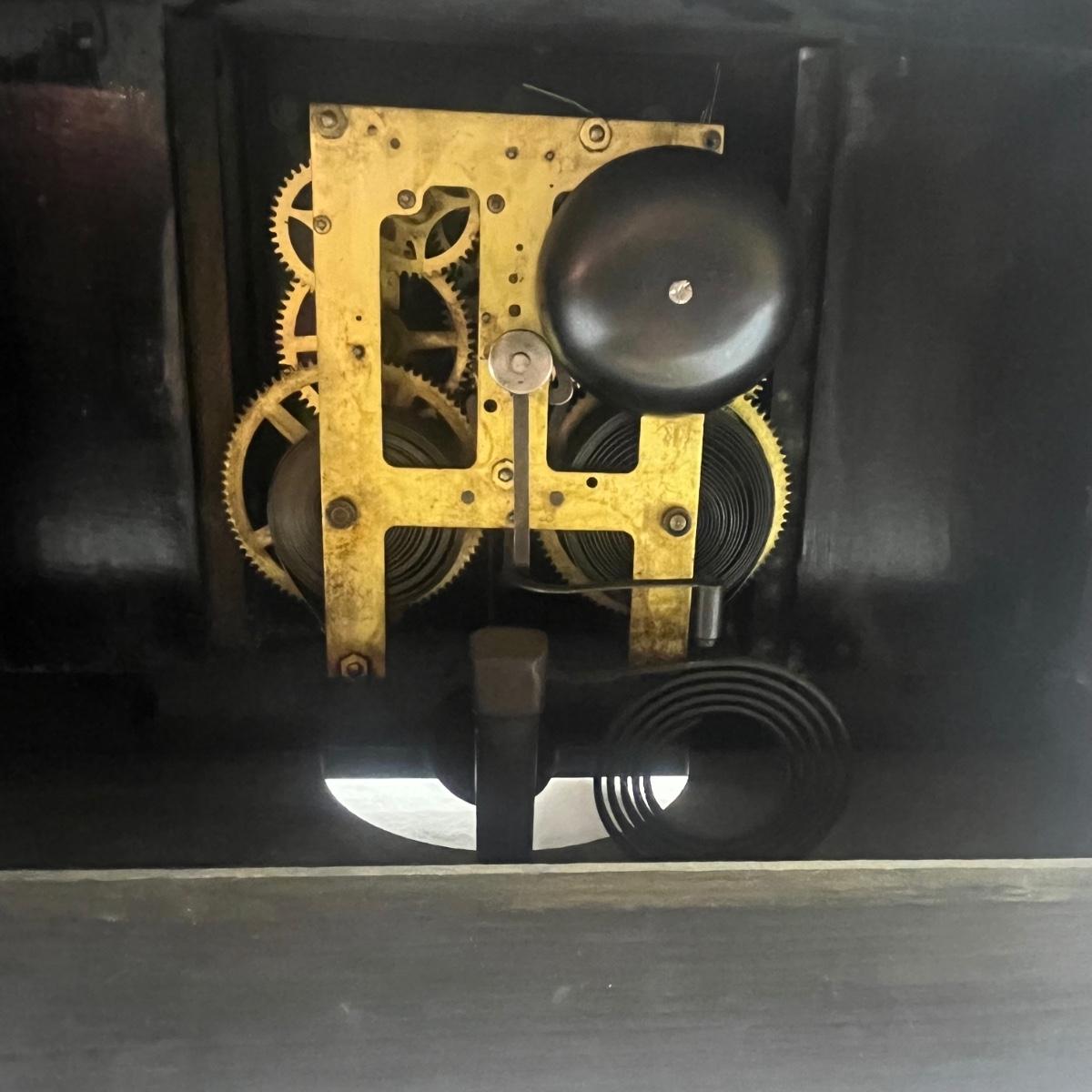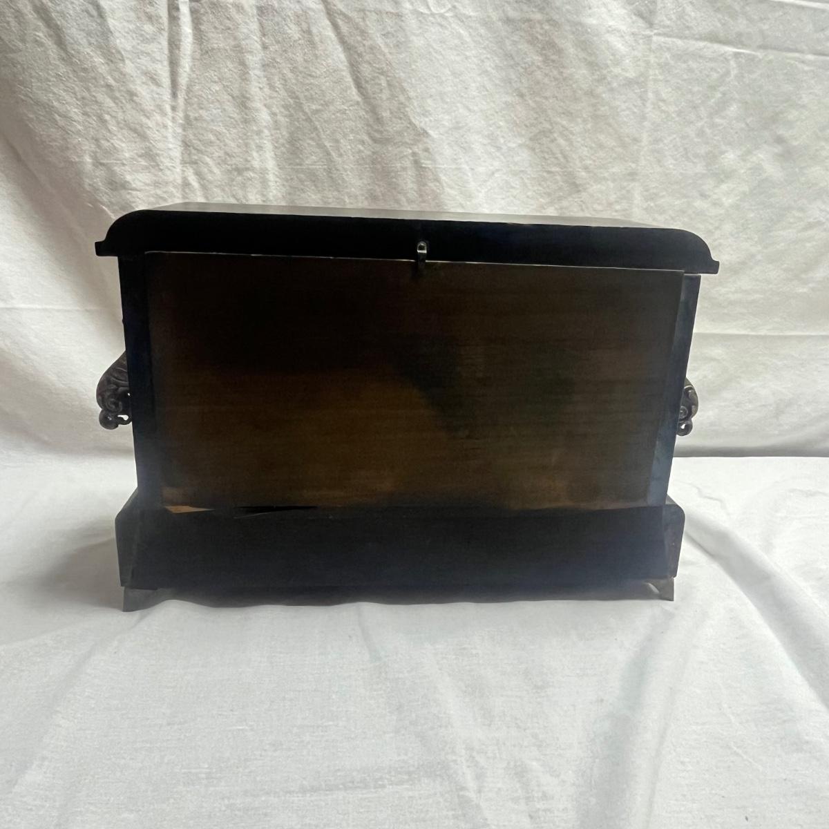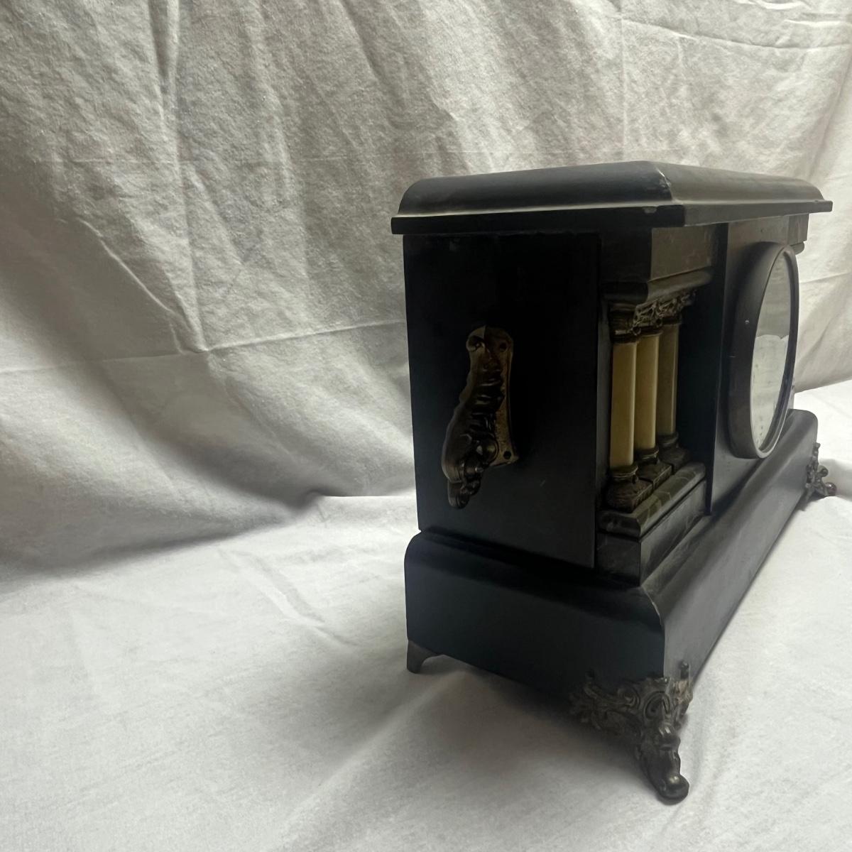 Lot includes a Ingraham mantel clock with key. Clock measures 6.75” x 16” x 11”H. Clock was not tested. Clock door back has some splitting of wood, see pictures.