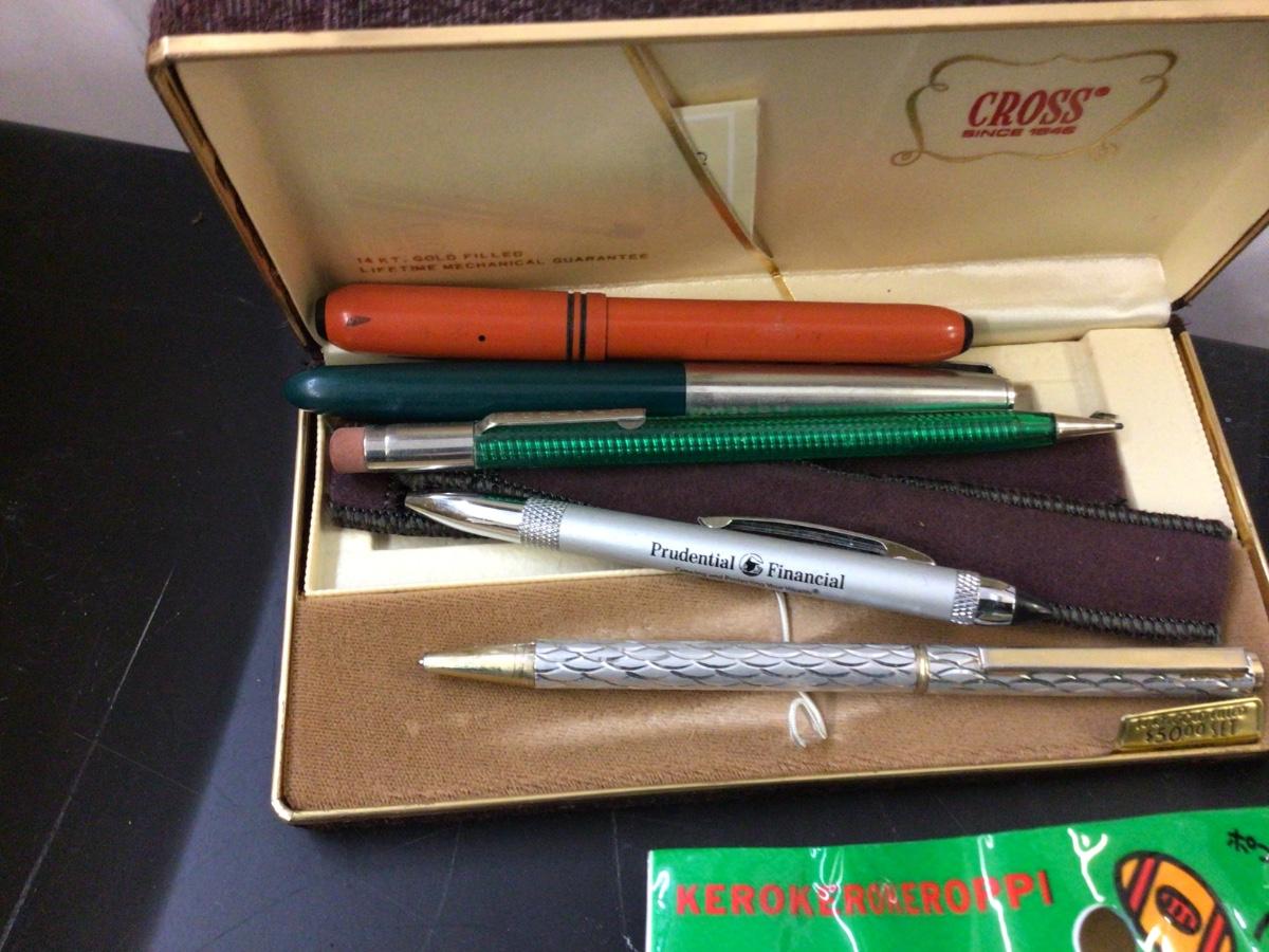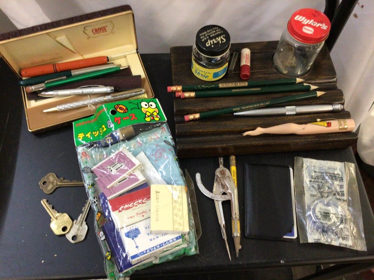 You get several vintage ink pens, advertising pens, wood pen or pencil holder, ink jar, matches, keys, compass, solar calculator, key chain.