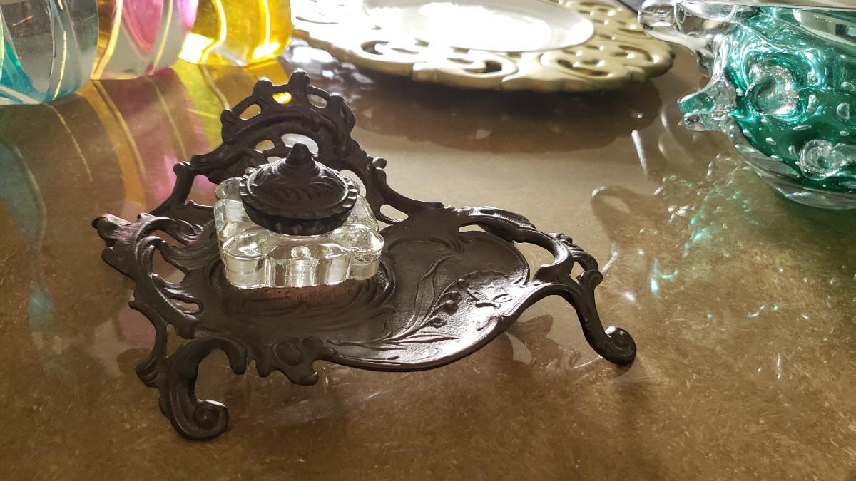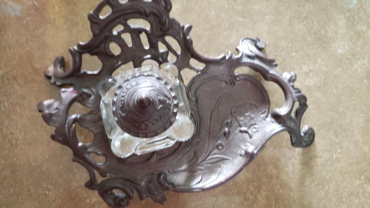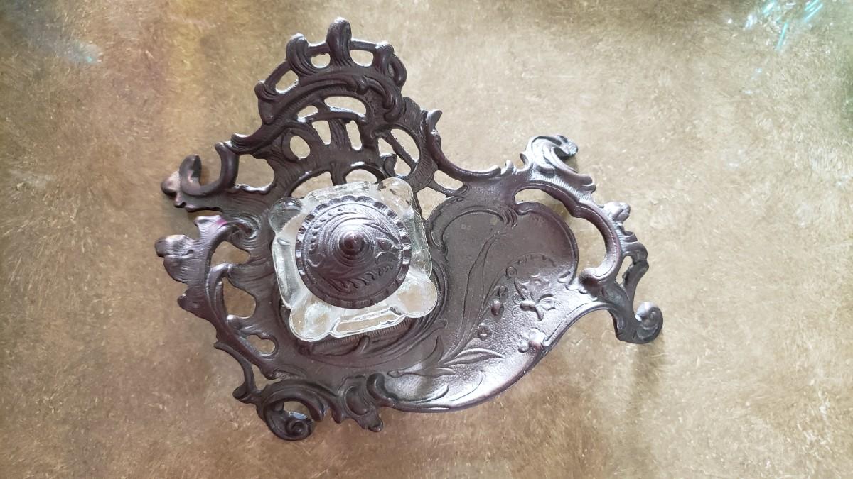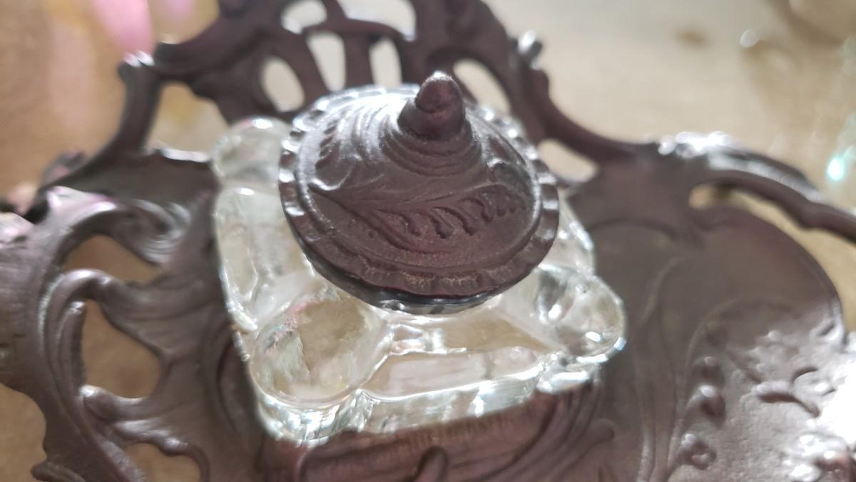 Vintage Ornate Solid Brass Inkwell Victorian Crystal Well Art Nouveau Ink Desk