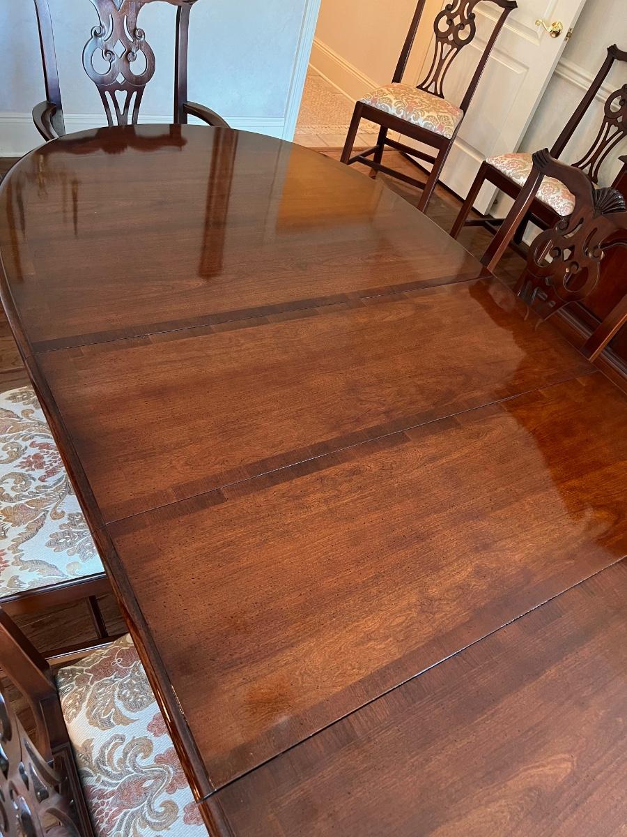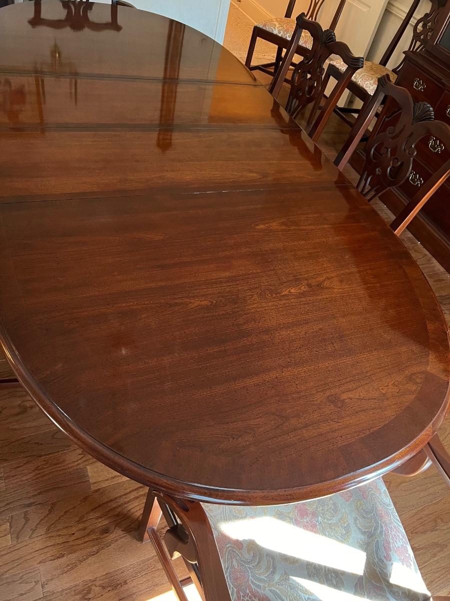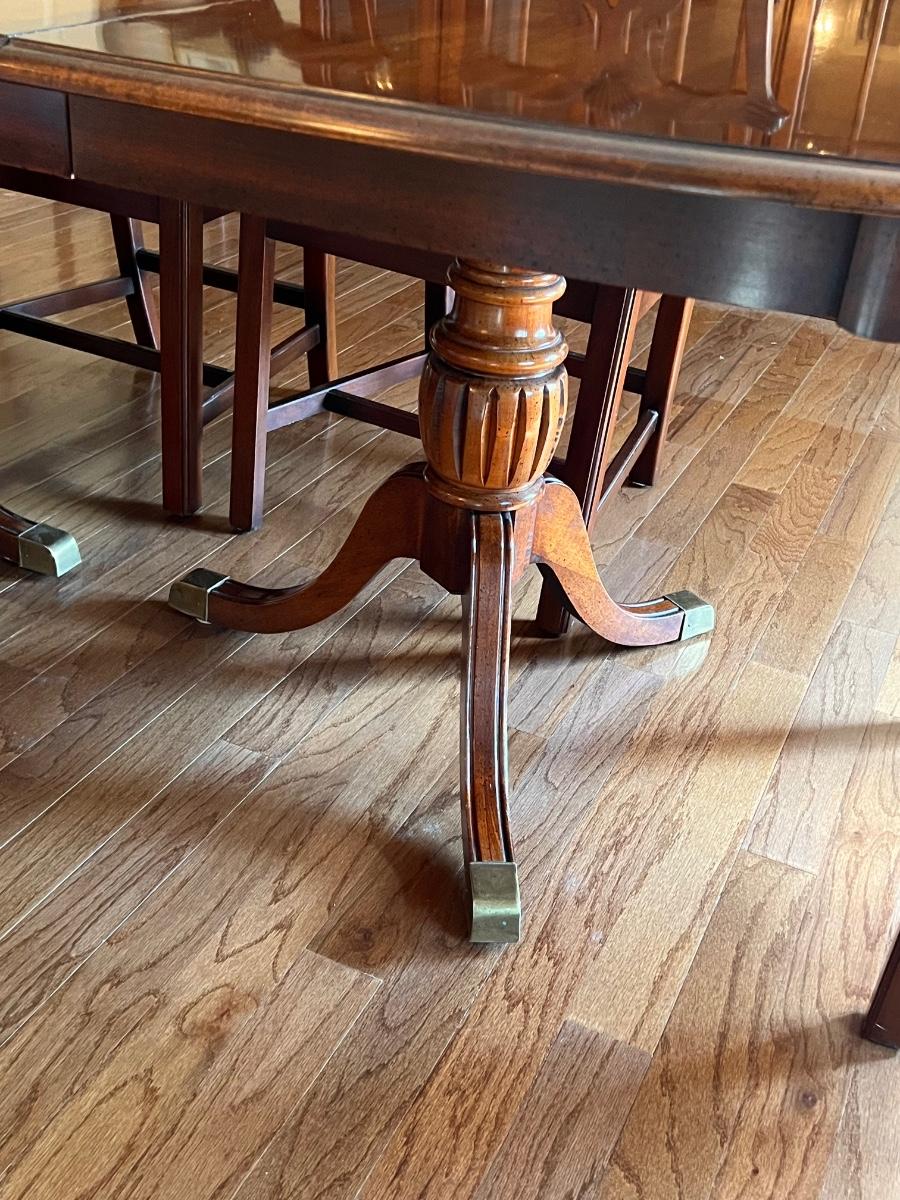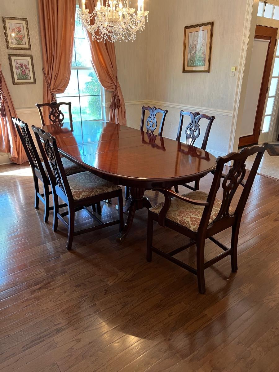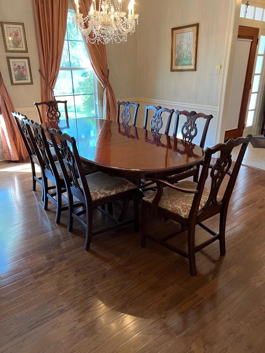 LINK-TAYLOR CO ~ Inlaid Dining Room Double Pedestal Table, Eight (8) Chippendale Style Chairs & Two (2) Leaves