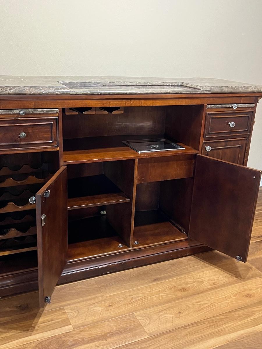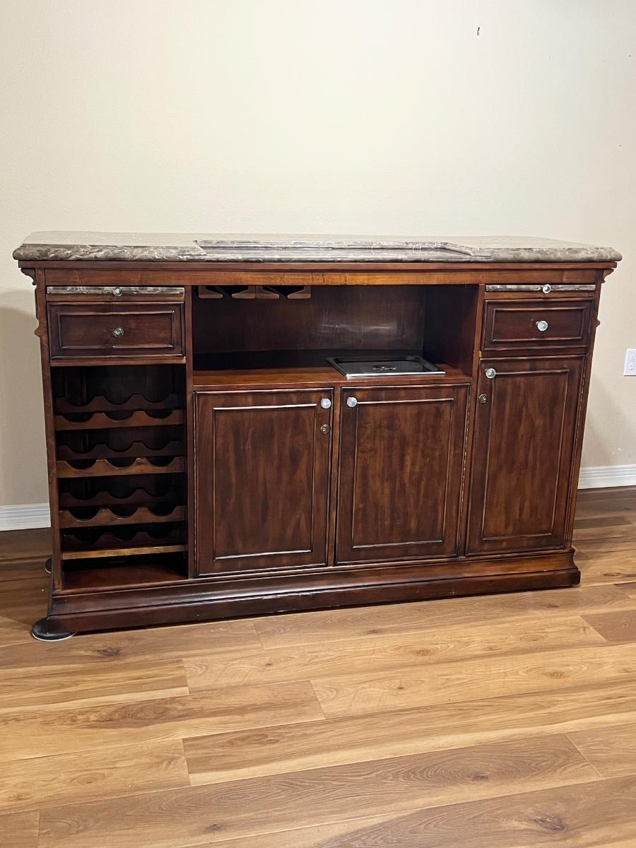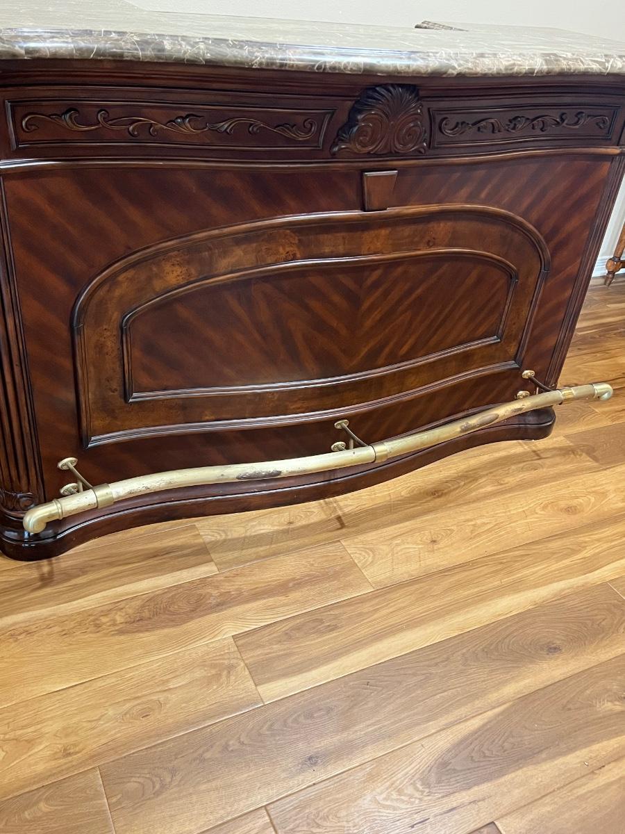 Very heavy ~ Has no key for doors ~ Has wear from use, see photos for condition ~ Has had a minor repair on bar top hardly noticeable, see photos ~ Research shows bar weighs close to 500 lbs, ~ please bring help! We cannot help move this item ~ 43” H x 69” W x 30” D With metal foot bar ~ Ice bucket = 6” H x 12” W x 9.5” D