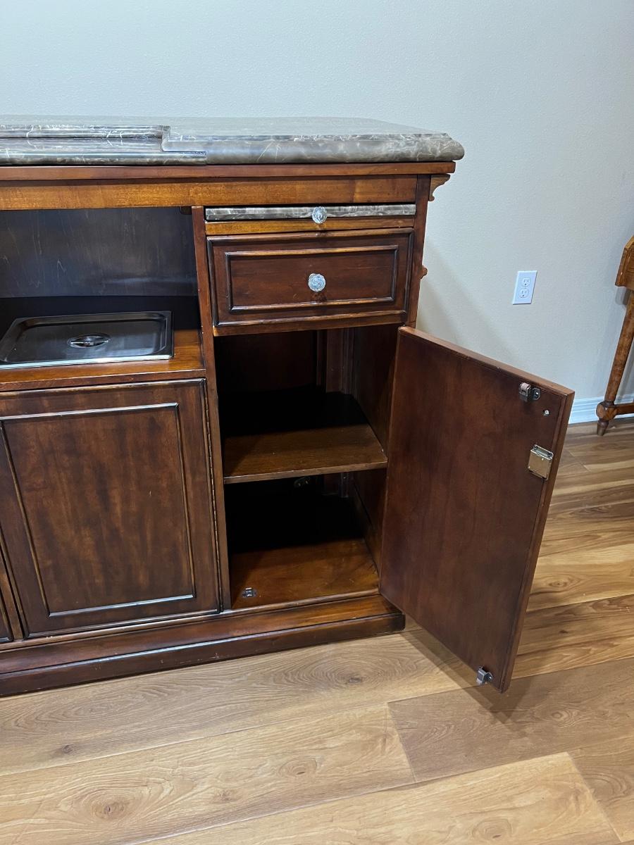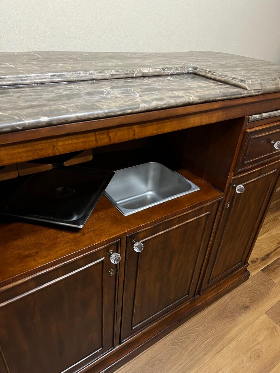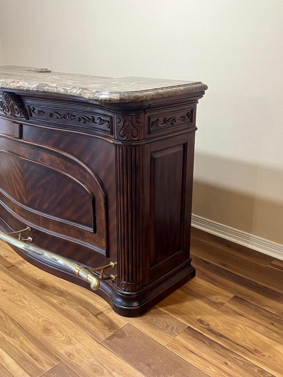 Very heavy ~ Has no key for doors ~ Has wear from use, see photos for condition ~ Has had a minor repair on bar top hardly noticeable, see photos ~ Research shows bar weighs close to 500 lbs, ~ please bring help! We cannot help move this item ~ 43” H x 69” W x 30” D With metal foot bar ~ Ice bucket = 6” H x 12” W x 9.5” D