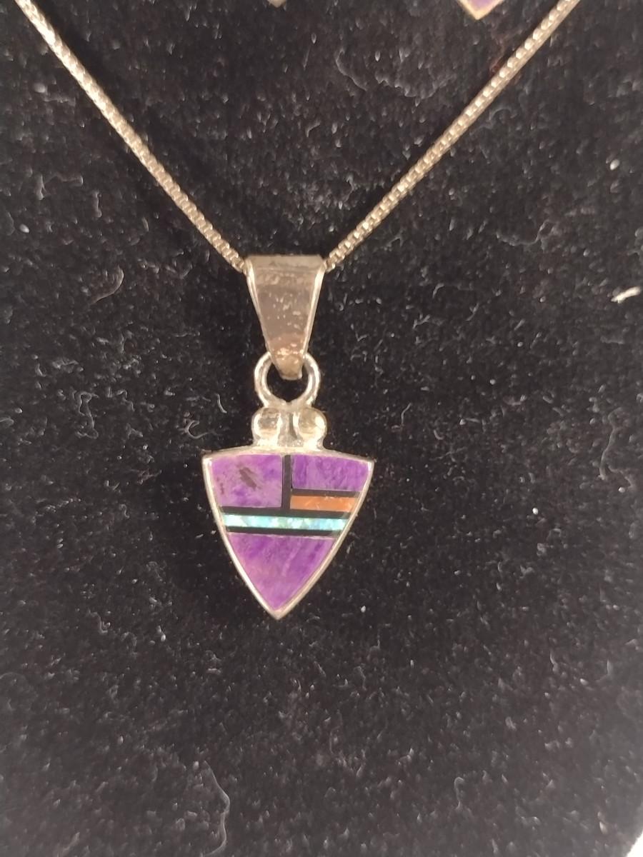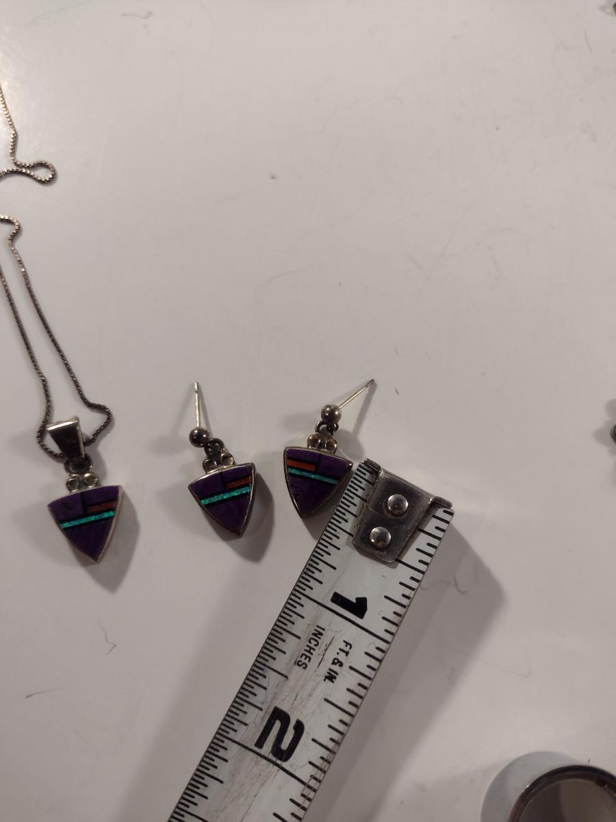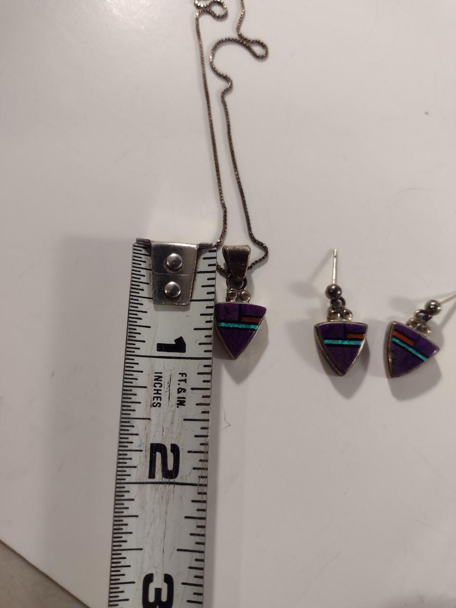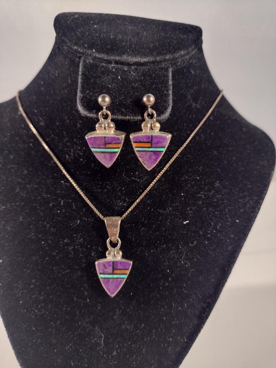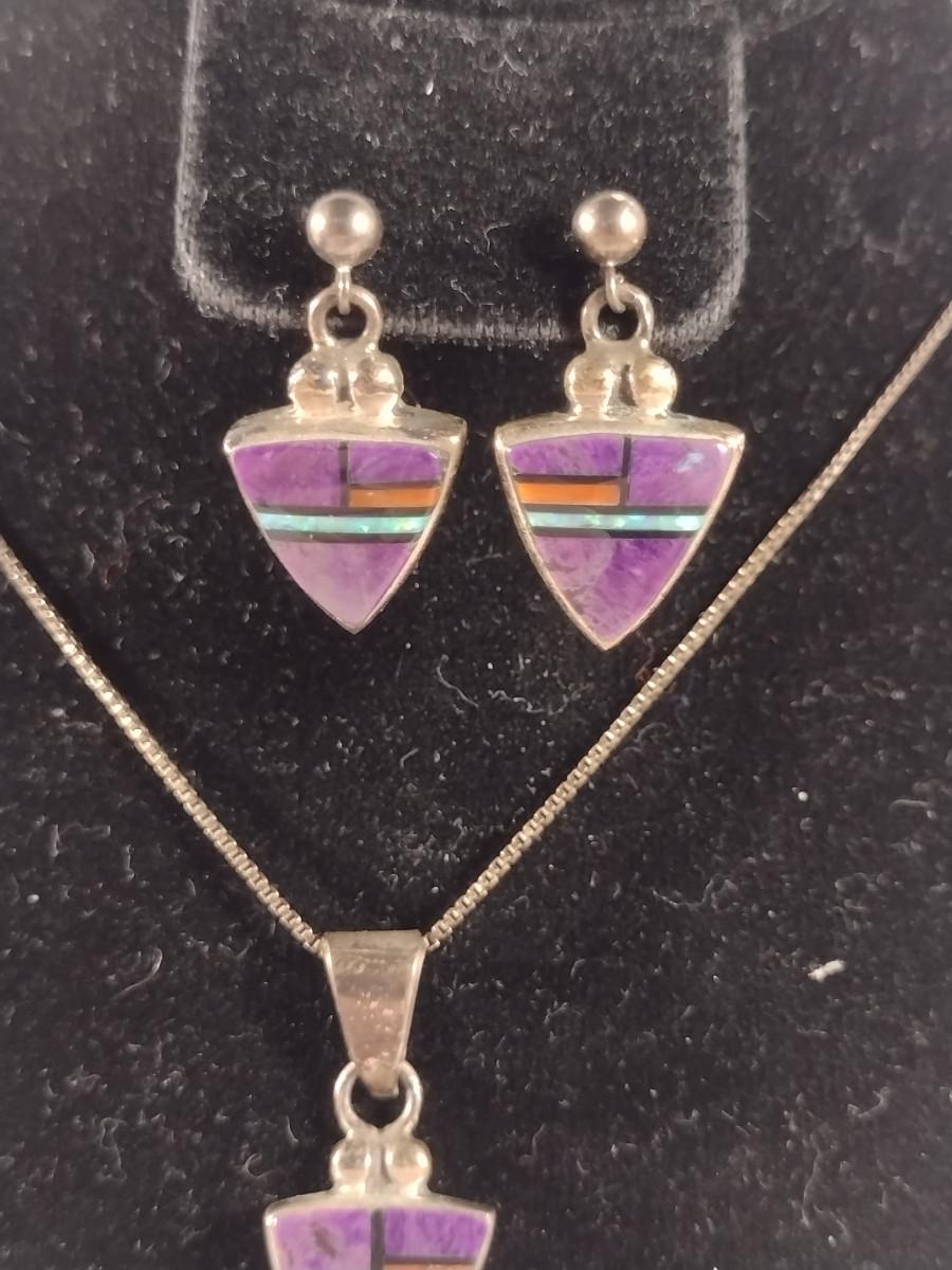 Inlaid Stone Pendant and Earring Set (T21). Signed and possibly sterling silver.