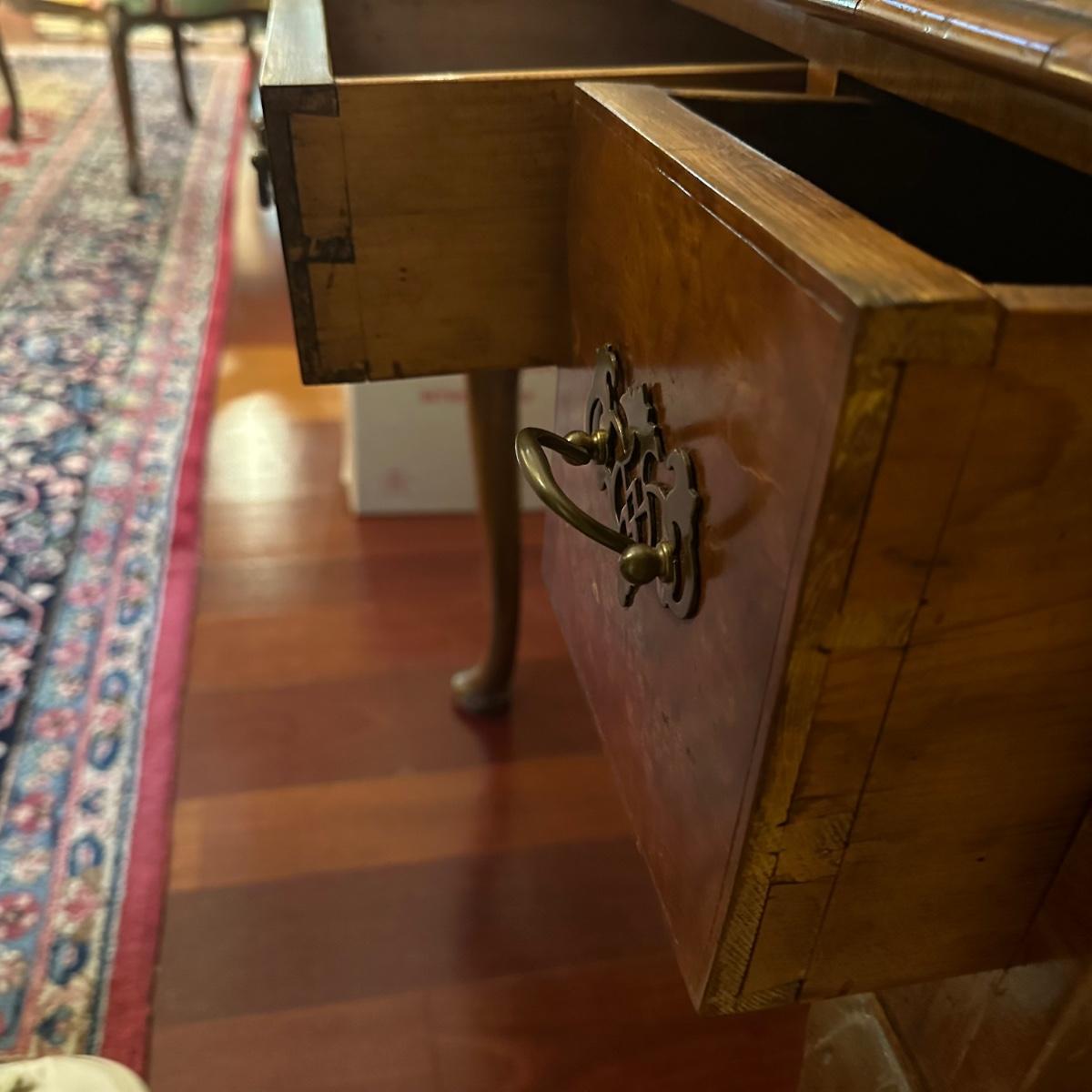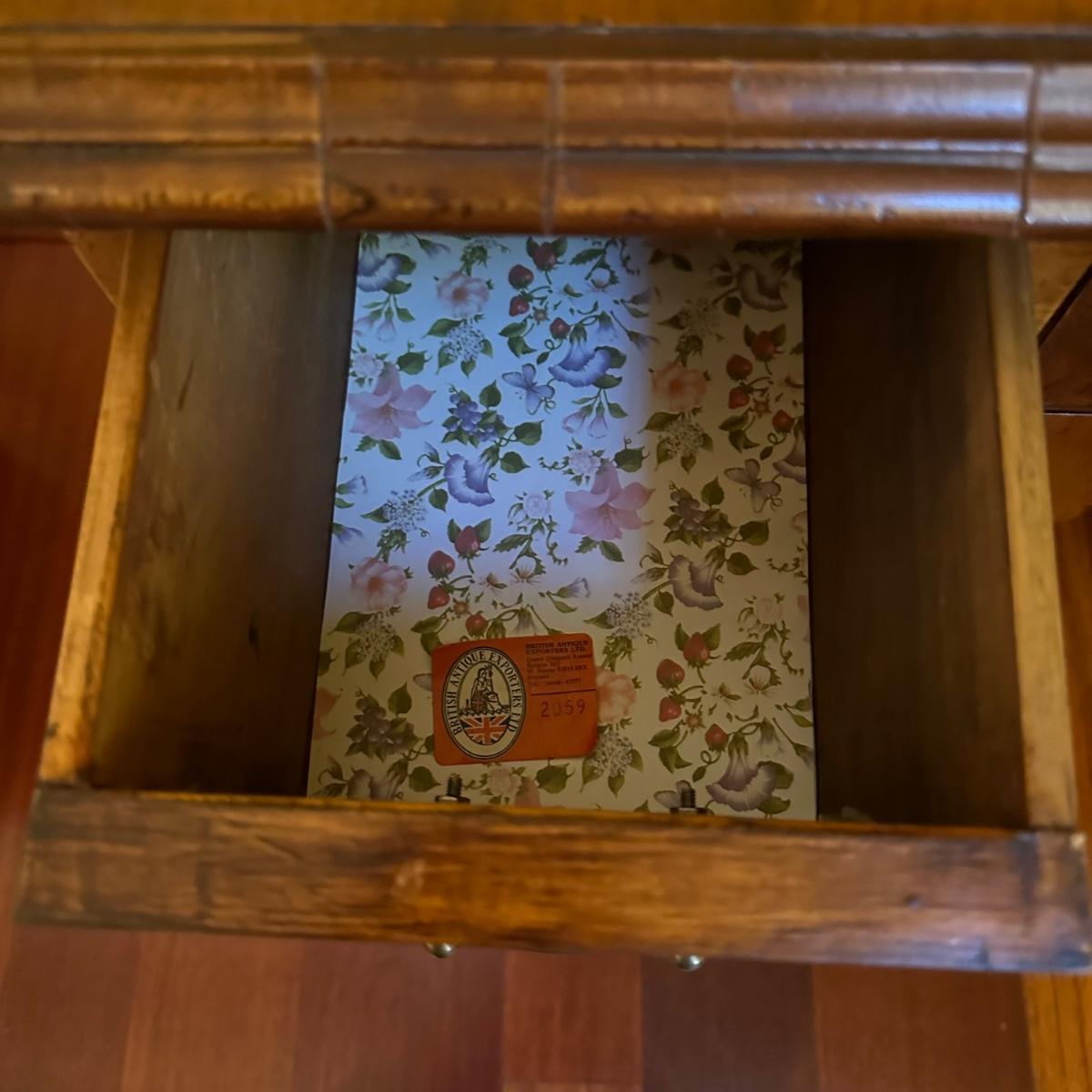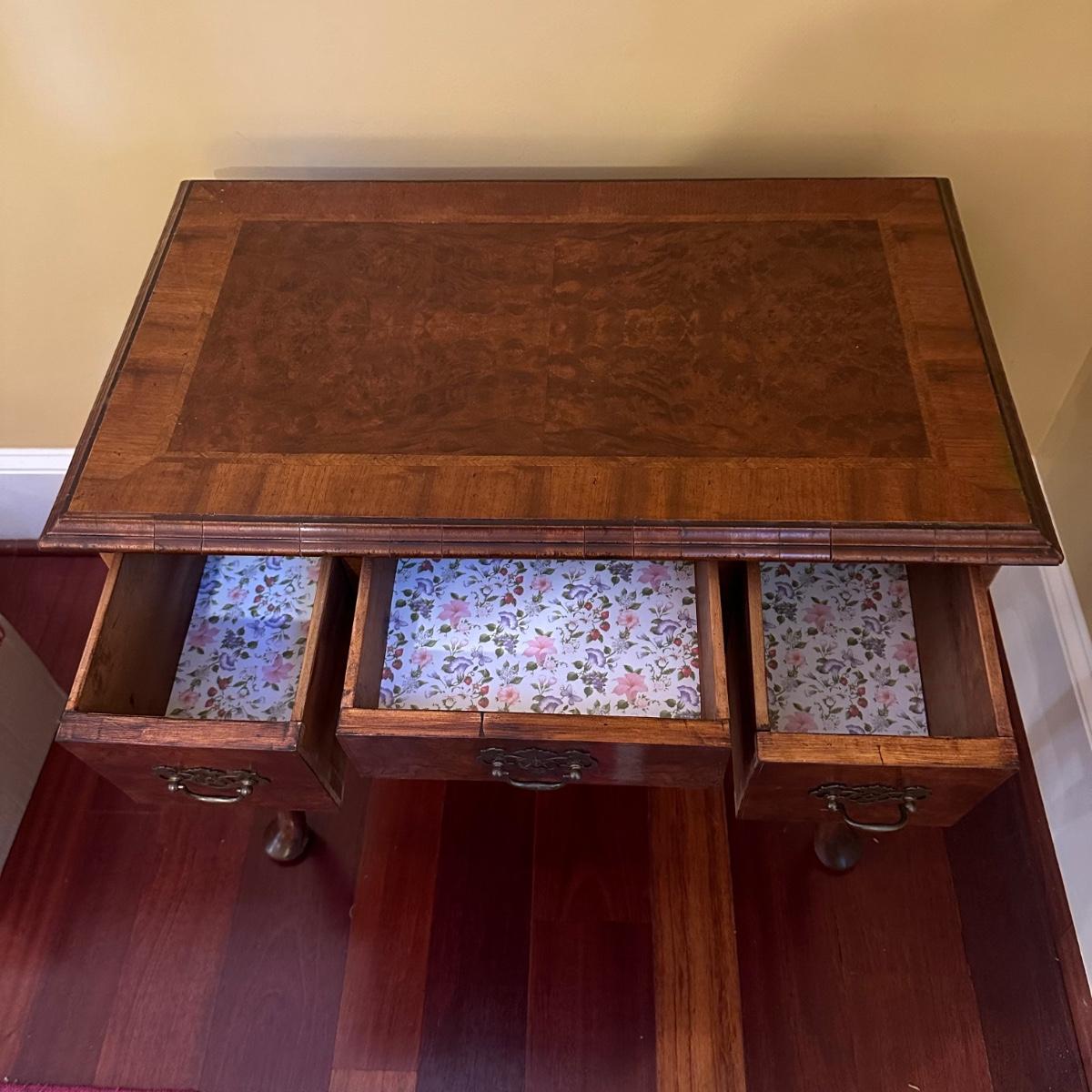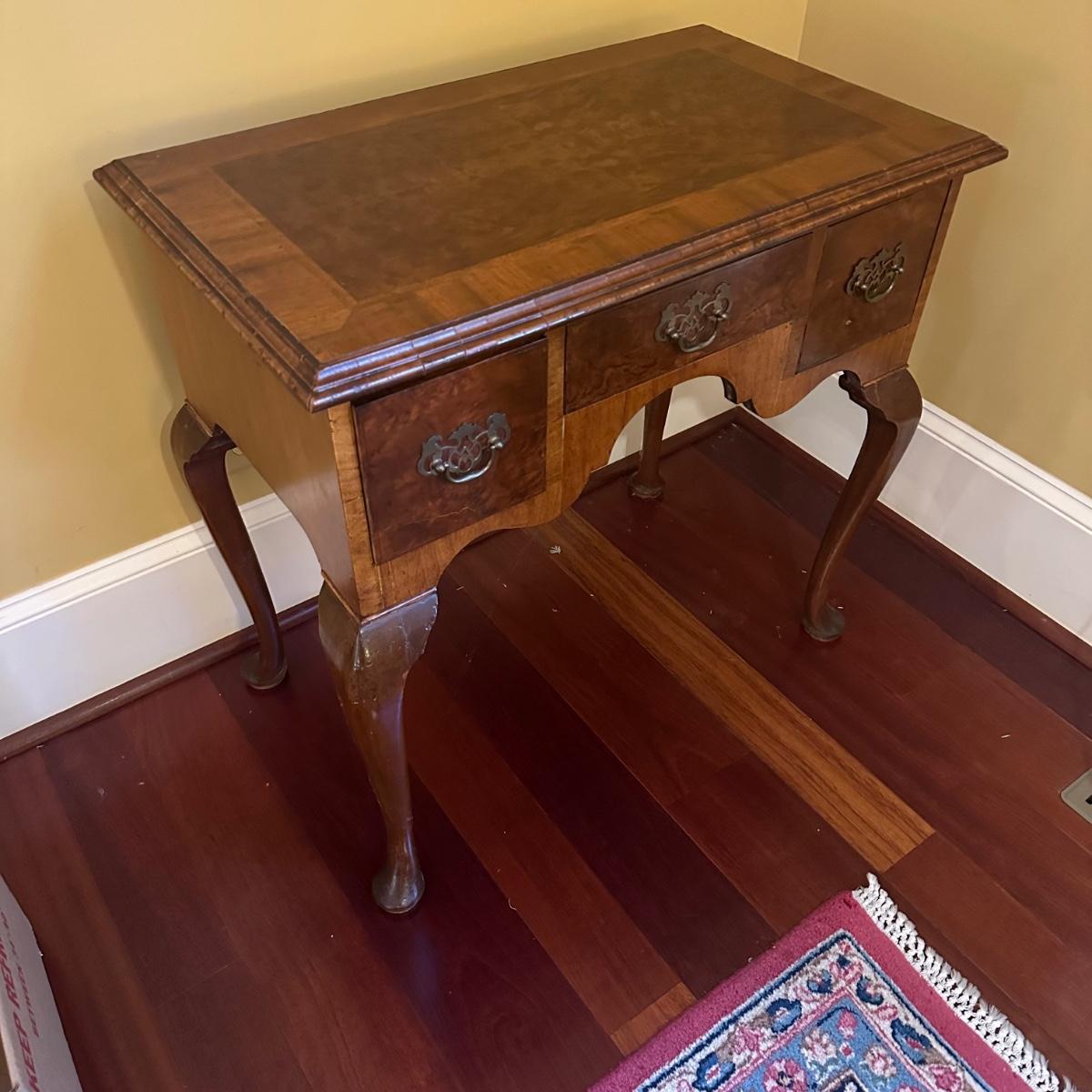 This solid wood with inlay three drawer table has a sticker - British Antique Exporters. Left drawer has a small piece of wood that need to be reattached that stops the drawer from closong too far. Drawers are dovetailed. Measures 31” x 18” x 29.5”H Local pickup only.