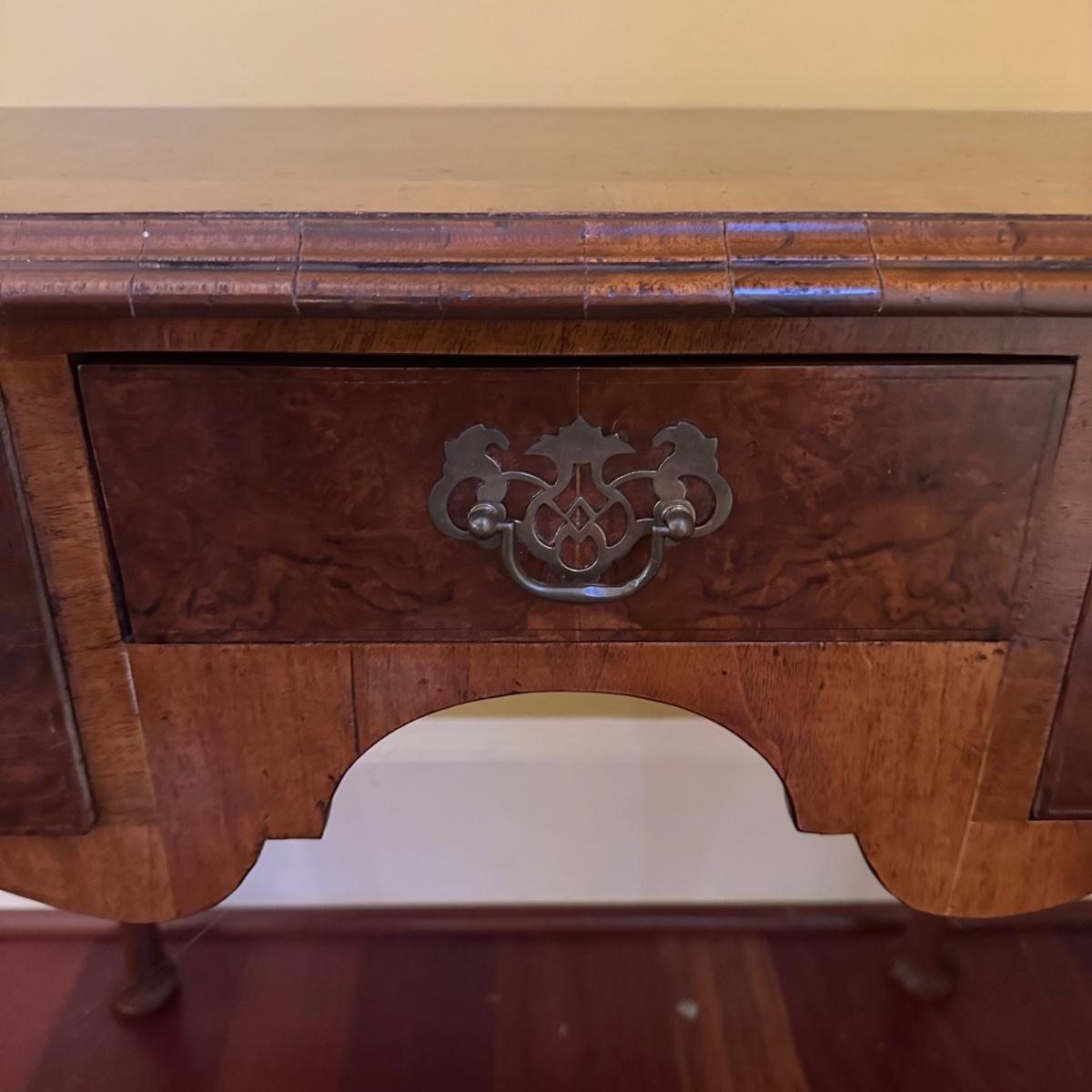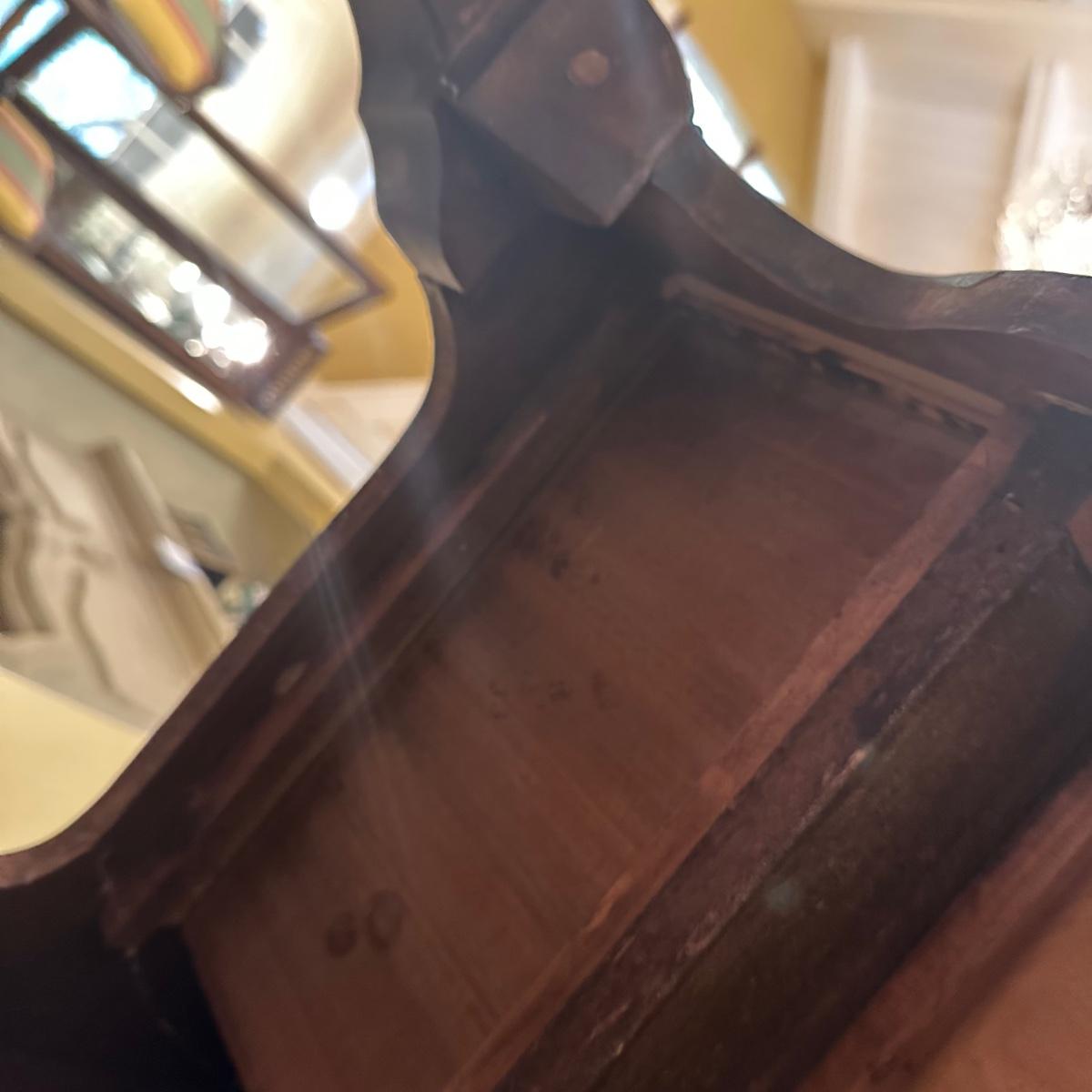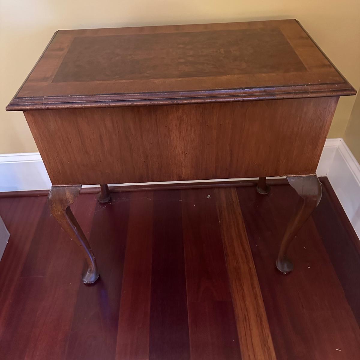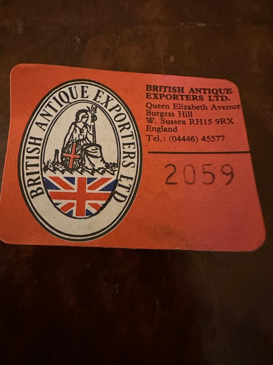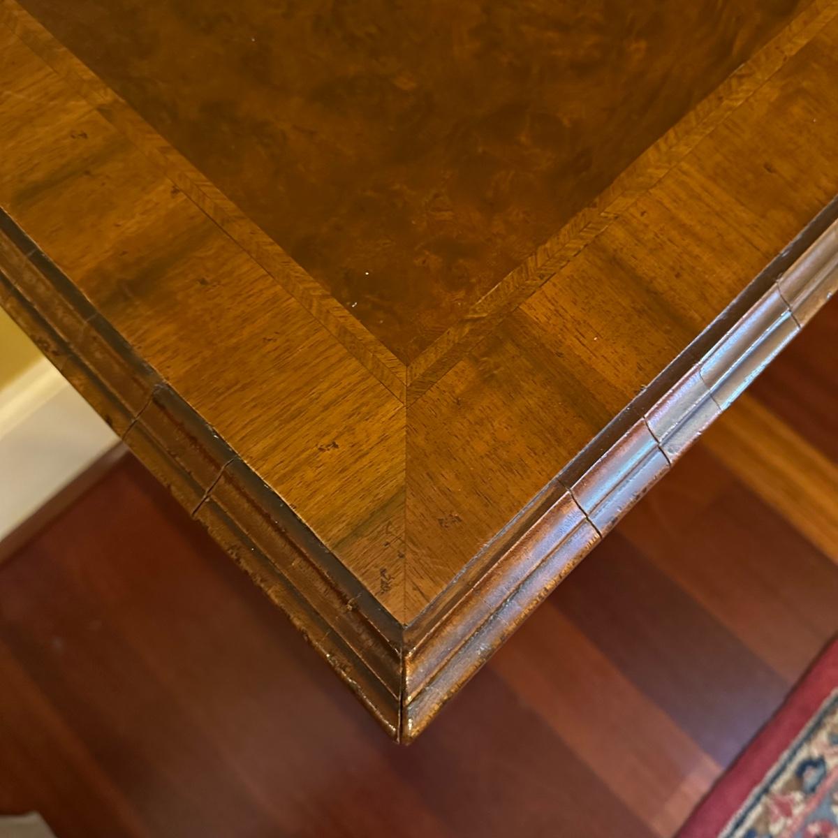 This solid wood with inlay three drawer table has a sticker - British Antique Exporters. Left drawer has a small piece of wood that need to be reattached that stops the drawer from closong too far. Drawers are dovetailed. Measures 31” x 18” x 29.5”H Local pickup only.