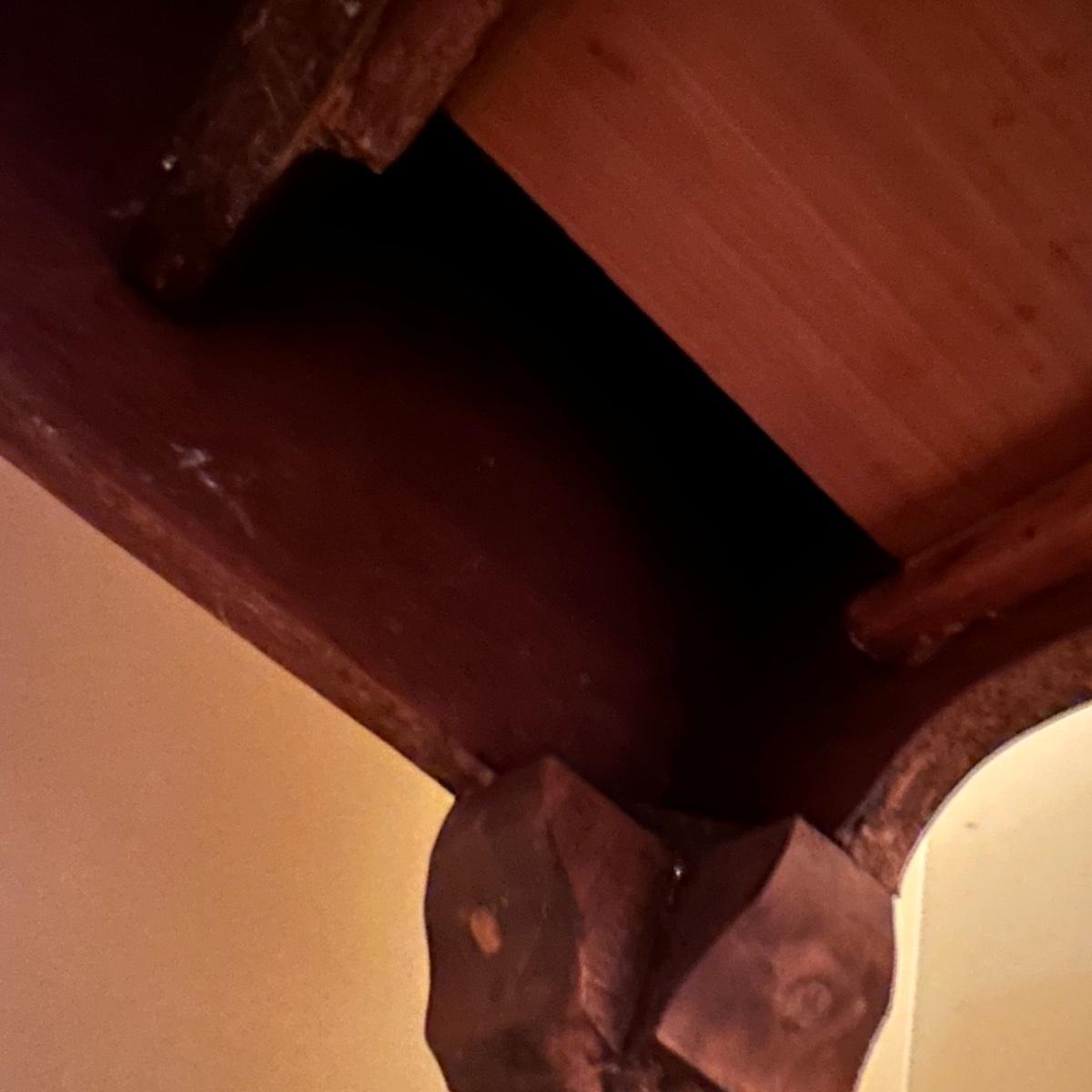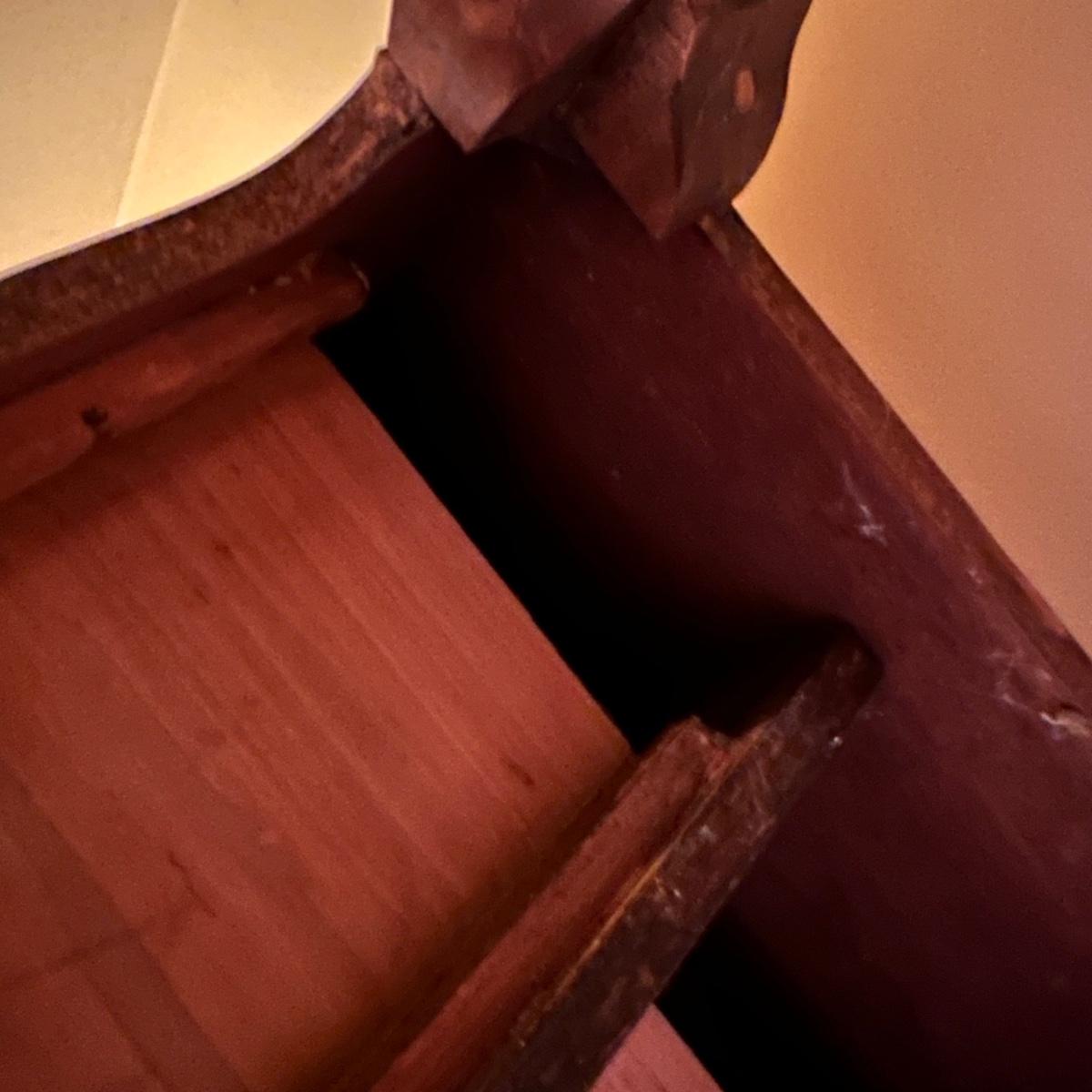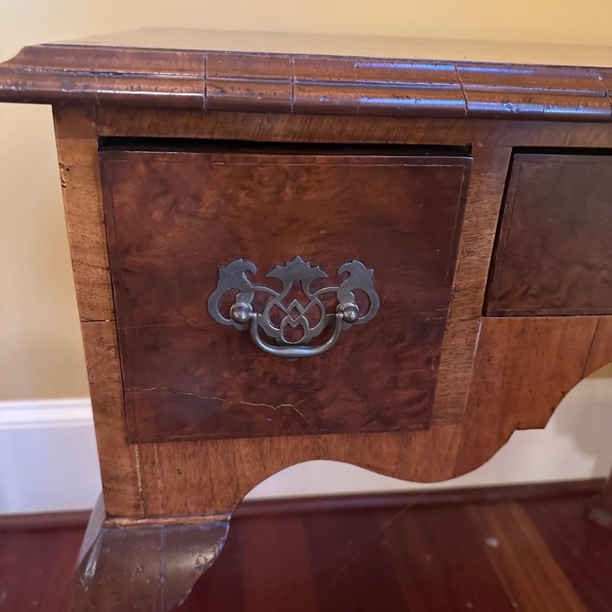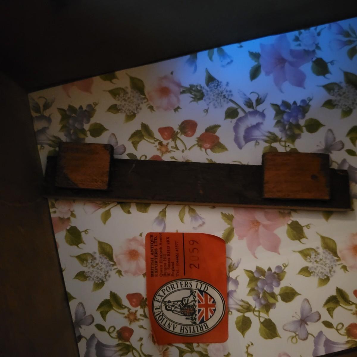This solid wood with inlay three drawer table has a sticker - British Antique Exporters. Left drawer has a small piece of wood that need to be reattached that stops the drawer from closong too far. Drawers are dovetailed. Measures 31” x 18” x 29.5”H Local pickup only.