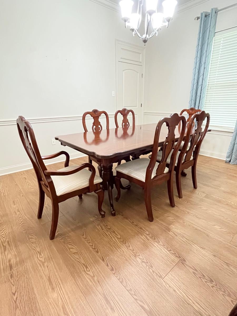 No Brand ~ Set Includes = Table as shown with one 12” leaf 30” H x 78” W x 42” D & has additional 12” leaf ~ (4) Chairs 42” H x 21” W x 19” D Seat 18” H ~ (2) Captain Chairs 42” H x 21” W x 19” D Seat 18” H