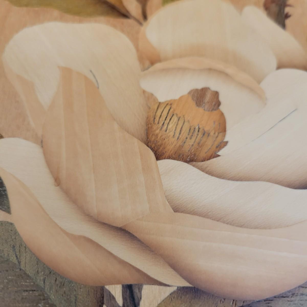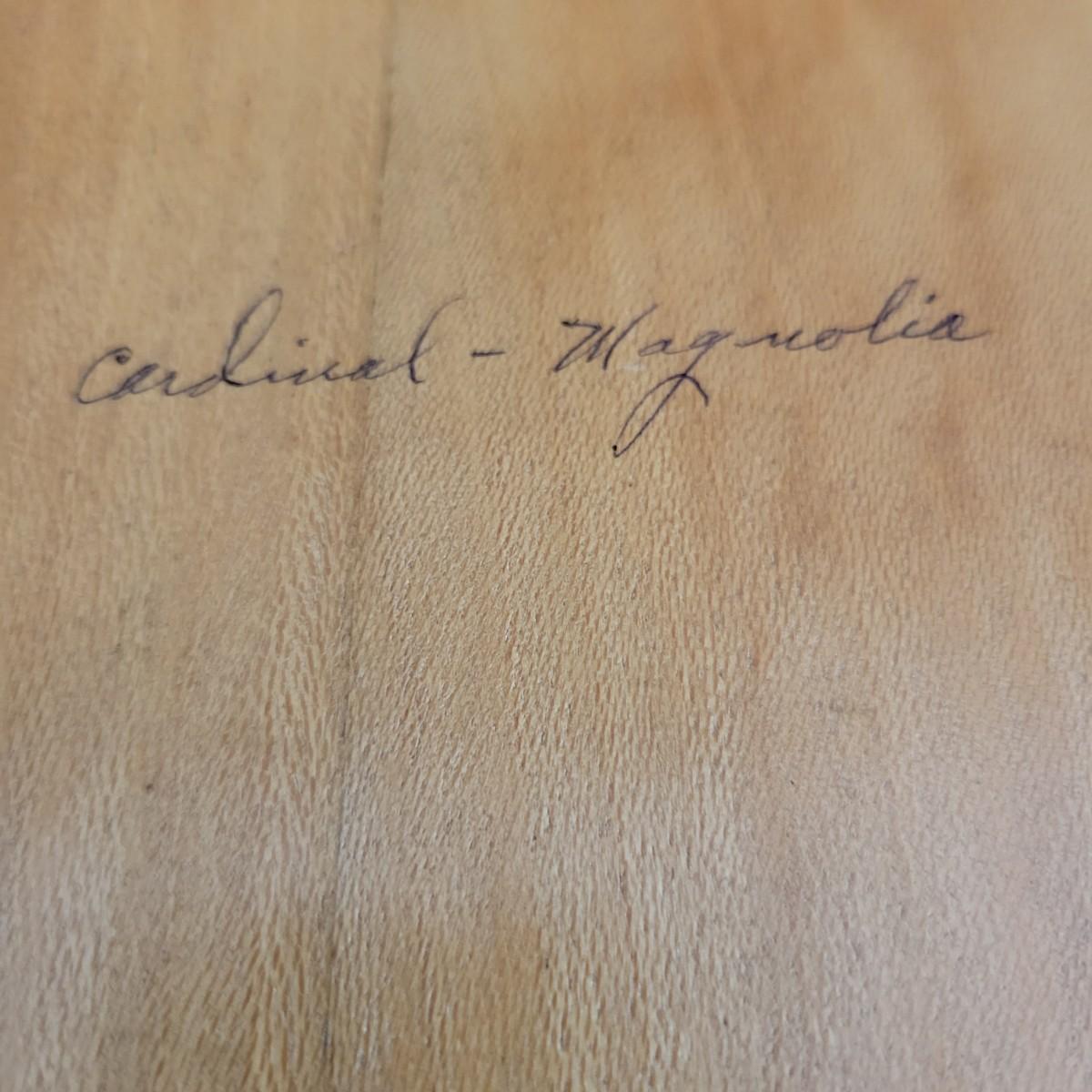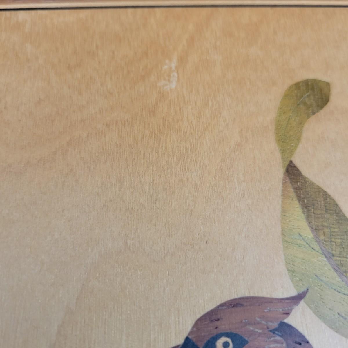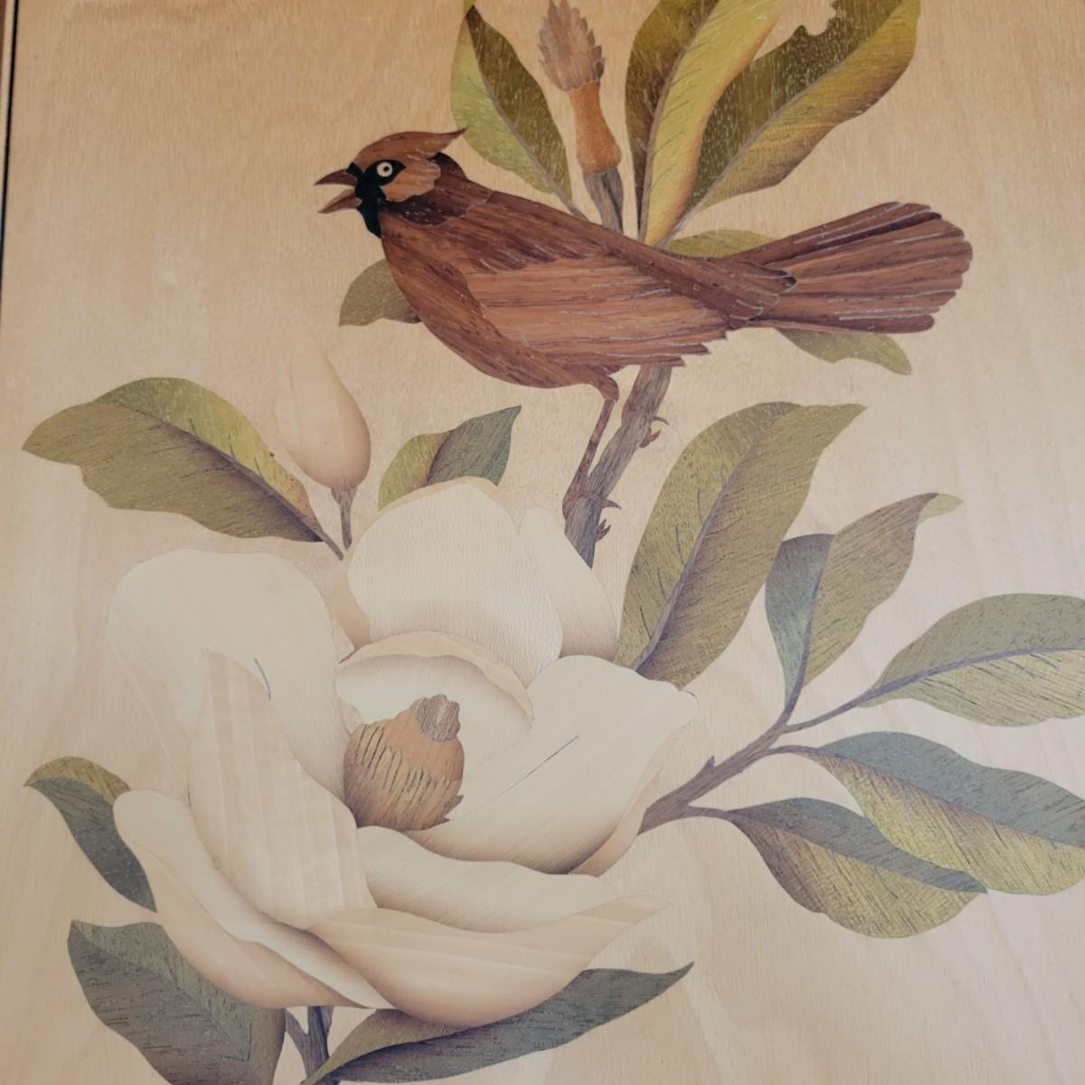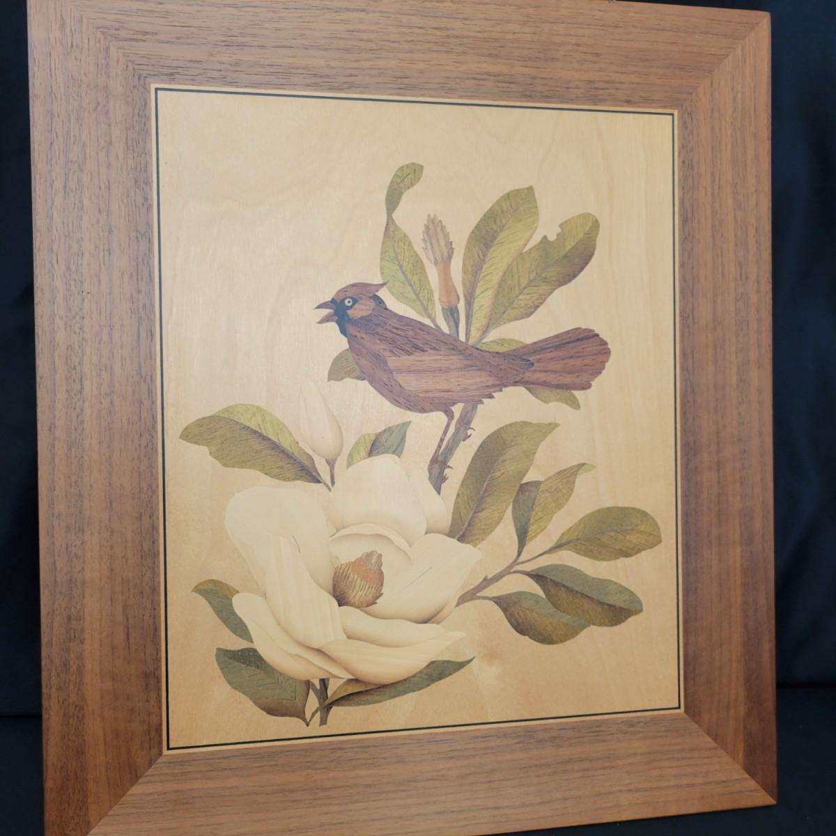 An exquisite piece of inlaid wood art in good condition with a few minor blemishes. This piece was titled Cardinal-Magnolia and signed Charlie Link of Brevard, NC that features a magnolia and cardinal made from different inlaid wood pieces. Piece measures approximately 14.5" x 16.5" x 1". Shipping available. Shipping can be costly. We suggest calling our local UPS with dimensions and getting an estimate before bidding: (828) 252-6930