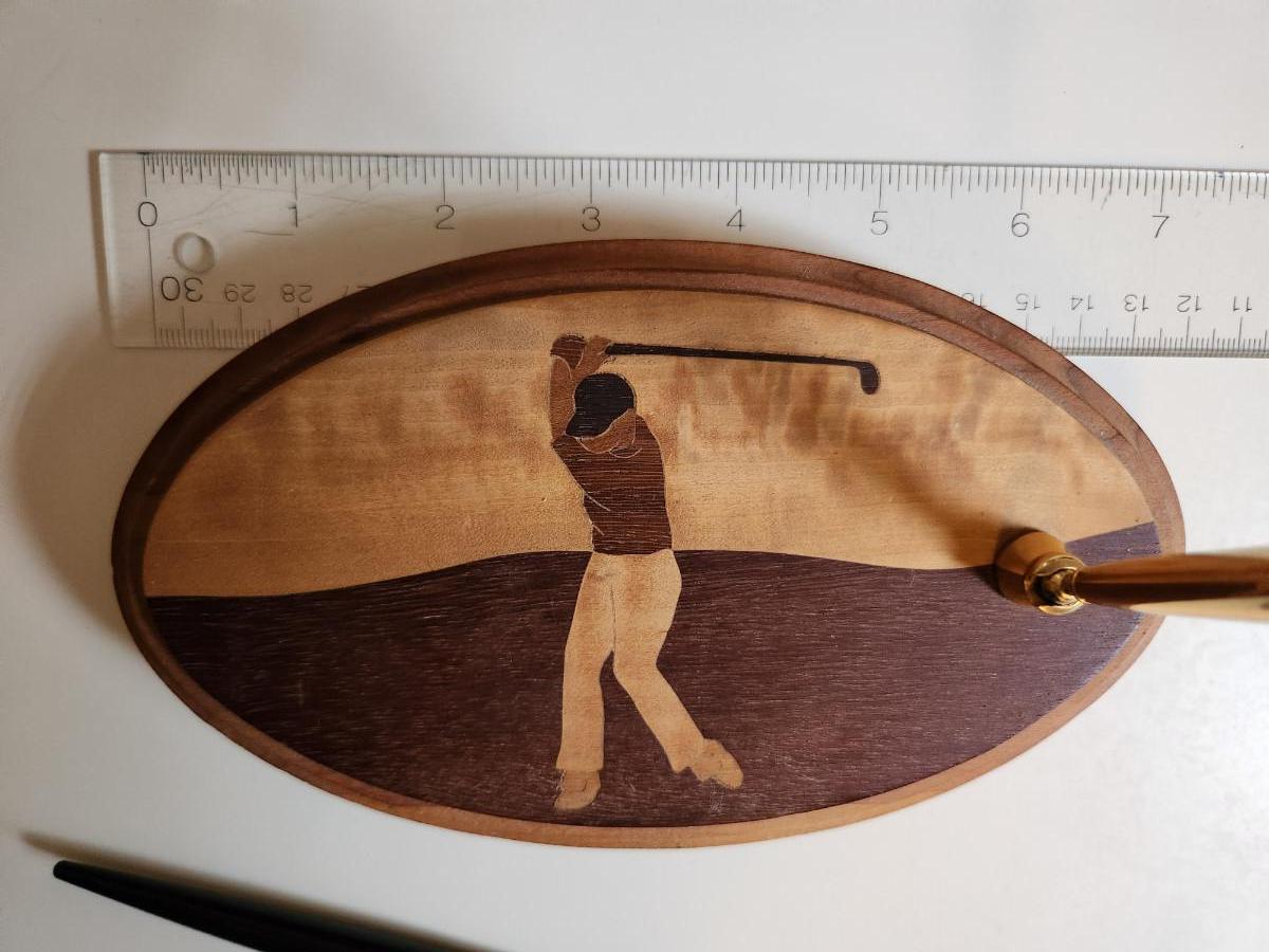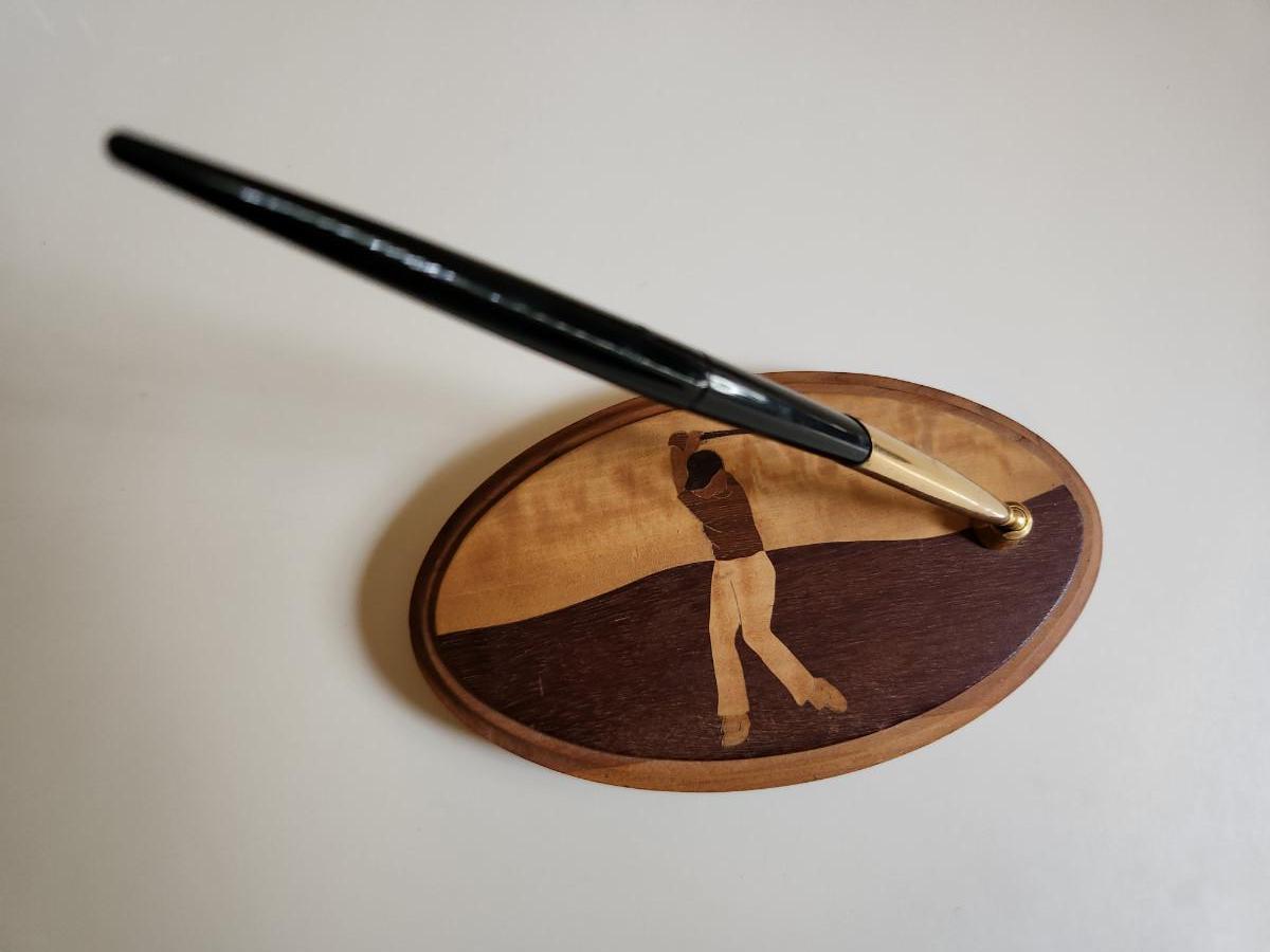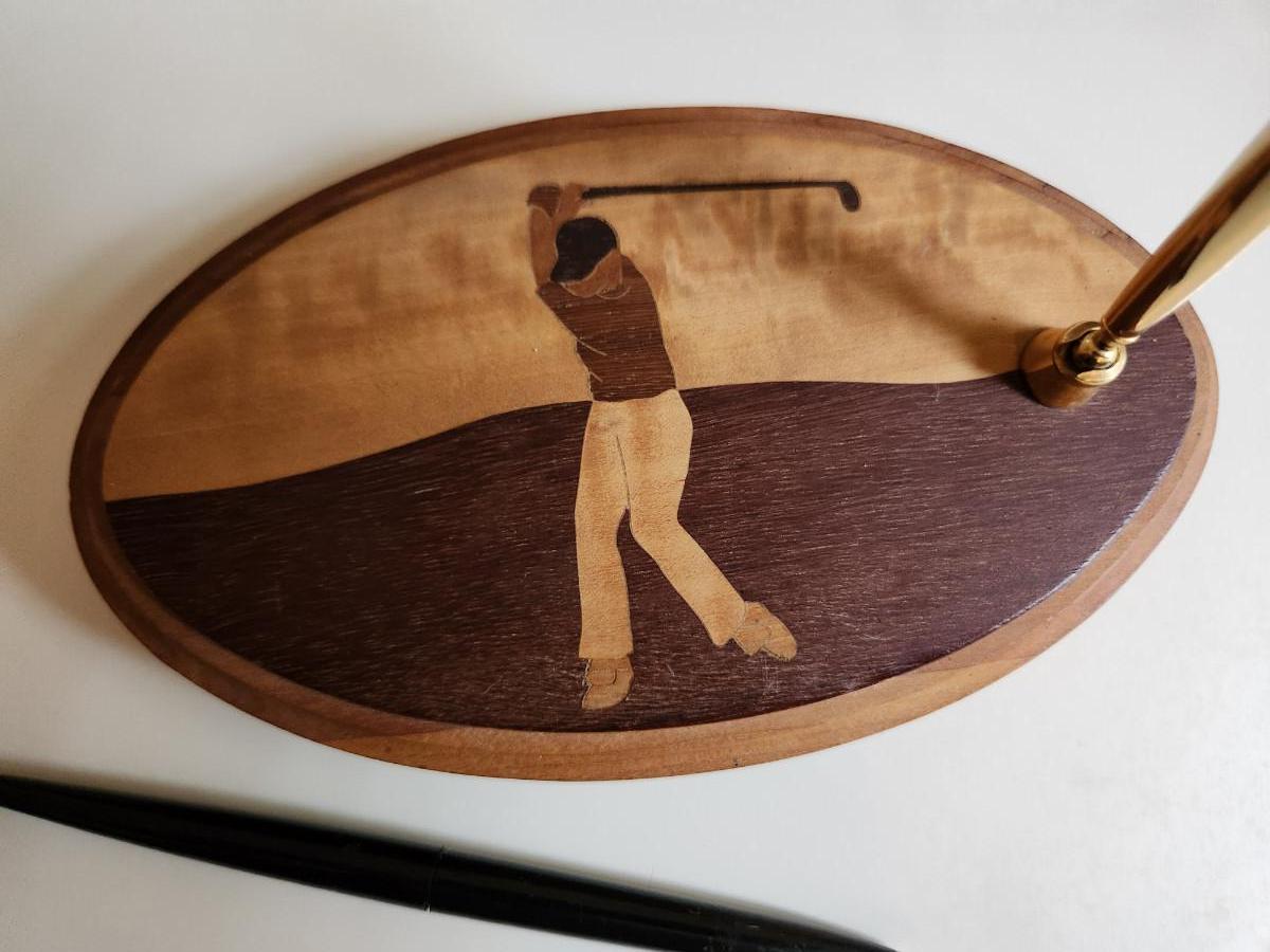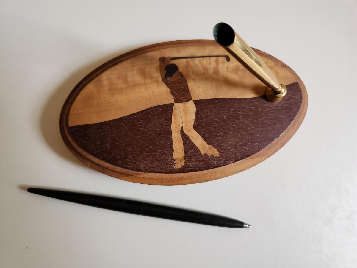 This auction lot is for an Inlaid Wood Golf Desk Pen. This handsome, hand-made desk pen is just the gift for that golfing dude in your life. Measures about 8-inches by 4-inches oval. The pen works - a classy find for the right guy.