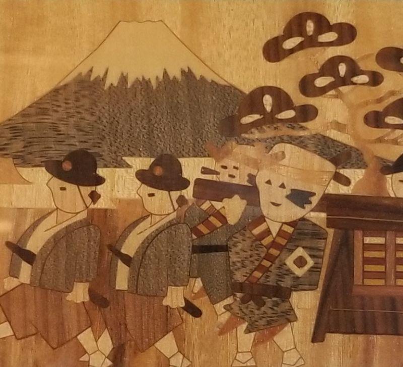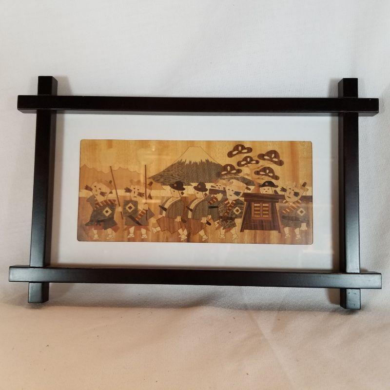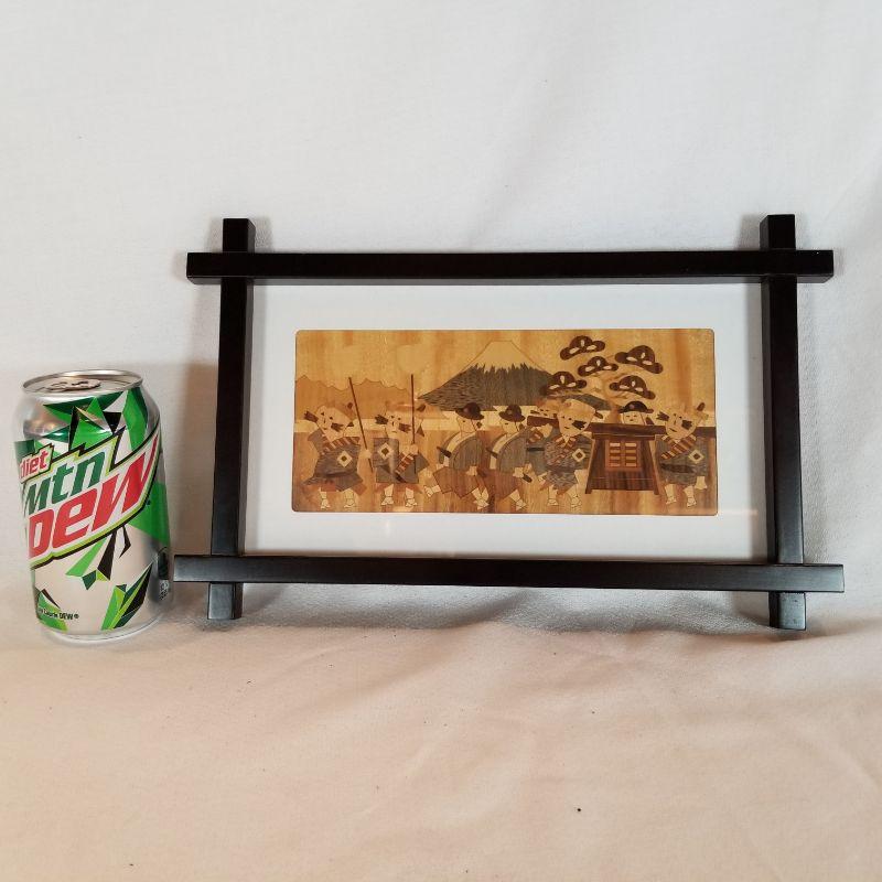 This handsome small piece is a Inlaid Wood art picture of an Asian them. Beautiful hand work, framed nicely. Overall size is 13-inches wide X 8-inches tall. A real nice example of this type of art.