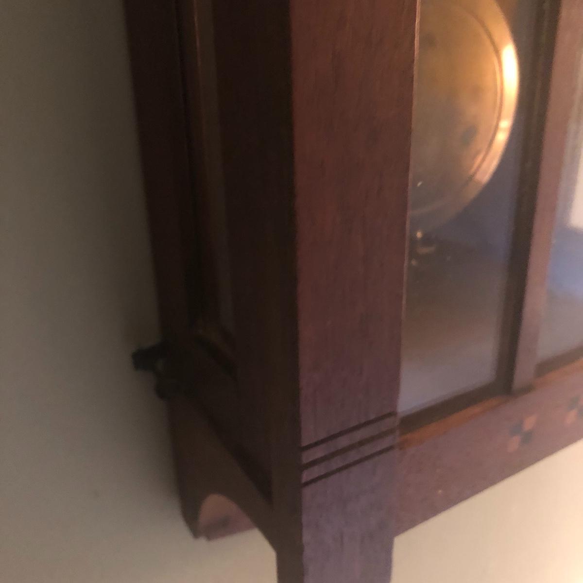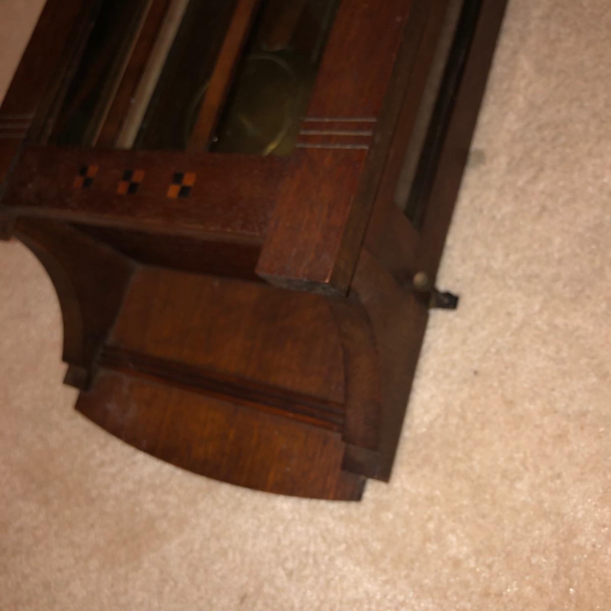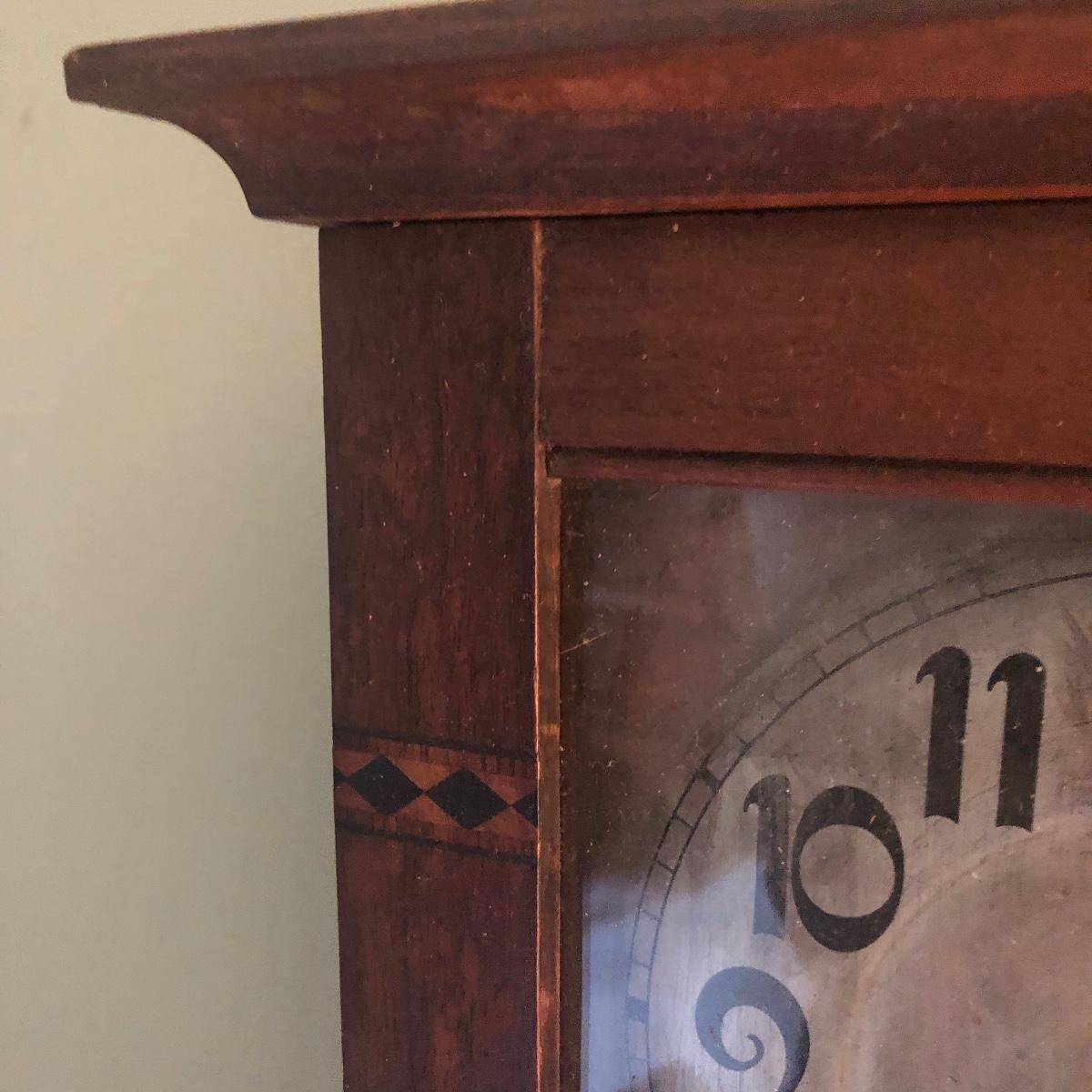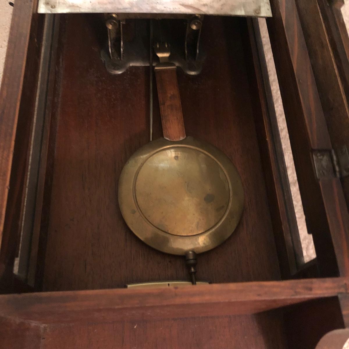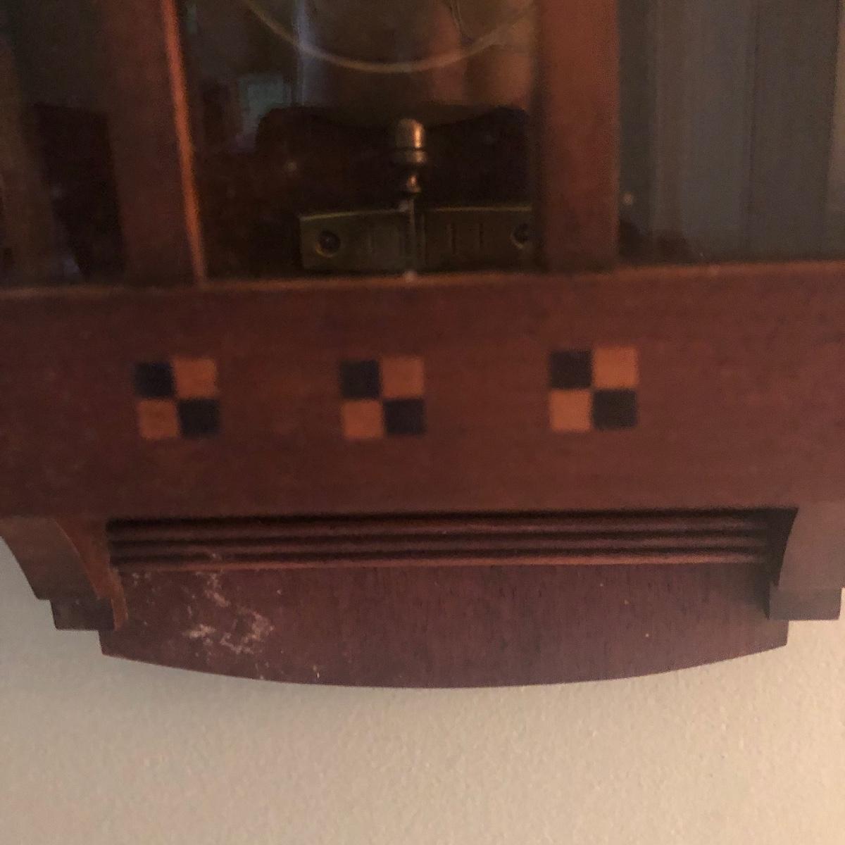 Note the inlaid wood on this clock. The clock measures 10.5”x 5“ x 21”. The pendulum swings freely yet there is no key to rewind the clock. Note the “1042” inscription on the back of clock. Local pick up only.