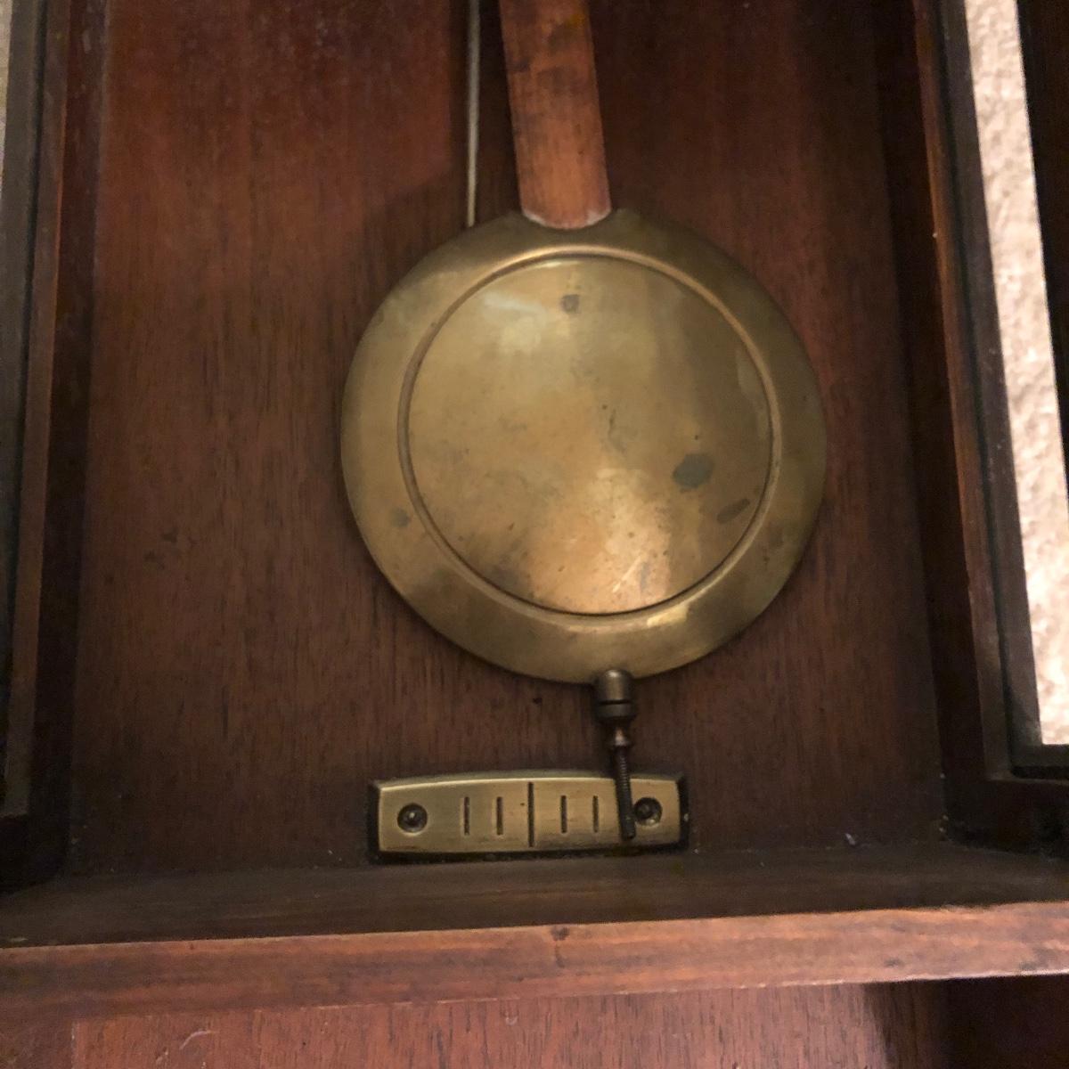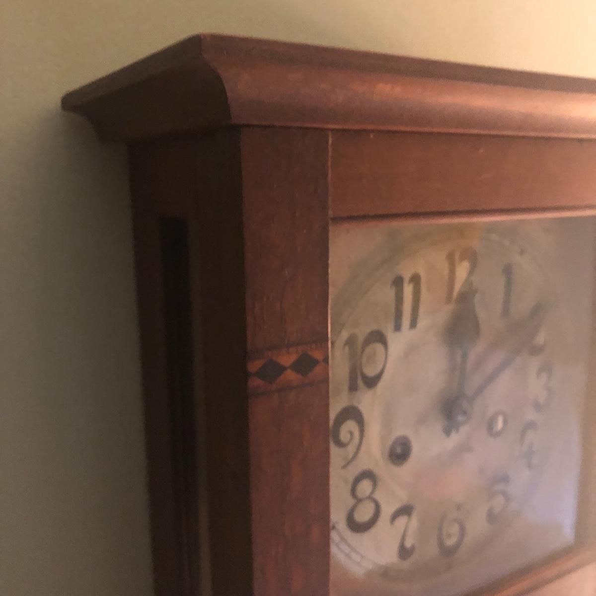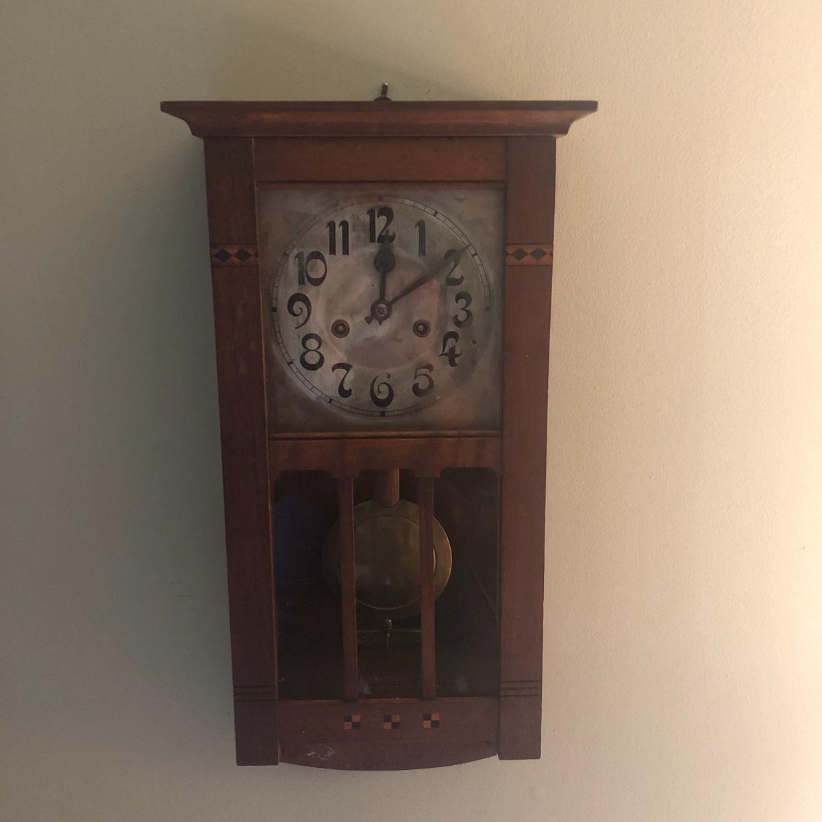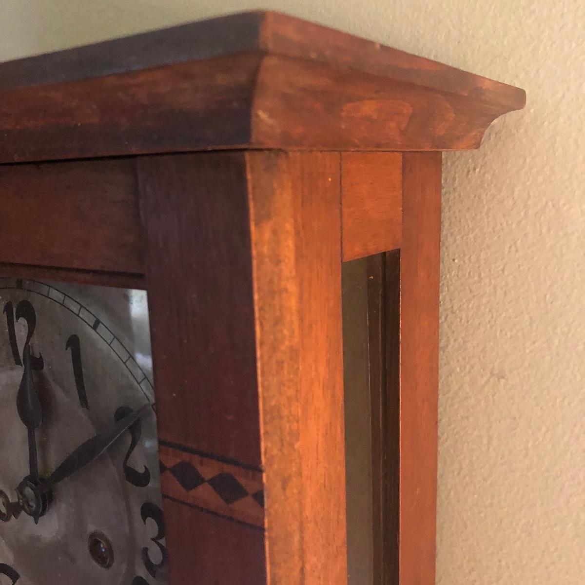 Note the inlaid wood on this clock. The clock measures 10.5”x 5“ x 21”. The pendulum swings freely yet there is no key to rewind the clock. Note the “1042” inscription on the back of clock. Local pick up only.