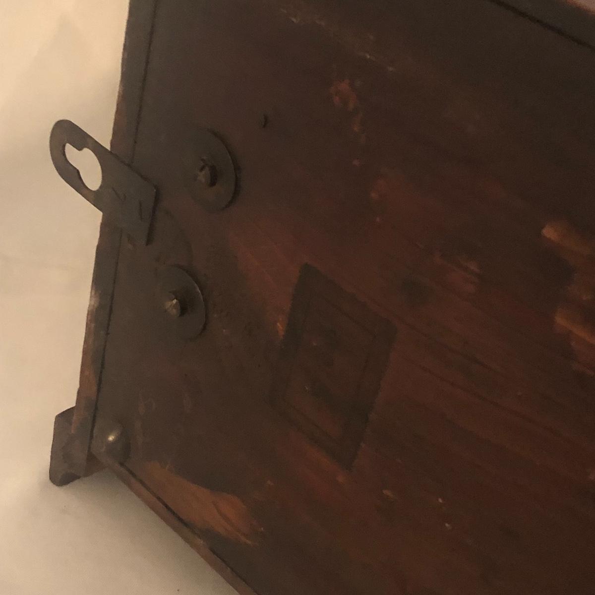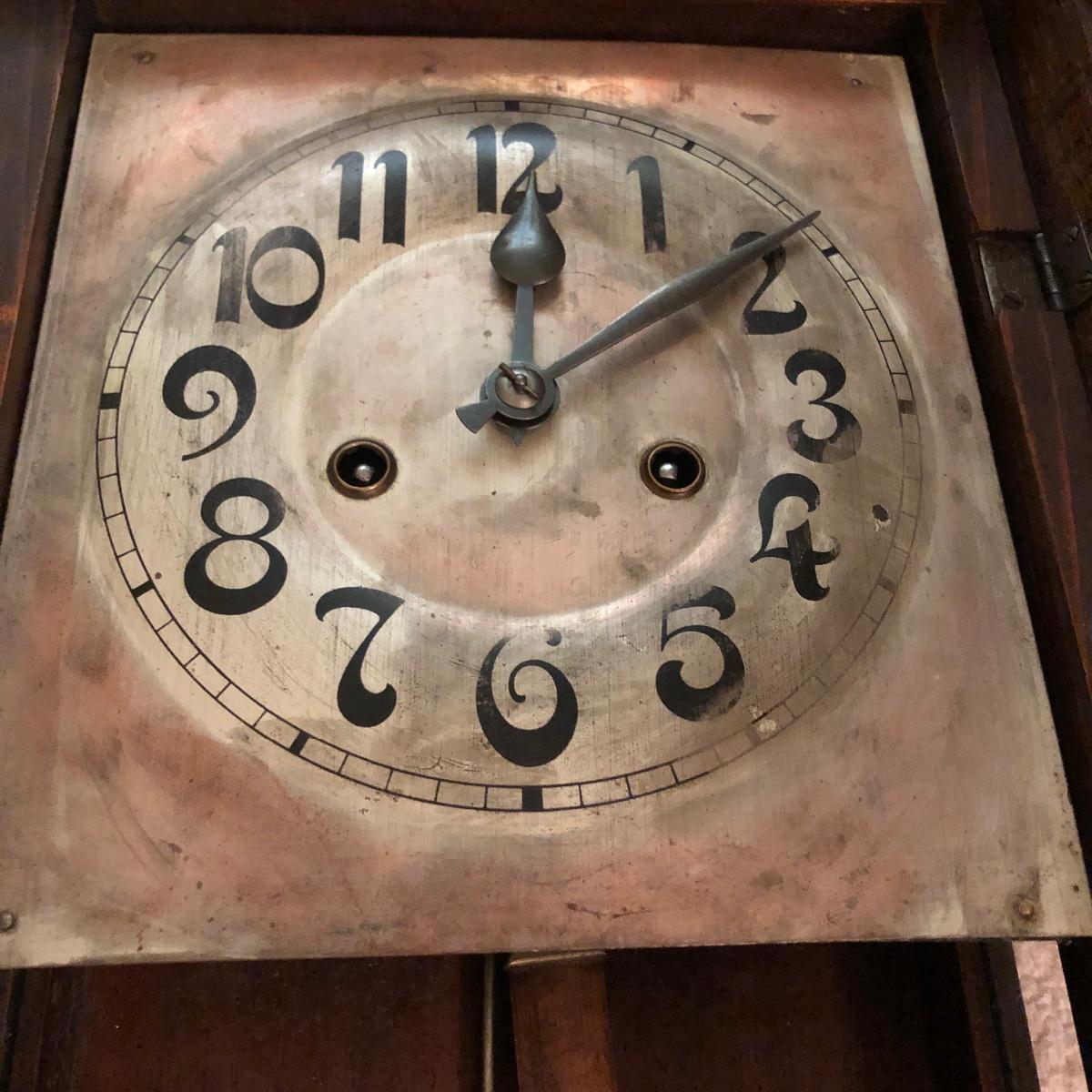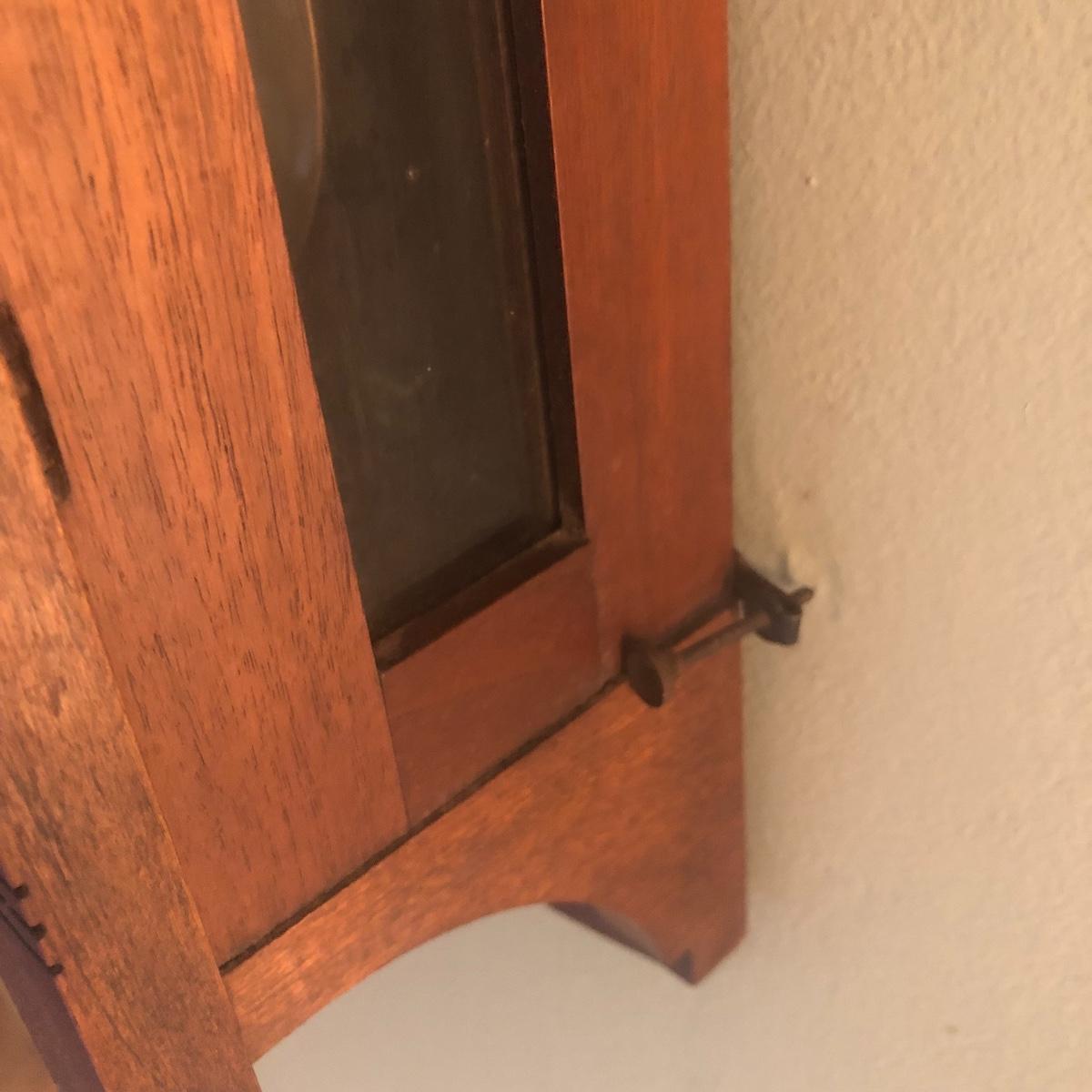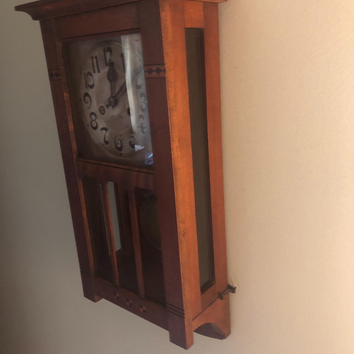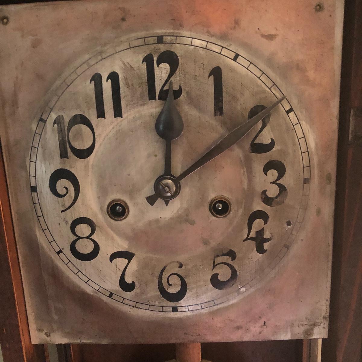 Note the inlaid wood on this clock. The clock measures 10.5”x 5“ x 21”. The pendulum swings freely yet there is no key to rewind the clock. Note the “1042” inscription on the back of clock. Local pick up only.