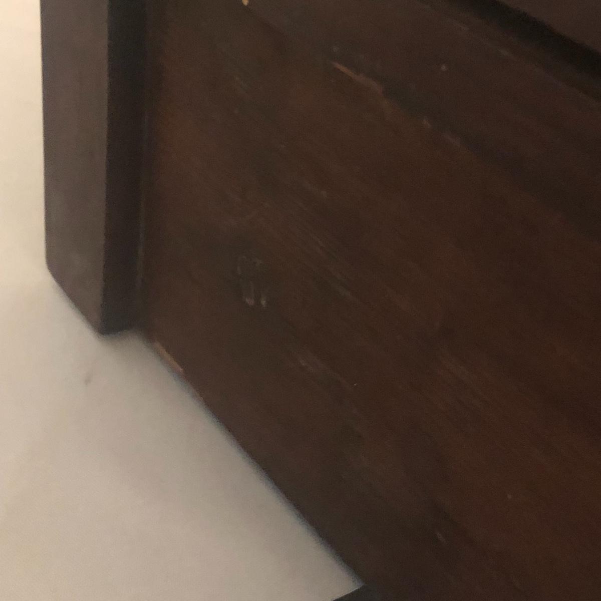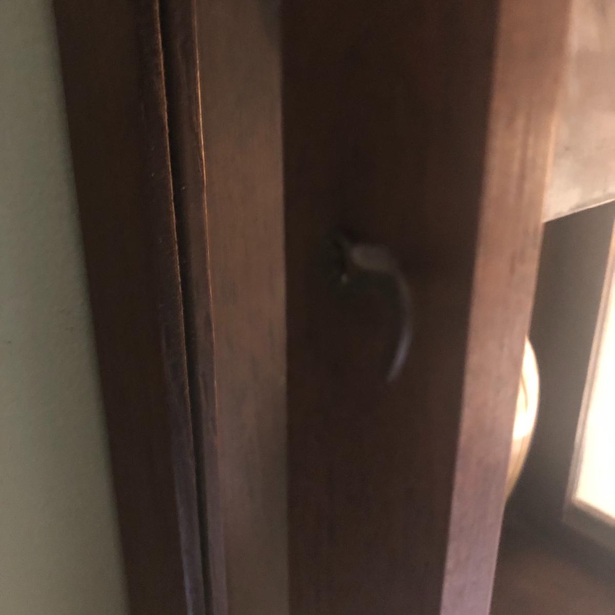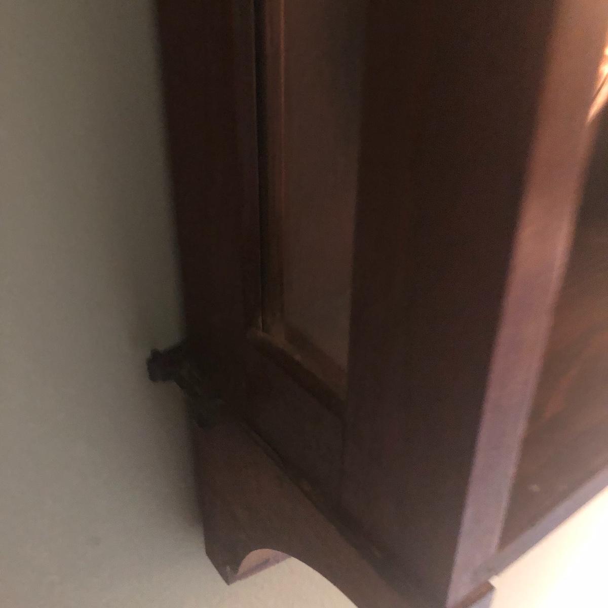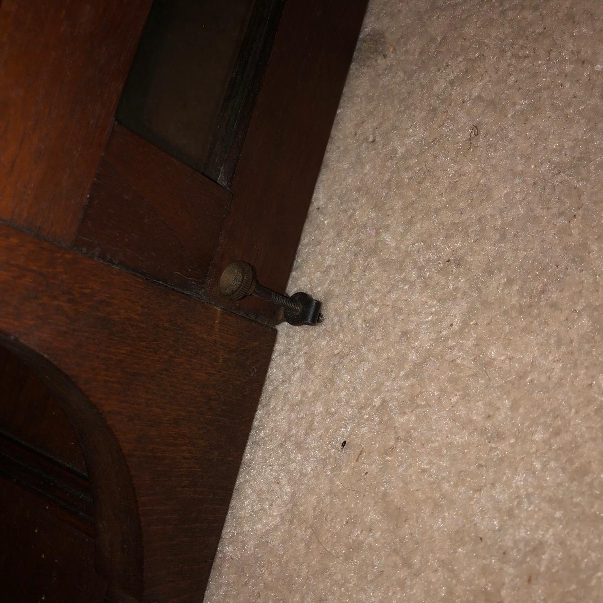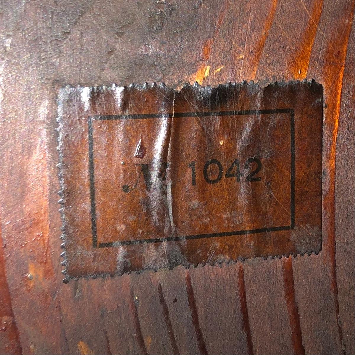 Note the inlaid wood on this clock. The clock measures 10.5”x 5“ x 21”. The pendulum swings freely yet there is no key to rewind the clock. Note the “1042” inscription on the back of clock. Local pick up only.