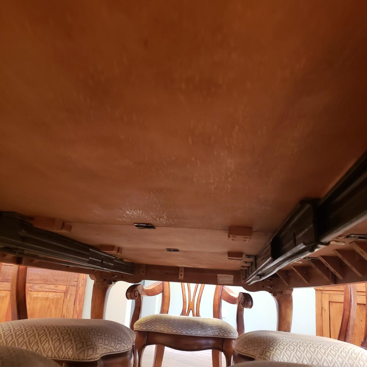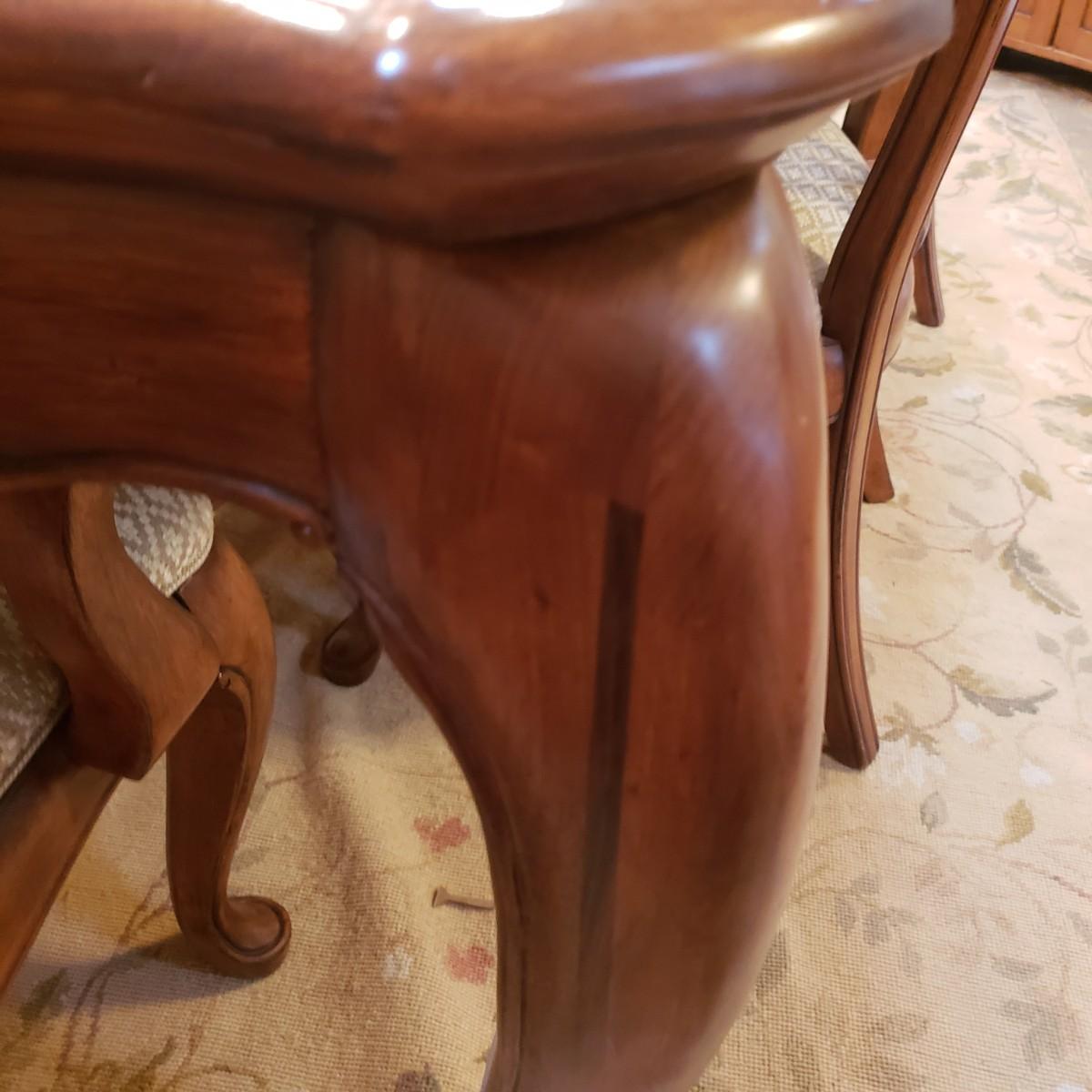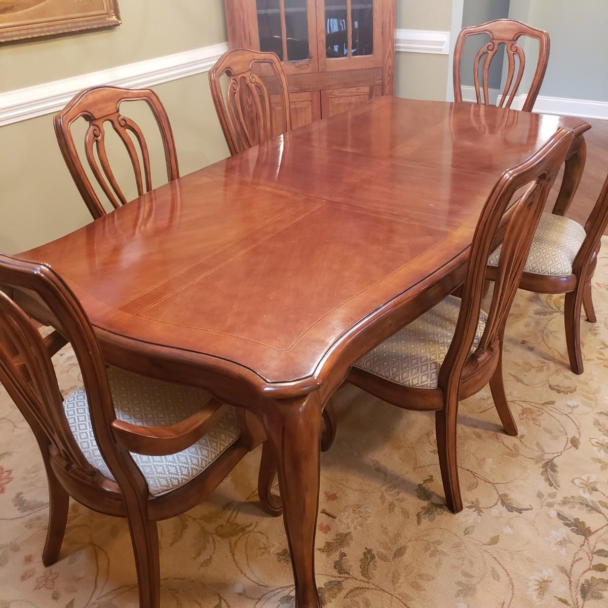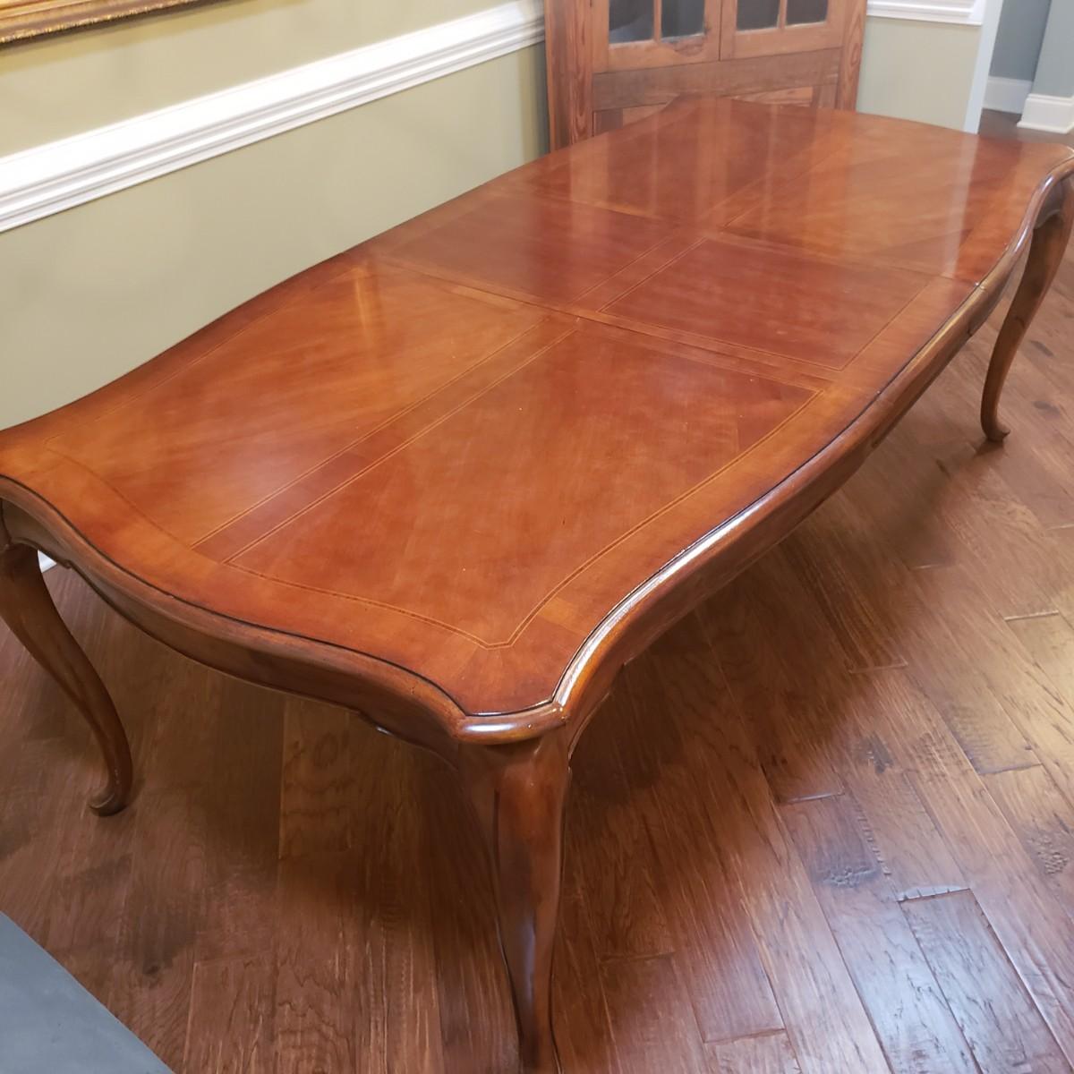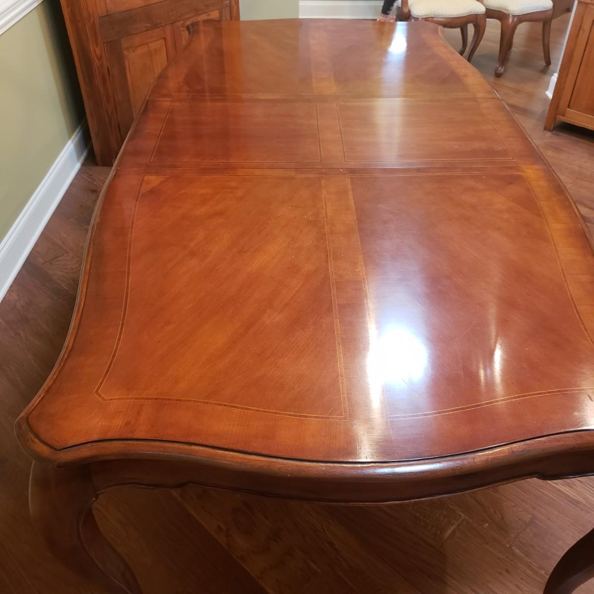 This gorgeous inlay dining table comes with two leaves and six dining chairs. The table with one leaf, as pictured measures 90" x 44" x 30" H. Each leaf alone measures 18" x 44". The seller states that the set was purchased from Punkett North Brooke. There are some blemishes, such as creases where the veneer is raised and one spot, see picture. These small creases were hard to photograph due to sky lights casting glares.