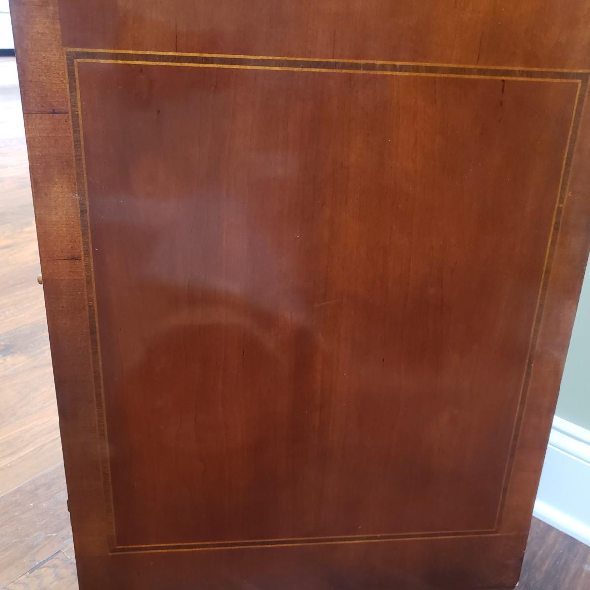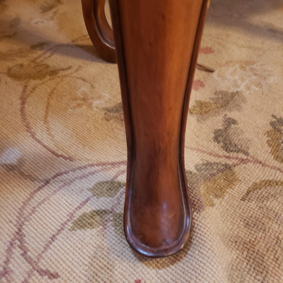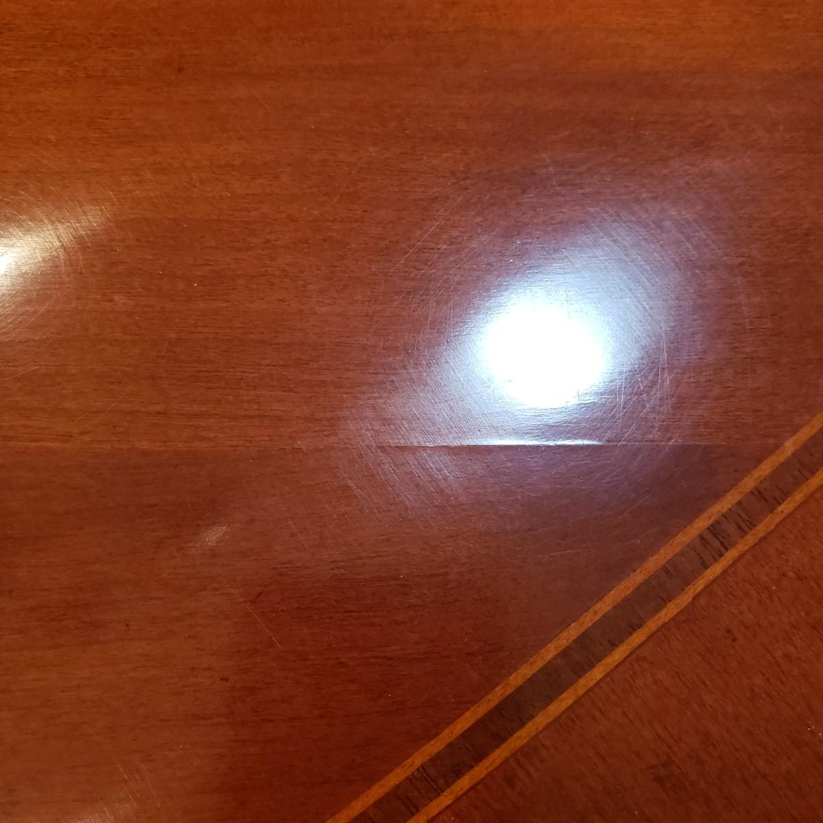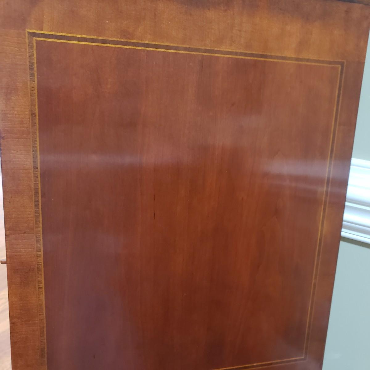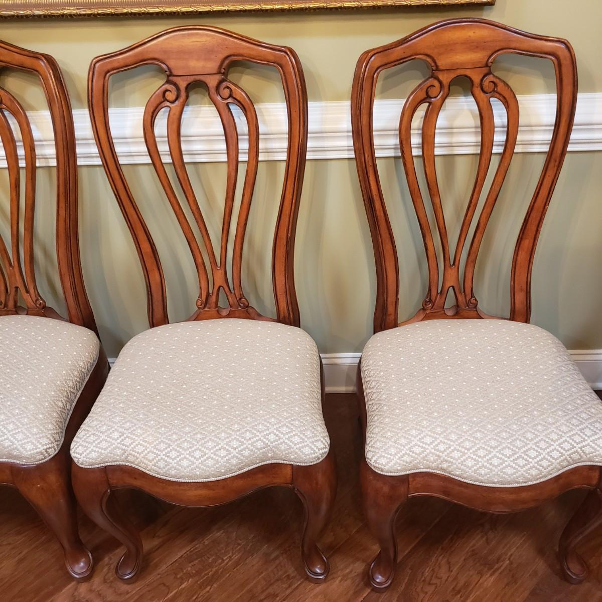This gorgeous inlay dining table comes with two leaves and six dining chairs. The table with one leaf, as pictured measures 90" x 44" x 30" H. Each leaf alone measures 18" x 44". The seller states that the set was purchased from Punkett North Brooke. There are some blemishes, such as creases where the veneer is raised and one spot, see picture. These small creases were hard to photograph due to sky lights casting glares.