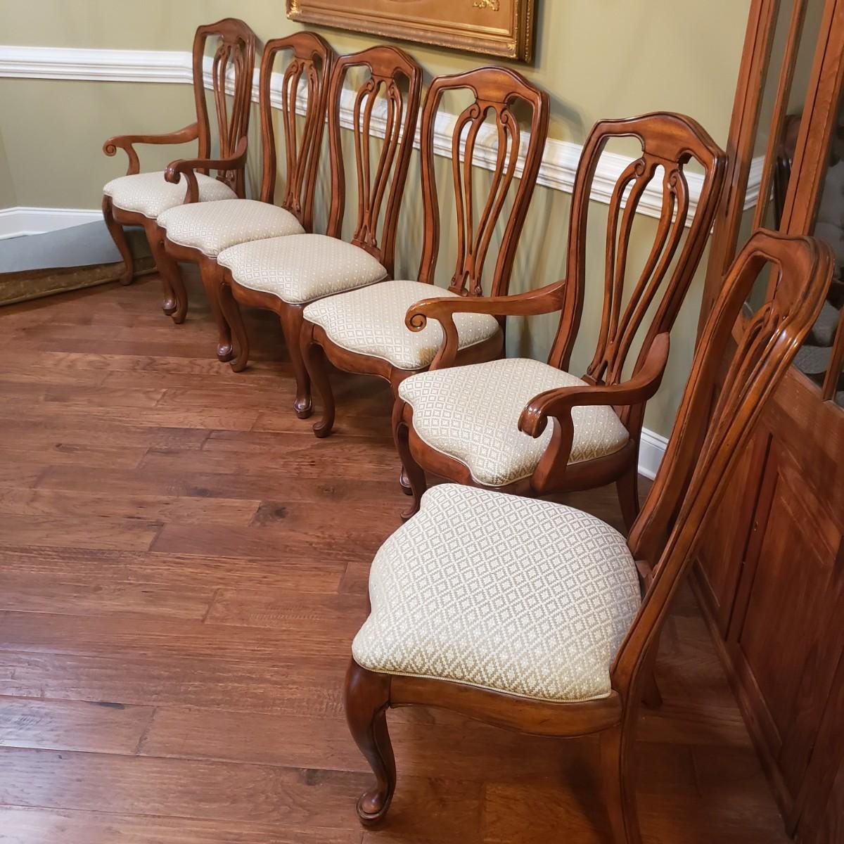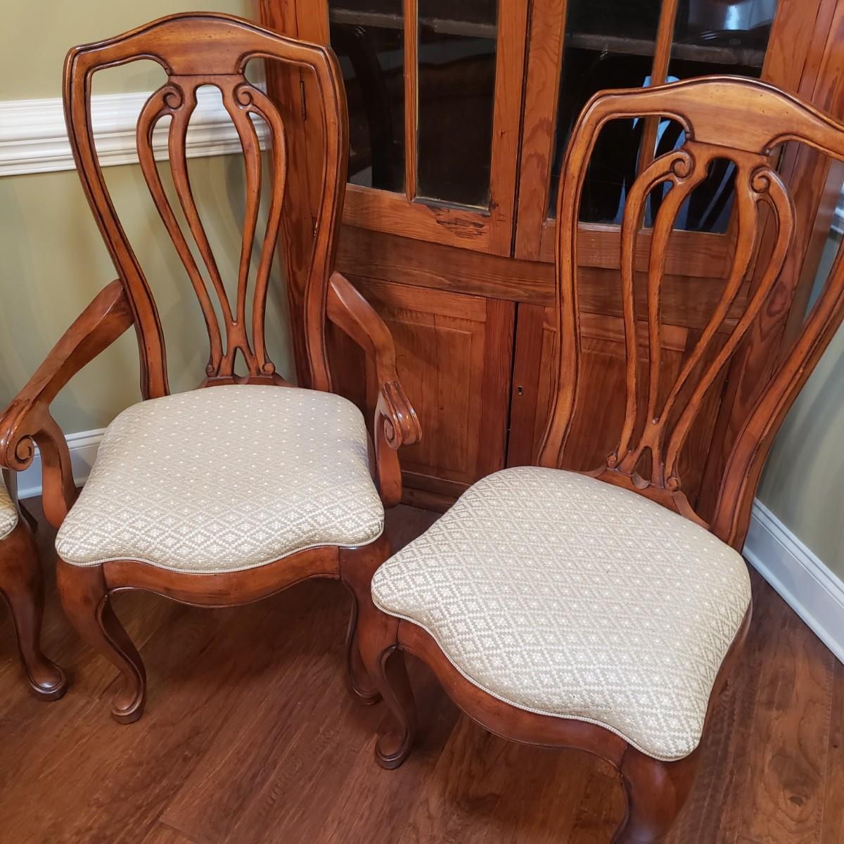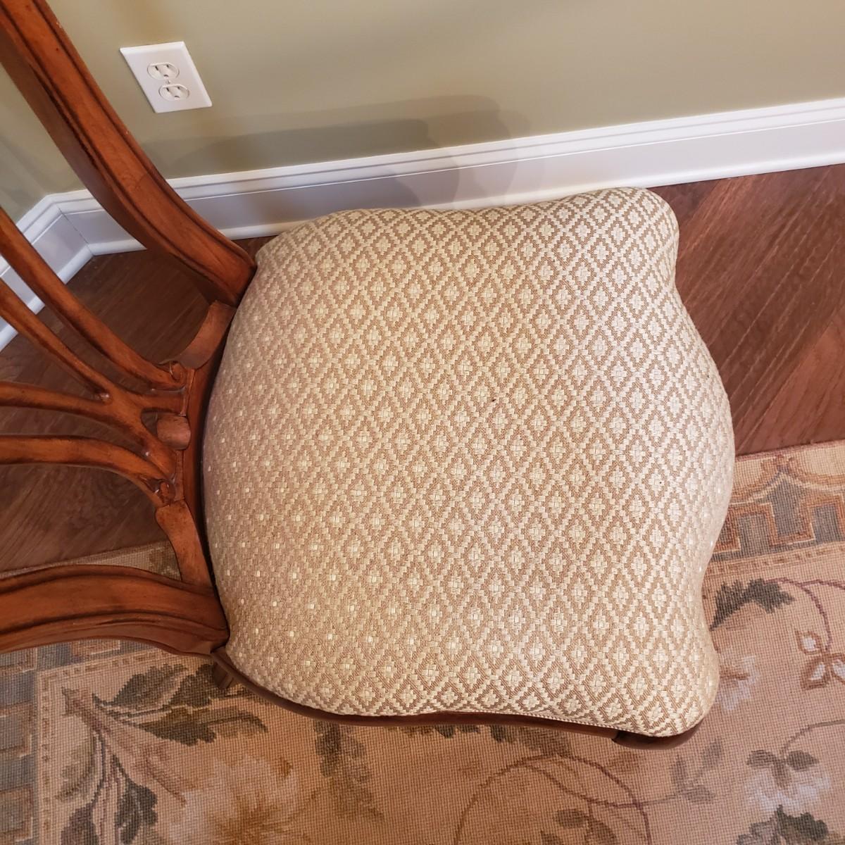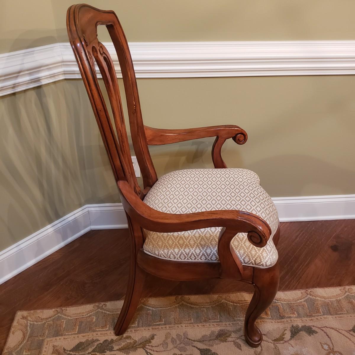 The six dining chairs feature a tan, diamond shaped print. There are two with armrest and four straight back chairs. The straight back chairs measure 21" x 18" x 42"H with a seat height of 18".