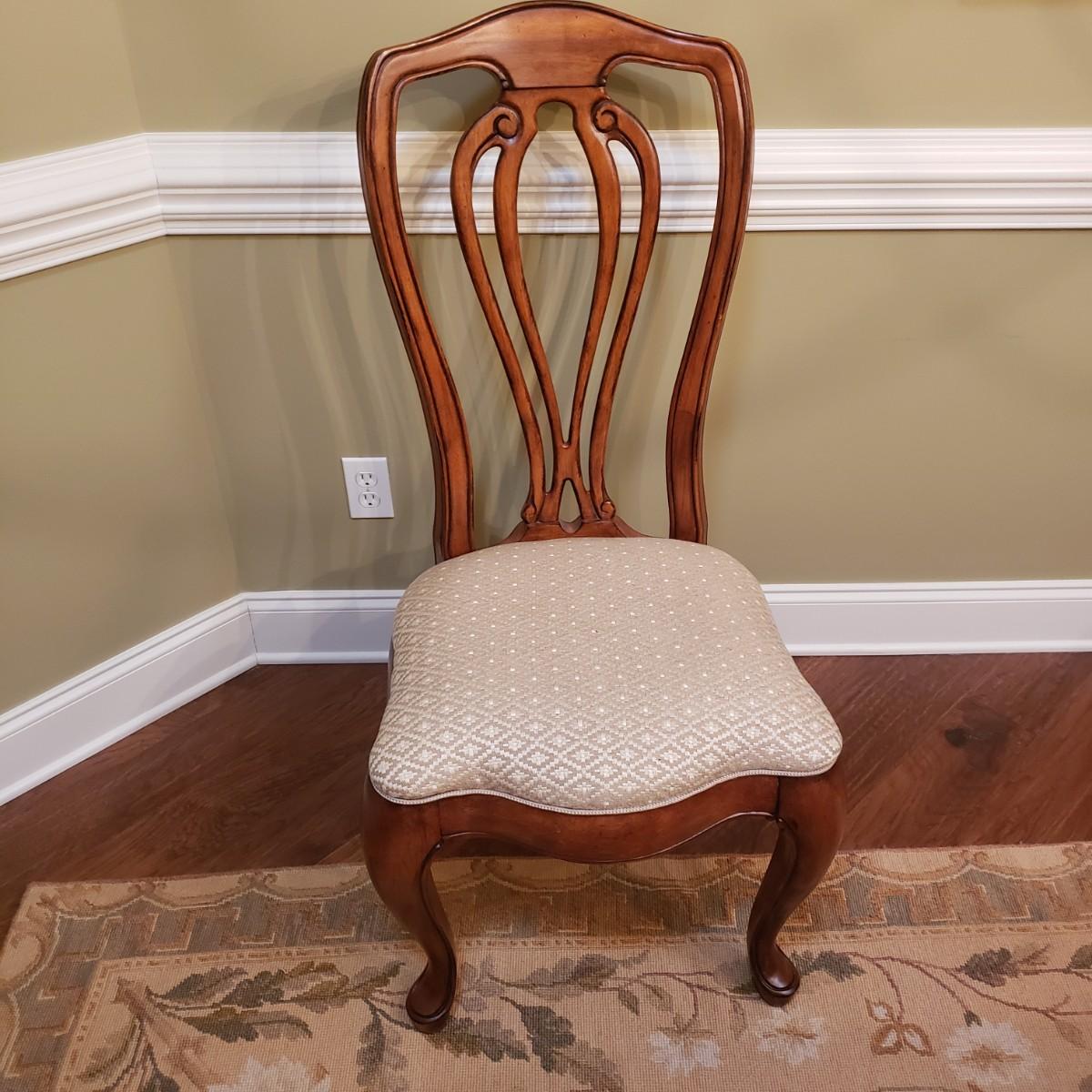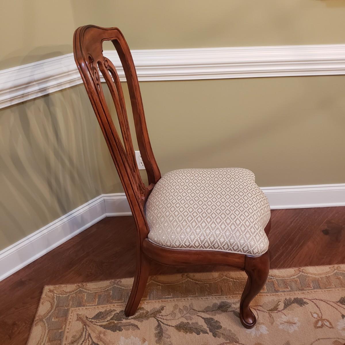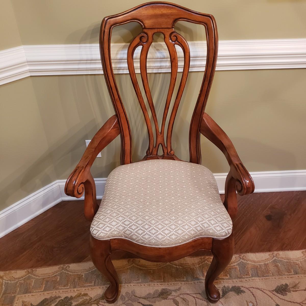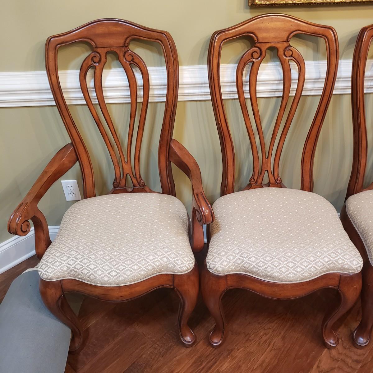 The six dining chairs feature a tan, diamond shaped print. There are two with armrest and four straight back chairs. The straight back chairs measure 21" x 18" x 42"H with a seat height of 18".