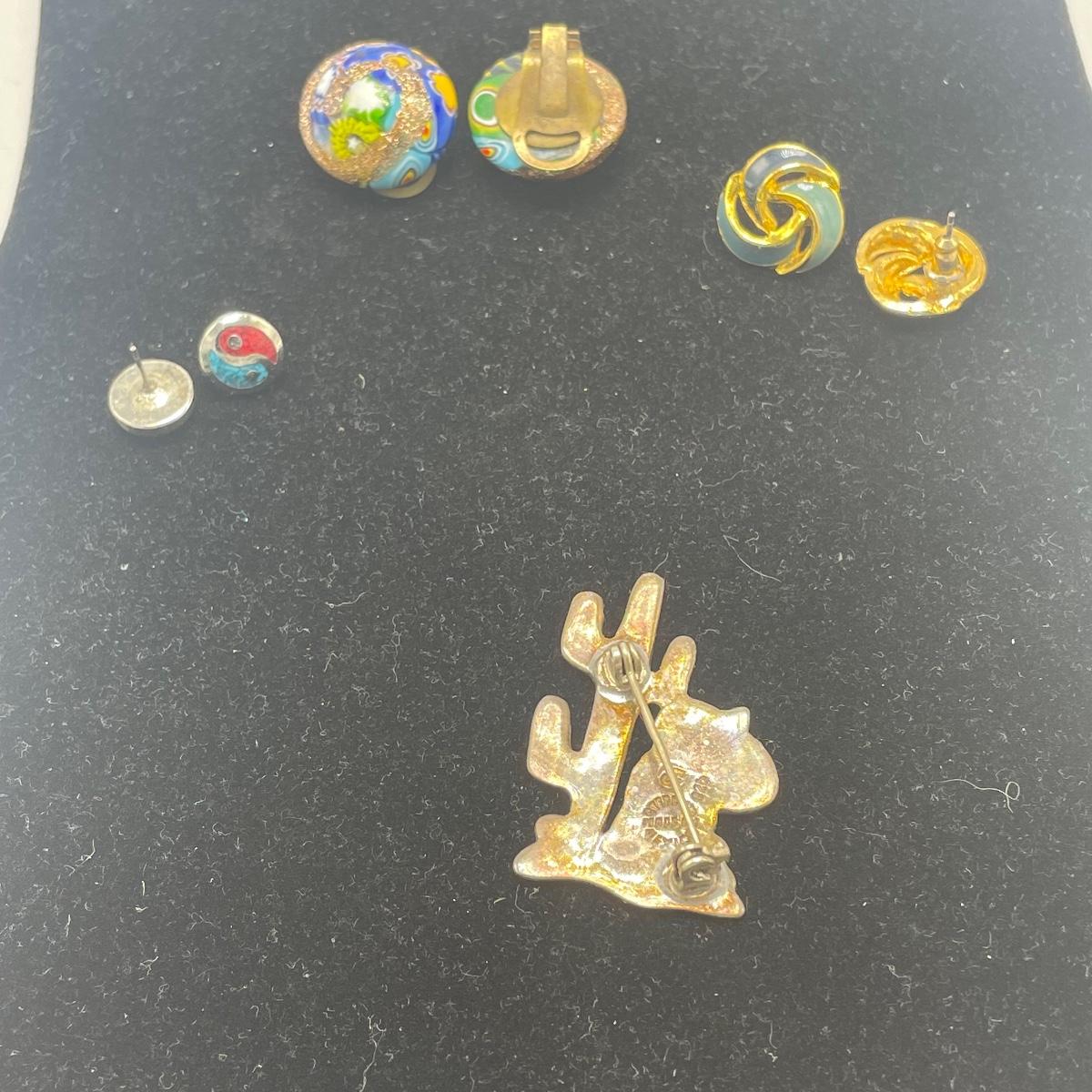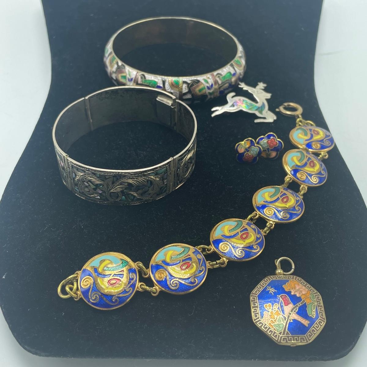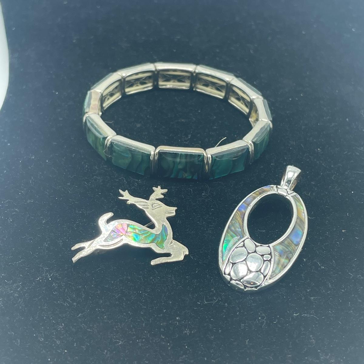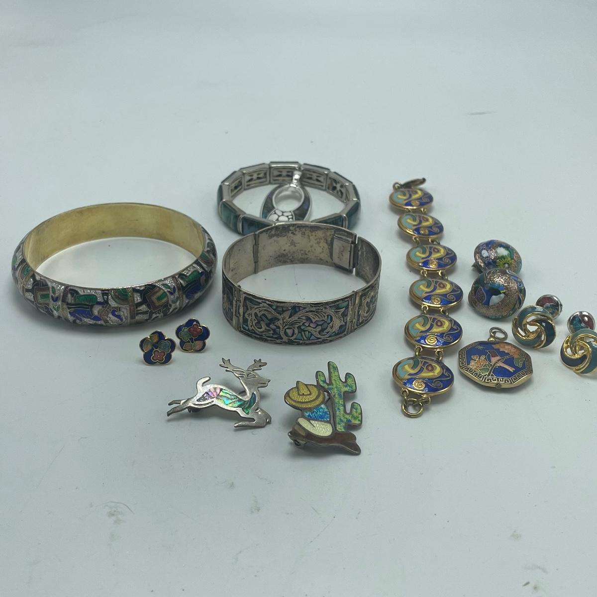 We have put together a nice assortment of inlay jewelry for you here that includes 2 bangles and one clasp bracelet, a couple of pendants, a brooch and both a post and a pair of clip-on earrings.