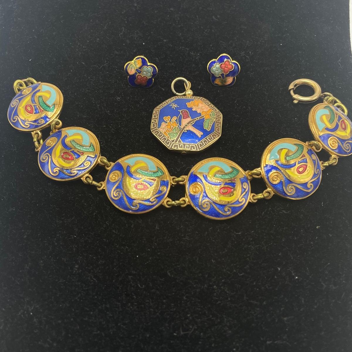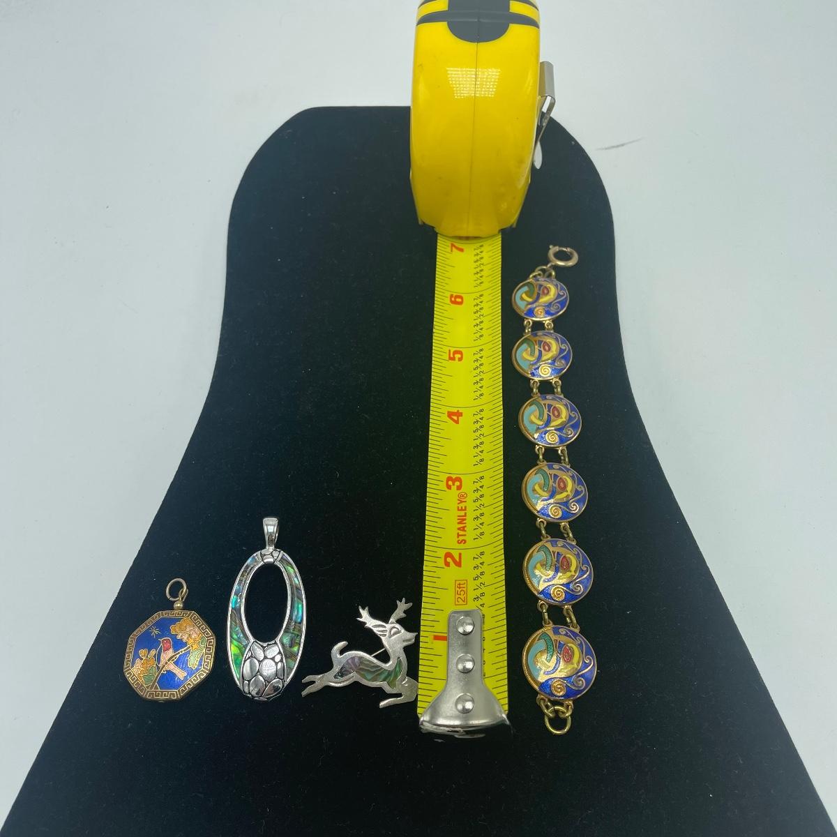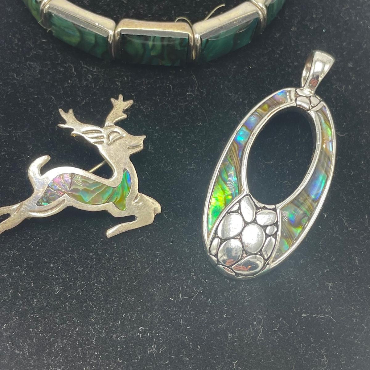 We have put together a nice assortment of inlay jewelry for you here that includes 2 bangles and one clasp bracelet, a couple of pendants, a brooch and both a post and a pair of clip-on earrings.