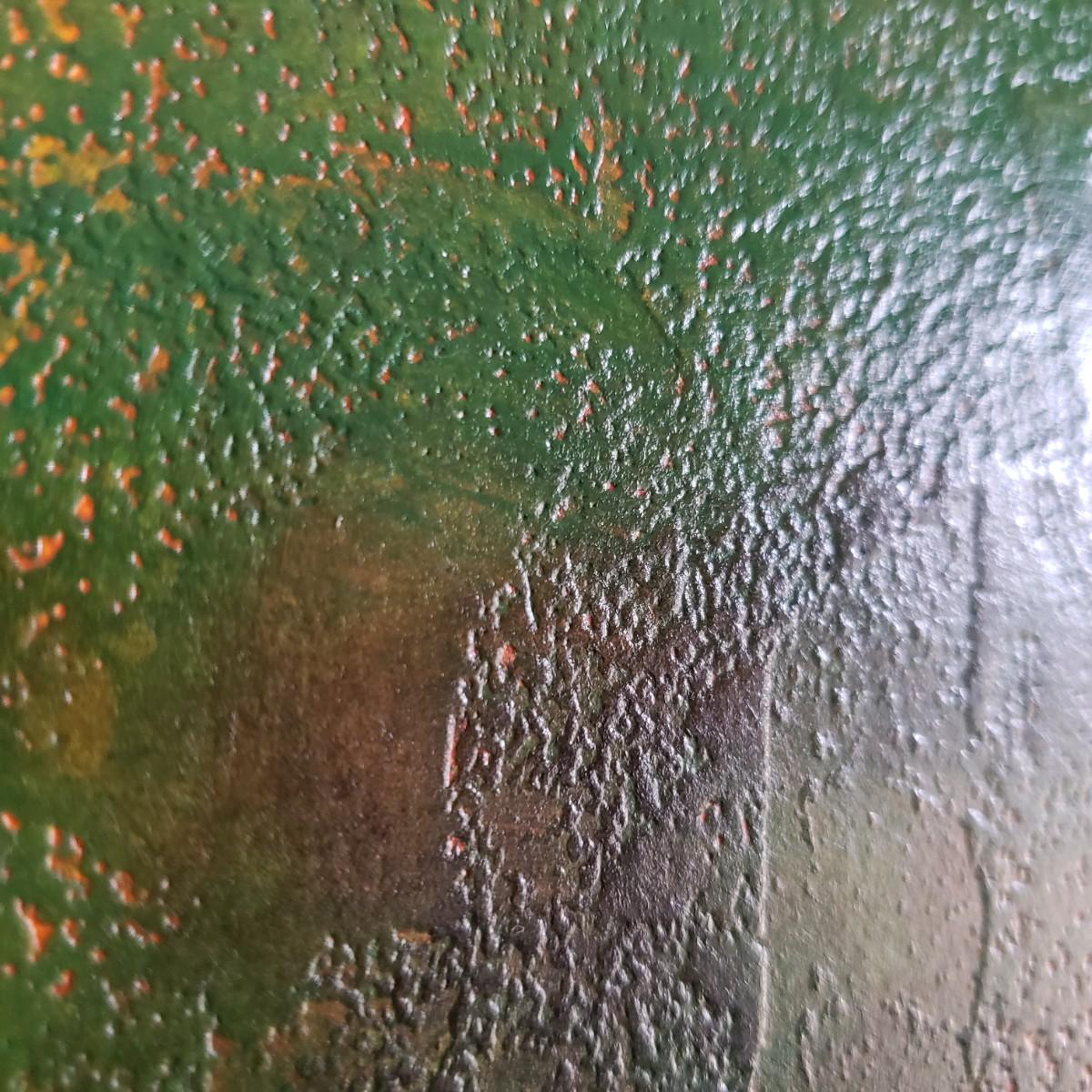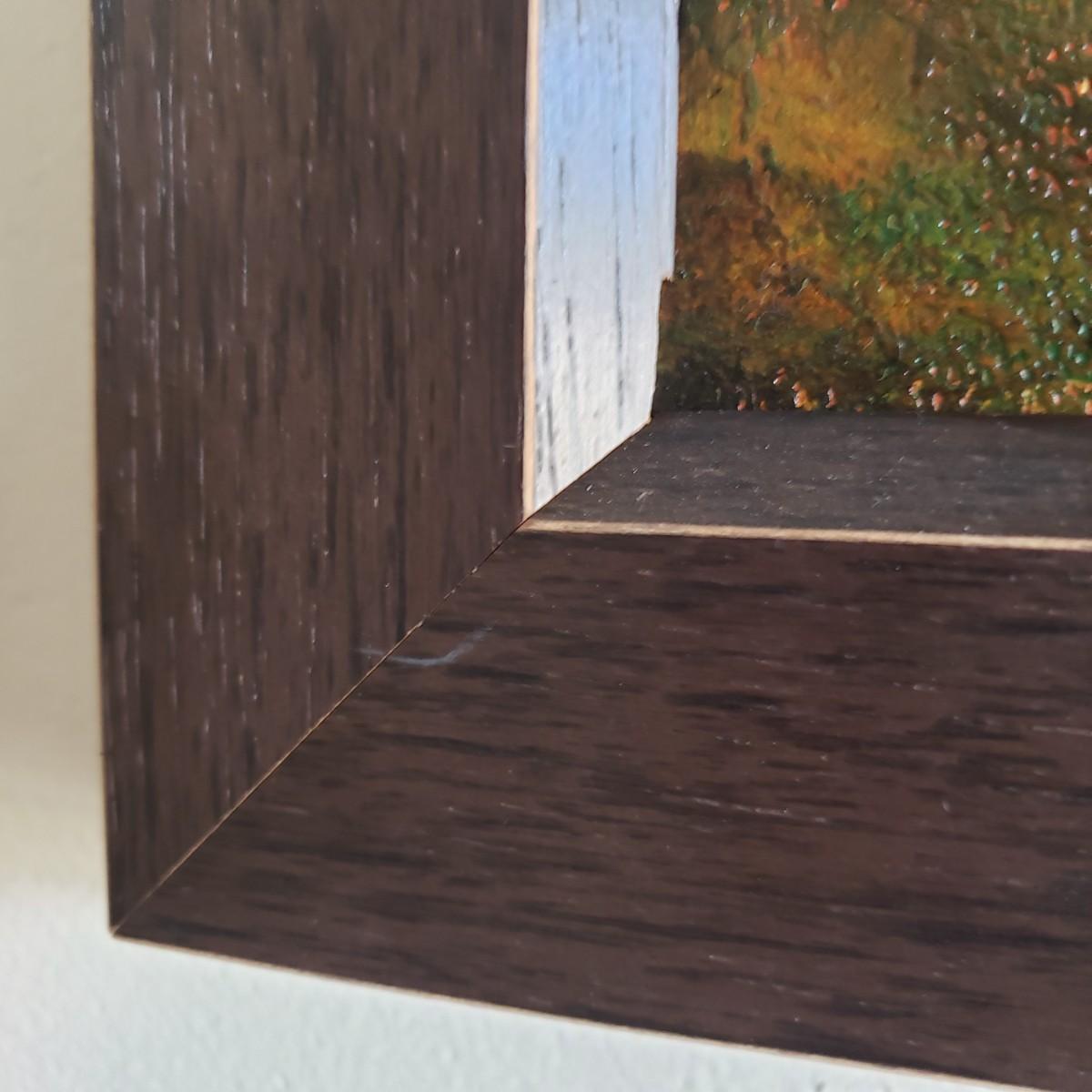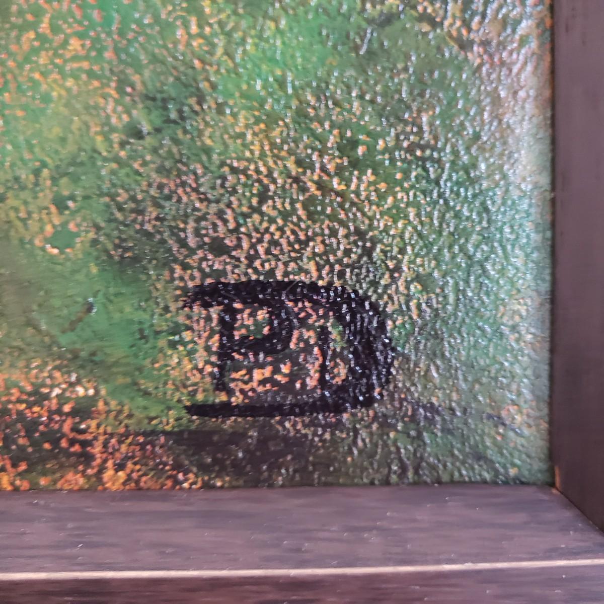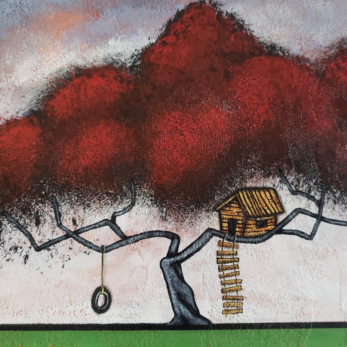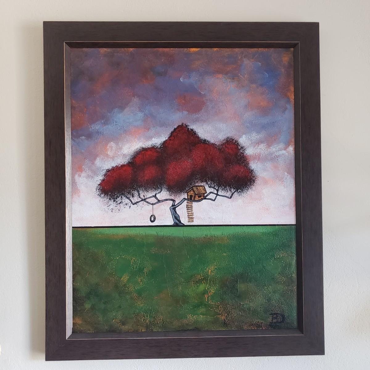 This acrylic painting is by an Asheville local artist Philip Deangelo. This appears to have an original signature. The paper pocket on the back states the title as "Innocence". The brilliant red tree, tire swing and tree house speaks of innocence. The wooden frame appears to have a dark veneer finish without glass. The frame measures 19" x 23".