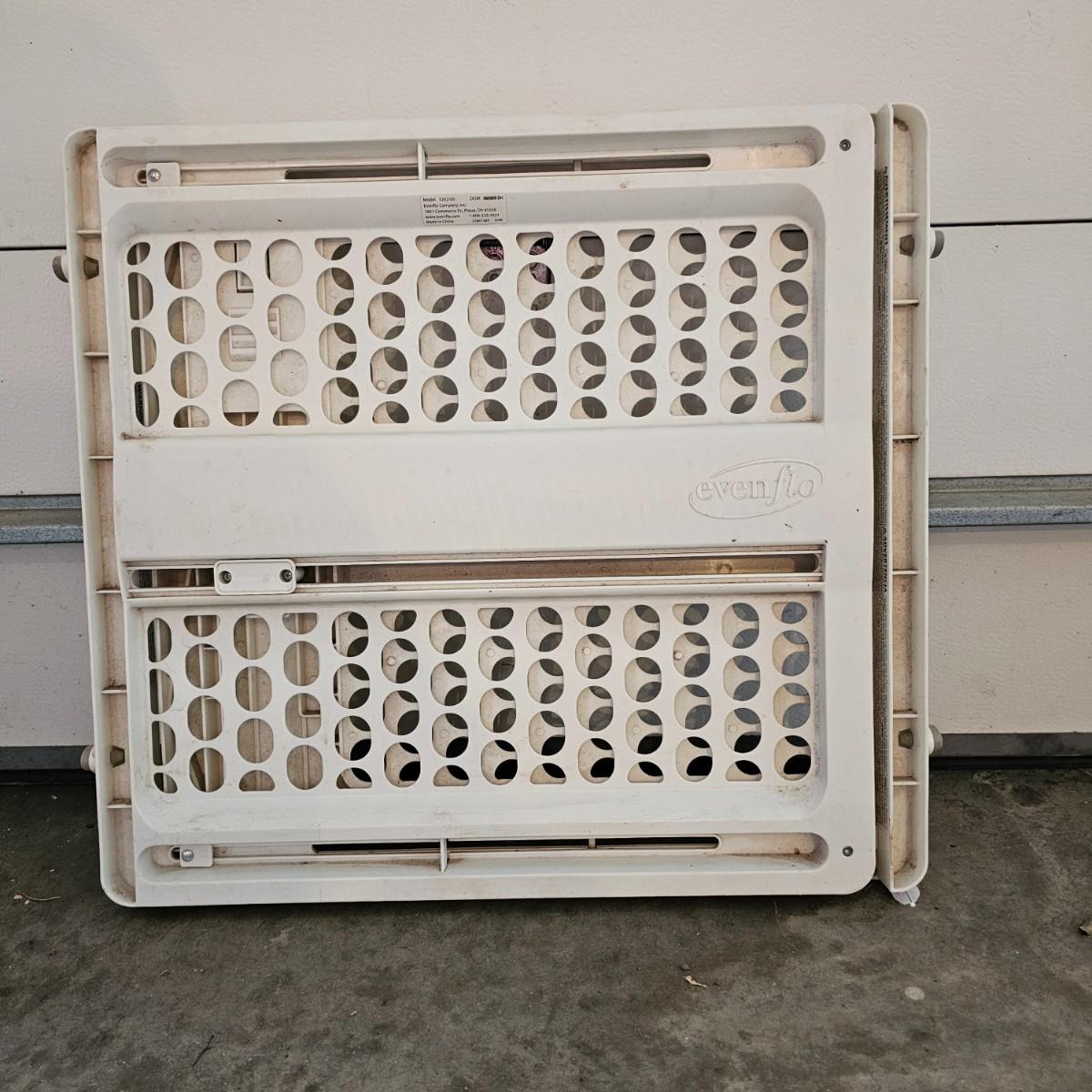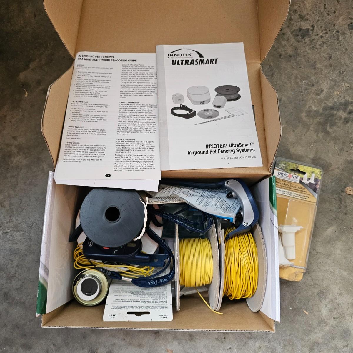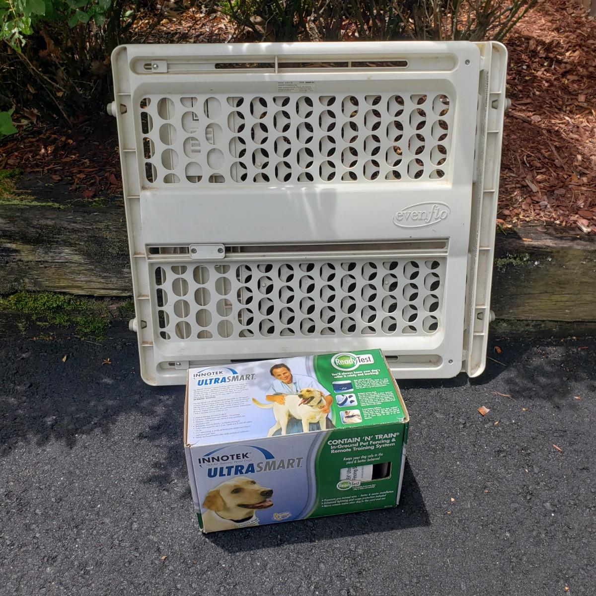 This lot features an Innotek pet fencing and training kit. Comes with supplies on the box, see pictures. It appears the kit was not used or barely used. The Evenflo gate is plastic with rubber stoppers at each side. It fits openings 27"-42" wide and uses a pressure mount system that does not require tools.
