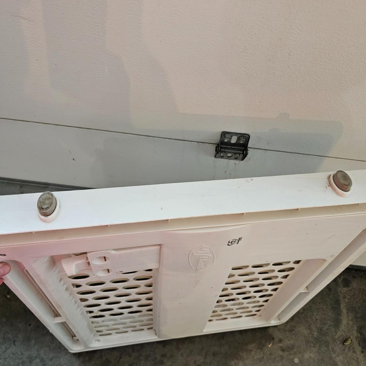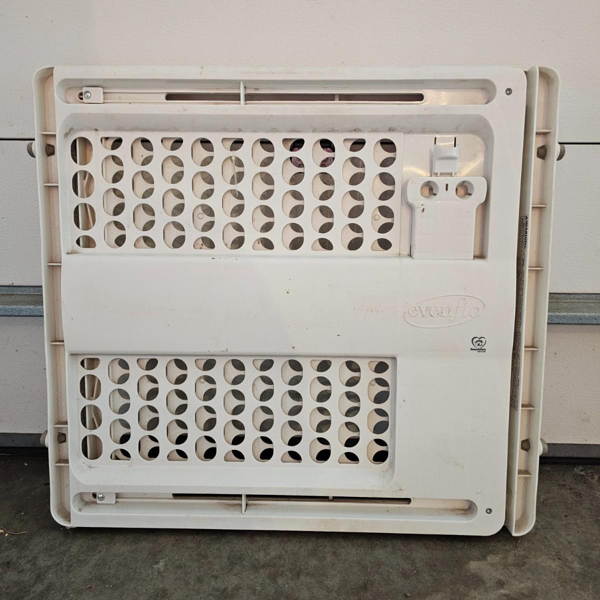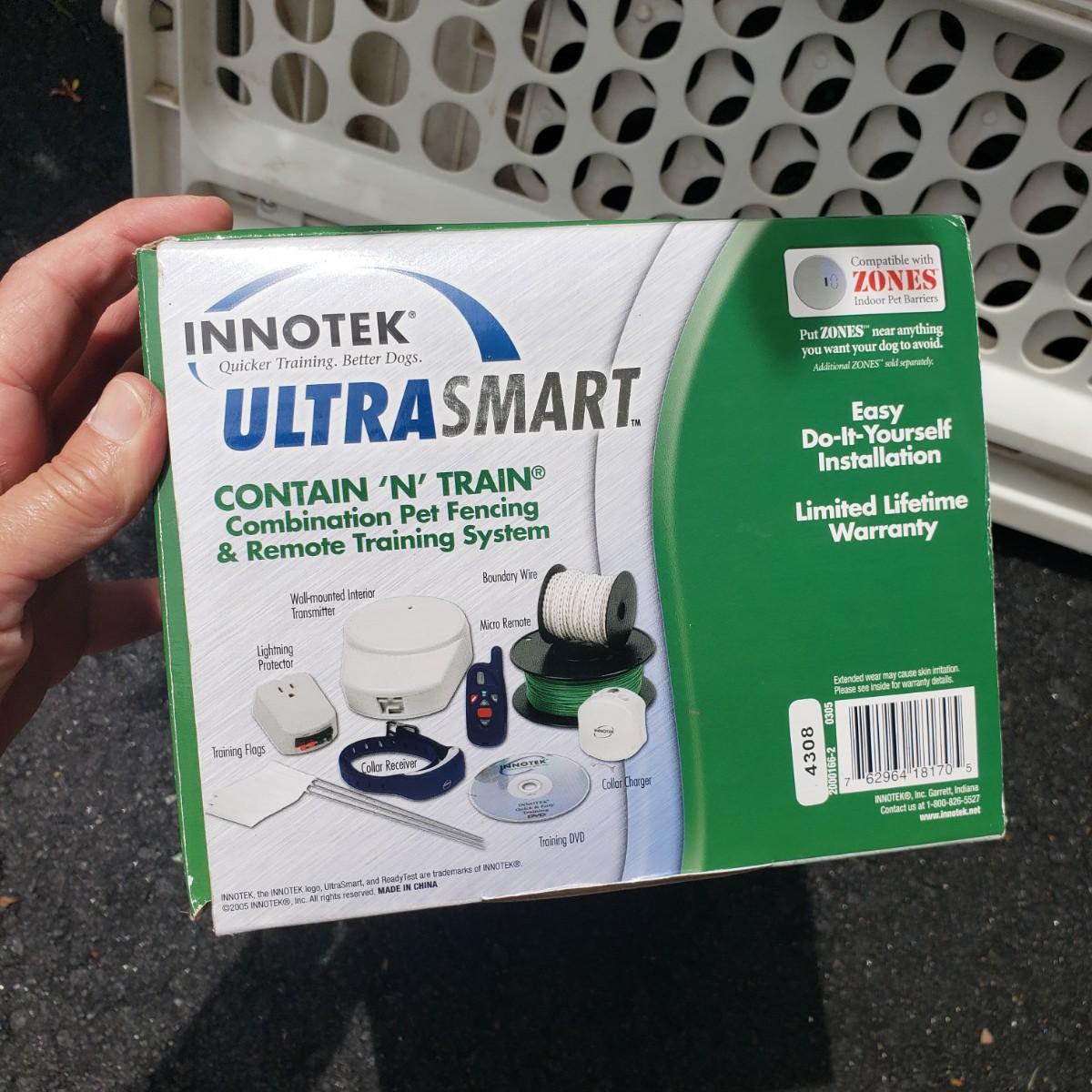 This lot features an Innotek pet fencing and training kit. Comes with supplies on the box, see pictures. It appears the kit was not used or barely used. The Evenflo gate is plastic with rubber stoppers at each side. It fits openings 27"-42" wide and uses a pressure mount system that does not require tools.