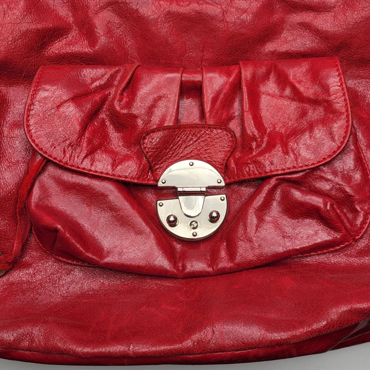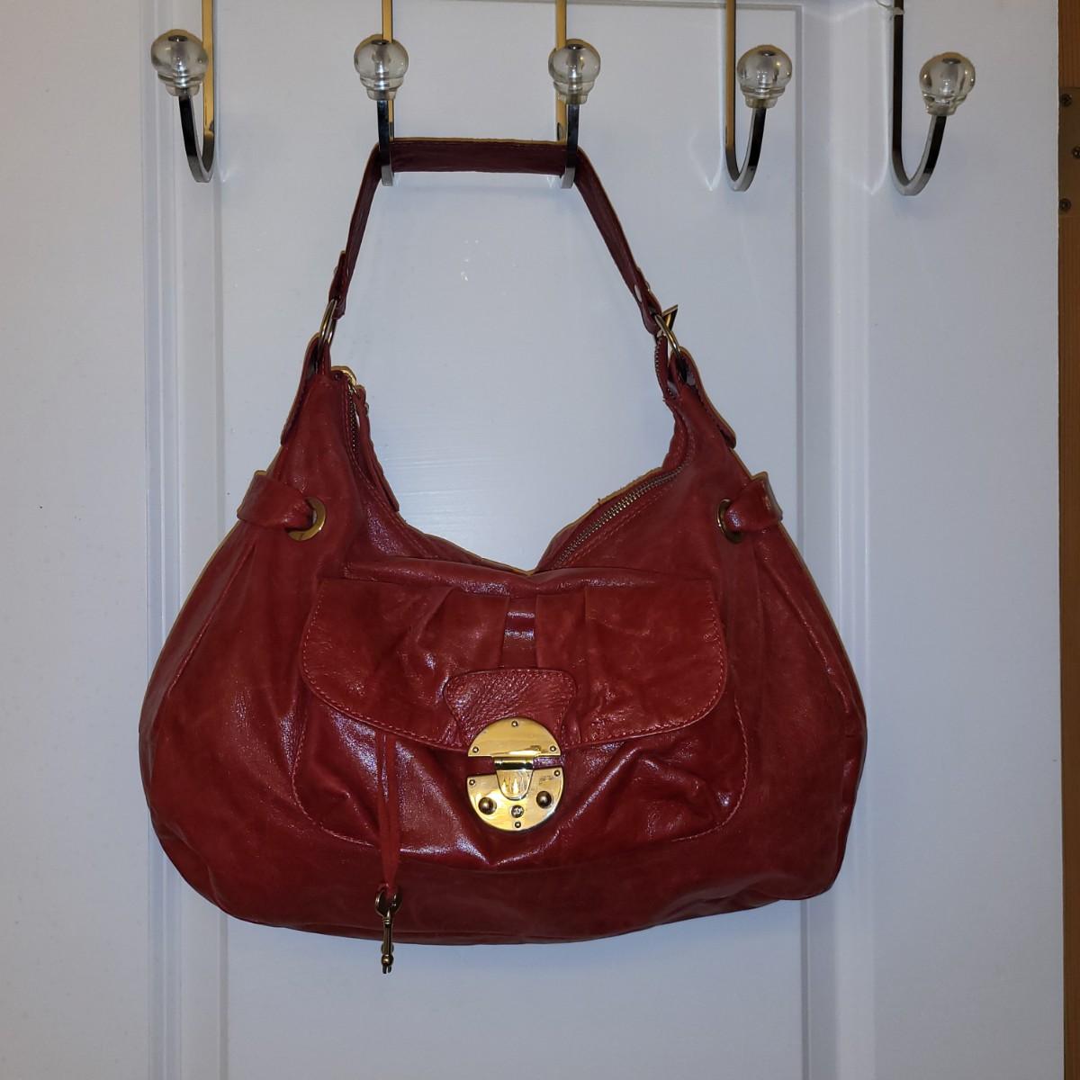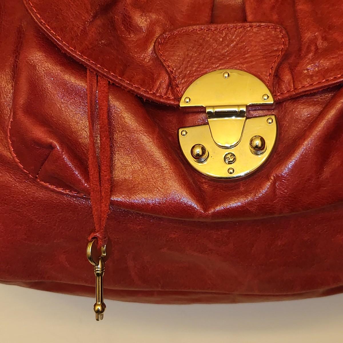 Soft, flexible, distressed red, genuine leather hobo style shoulder handbag by Innue, Italy. 15" long x 10" tall x 4" deep. Strap drop length is 8". Silver tone hardware. Roomy main compartment with small interior side zipper pocket. Locking front pocket. Key attached to front. Zipper top closure.