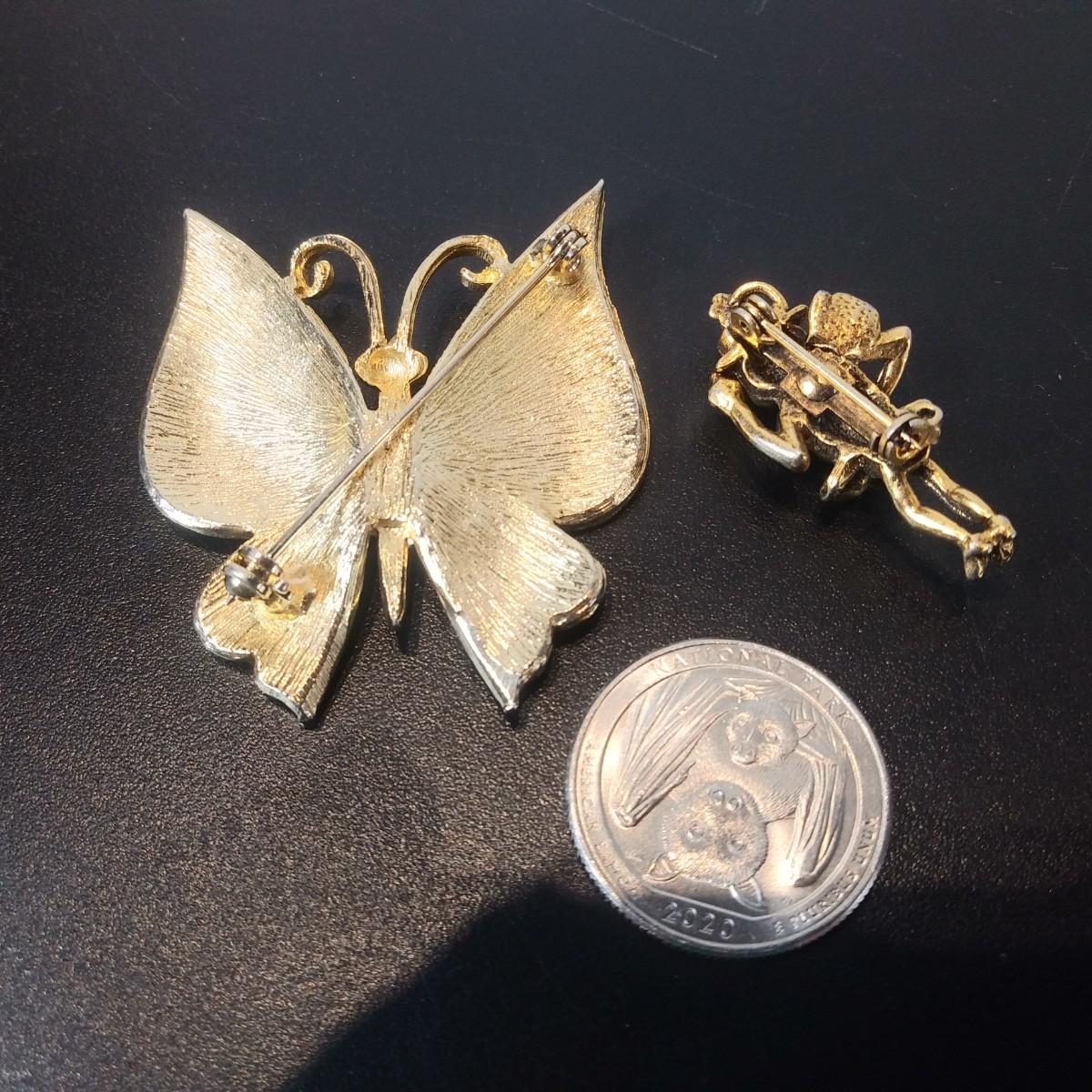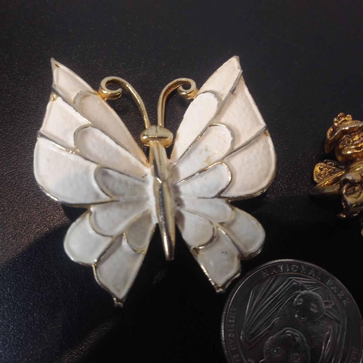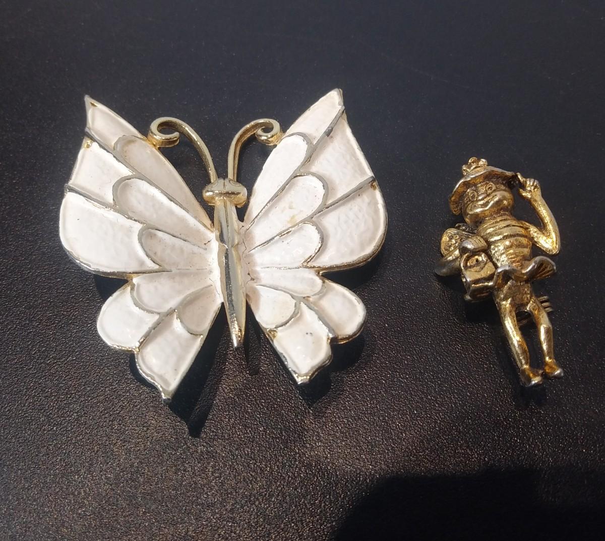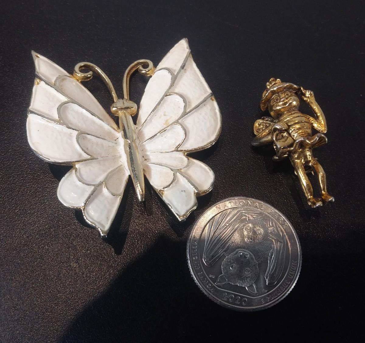 This auction lot is for a Duo of Insect Broaches. One piece is a white and brass butterfly and the little brass one looks to be a Bumble Bee, somewhat like the Honey Oats Cereal Bee? He has lots of personality. Both pins are in very good shape.
