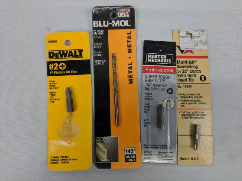 Insert Bits/Tips: Master Mechanic 1/4" Bit Phillips, 5/32 Clutch Extra Hard Tip, Blu-Mol 5/32 Bit, DeWalt 1" Phillips Bit Tips - New