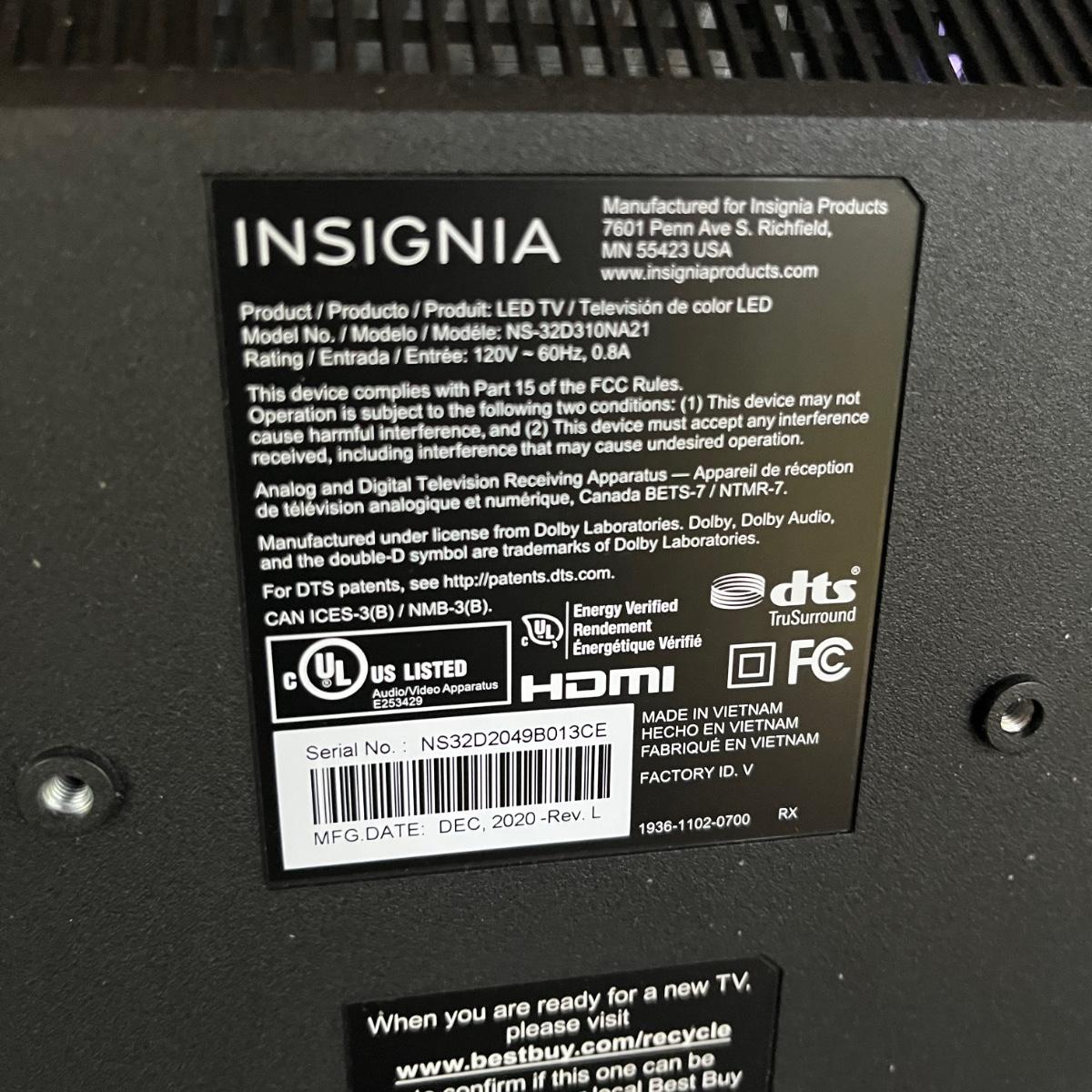 Lot includes a Insignia 32” LED TV that powered on when tested. There is no remote. Model # NS-32D310NA21.