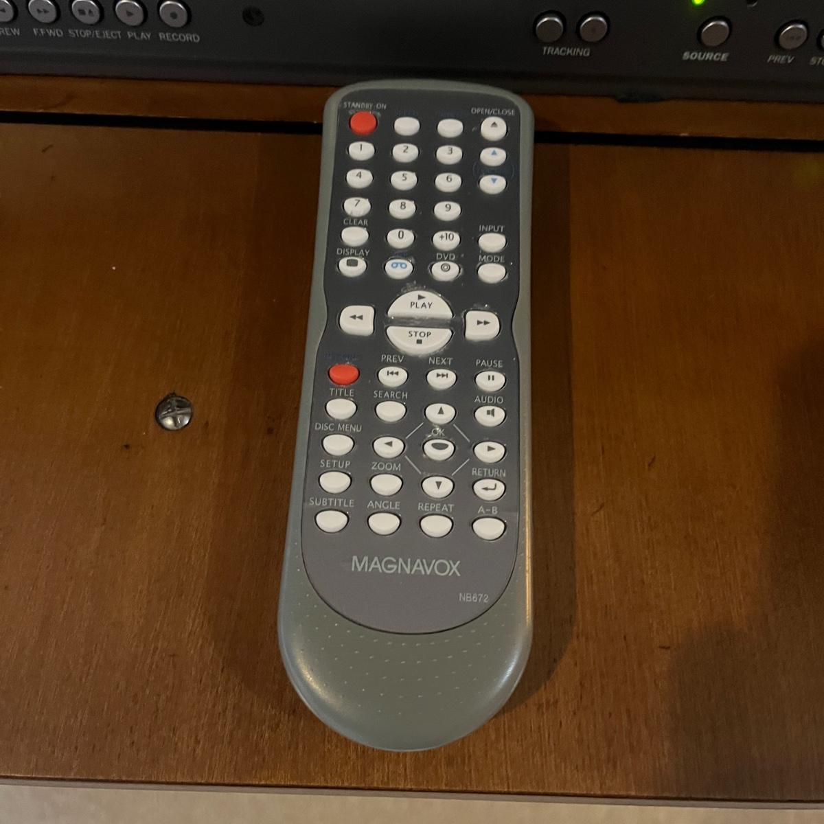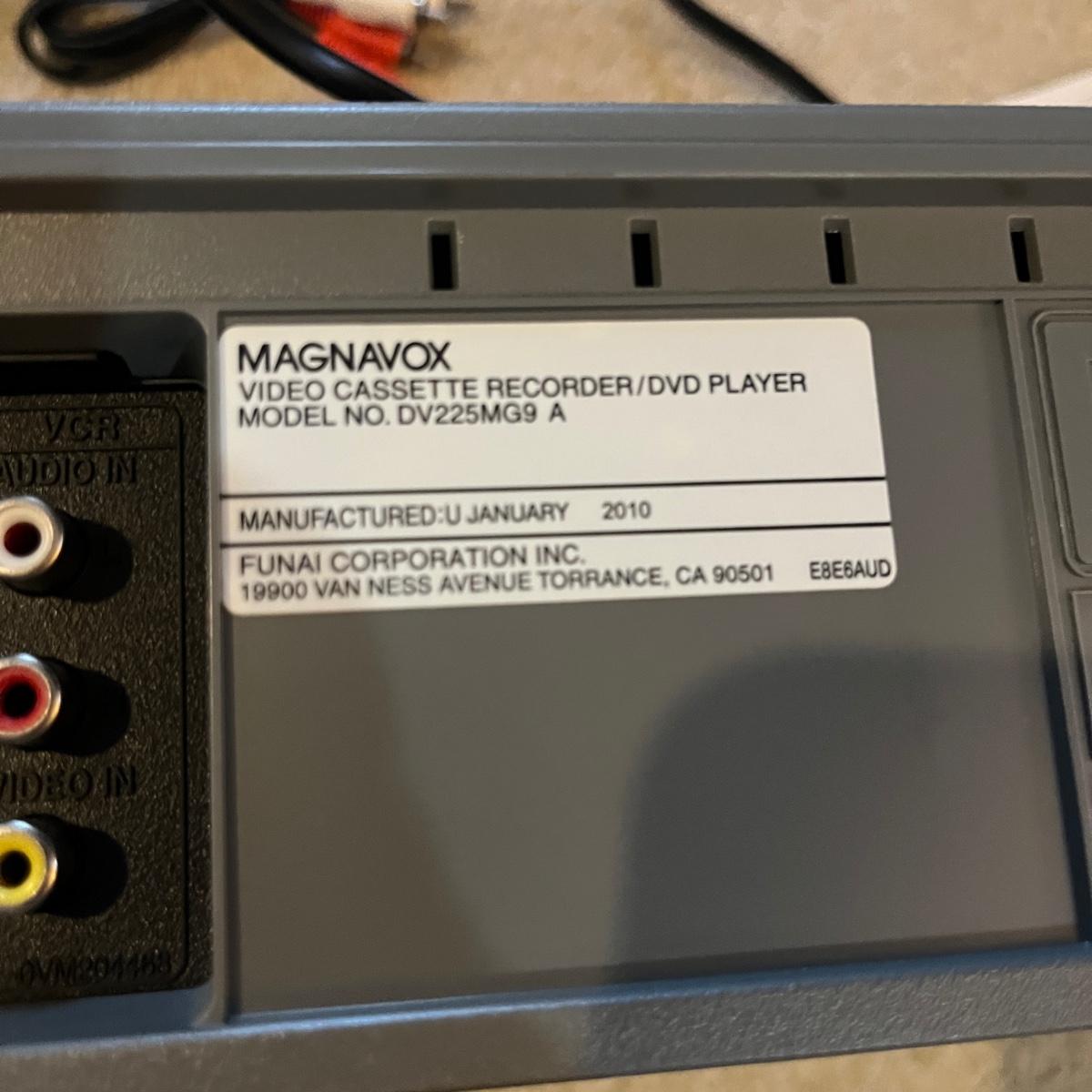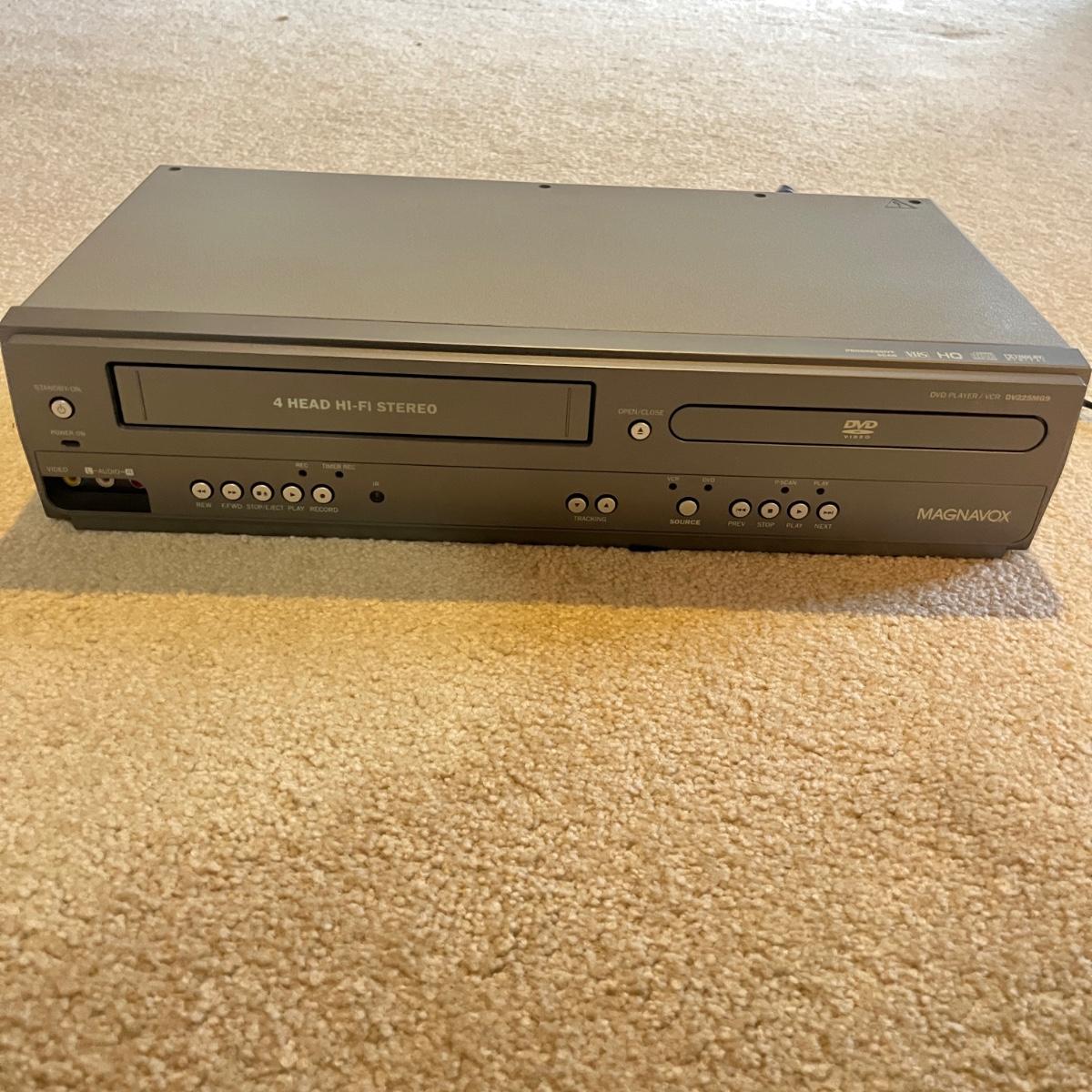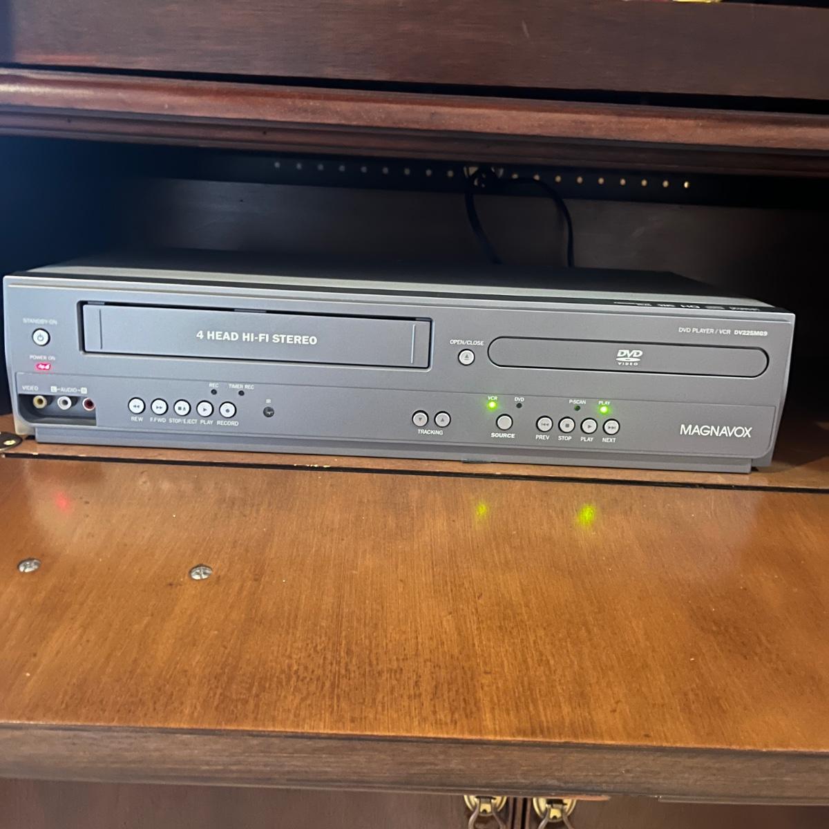 Lot includes an Insignia 32” TV with remote and a Magnavox DVD/VCR with remote. Both items powered on when plugged in. DVD/ VCR measures 17” x 9” x 4”H. Cabinet not included but is available in auction.