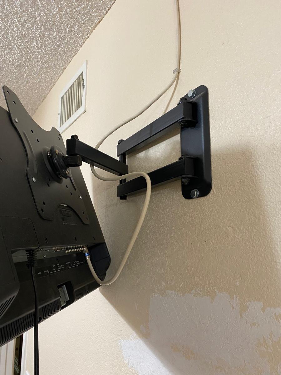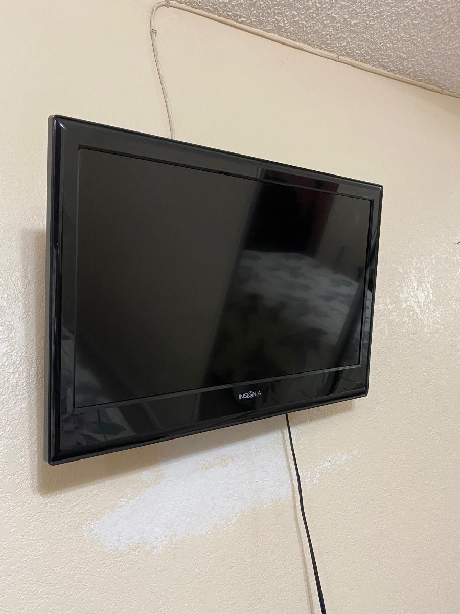 Insignia Flat Screen TV with Wall Mount. Model #NS-24L120A13. Was not connected to cable but TV does power on. Has remote, but battery terminals are a little corroded and need to be cleaned. Must be removed from wall, comes with wall mount, no base for standing.