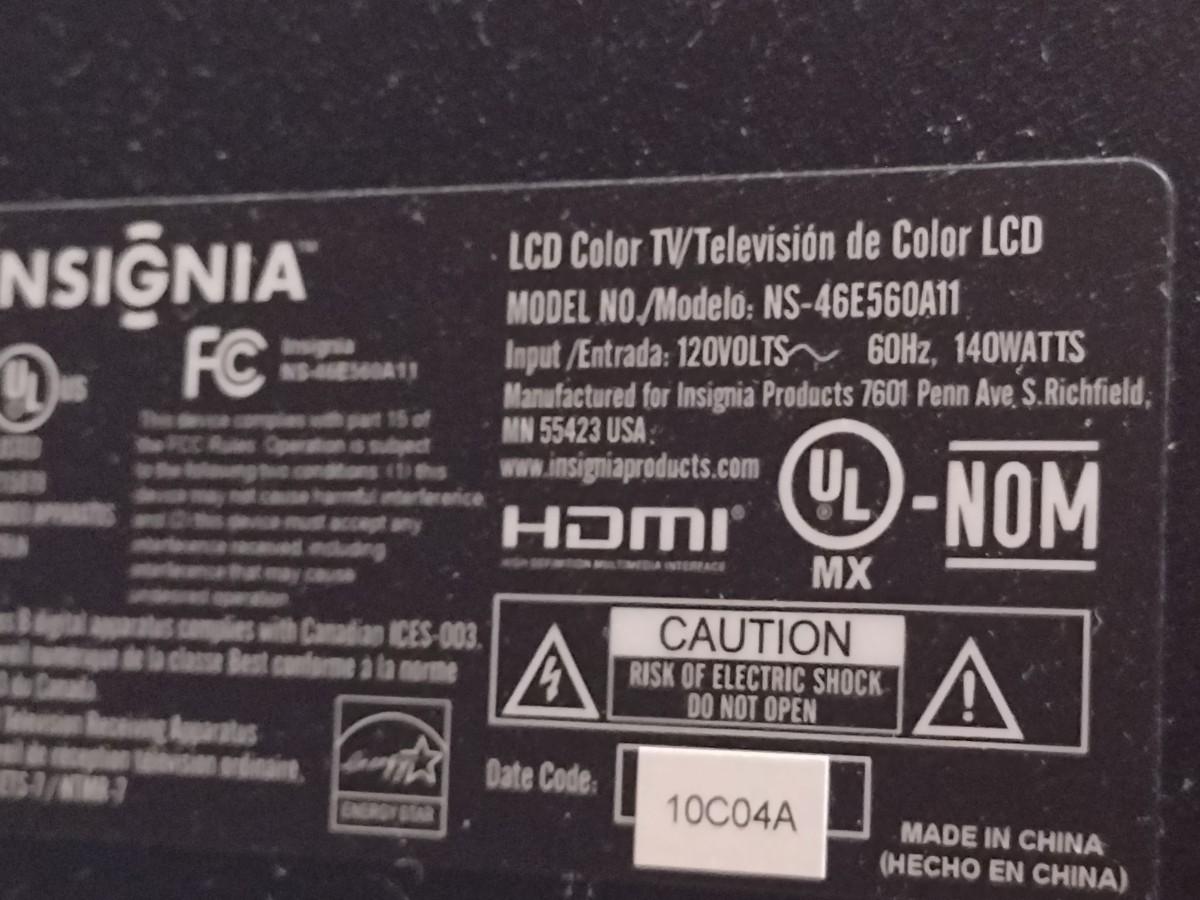 Insignia Flat Screen TV with Remote- Approx 46 Inch. Item is upstairs- bring assistance for safe removal.