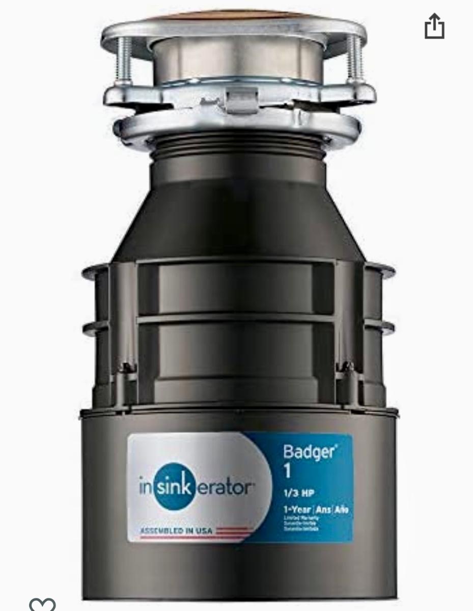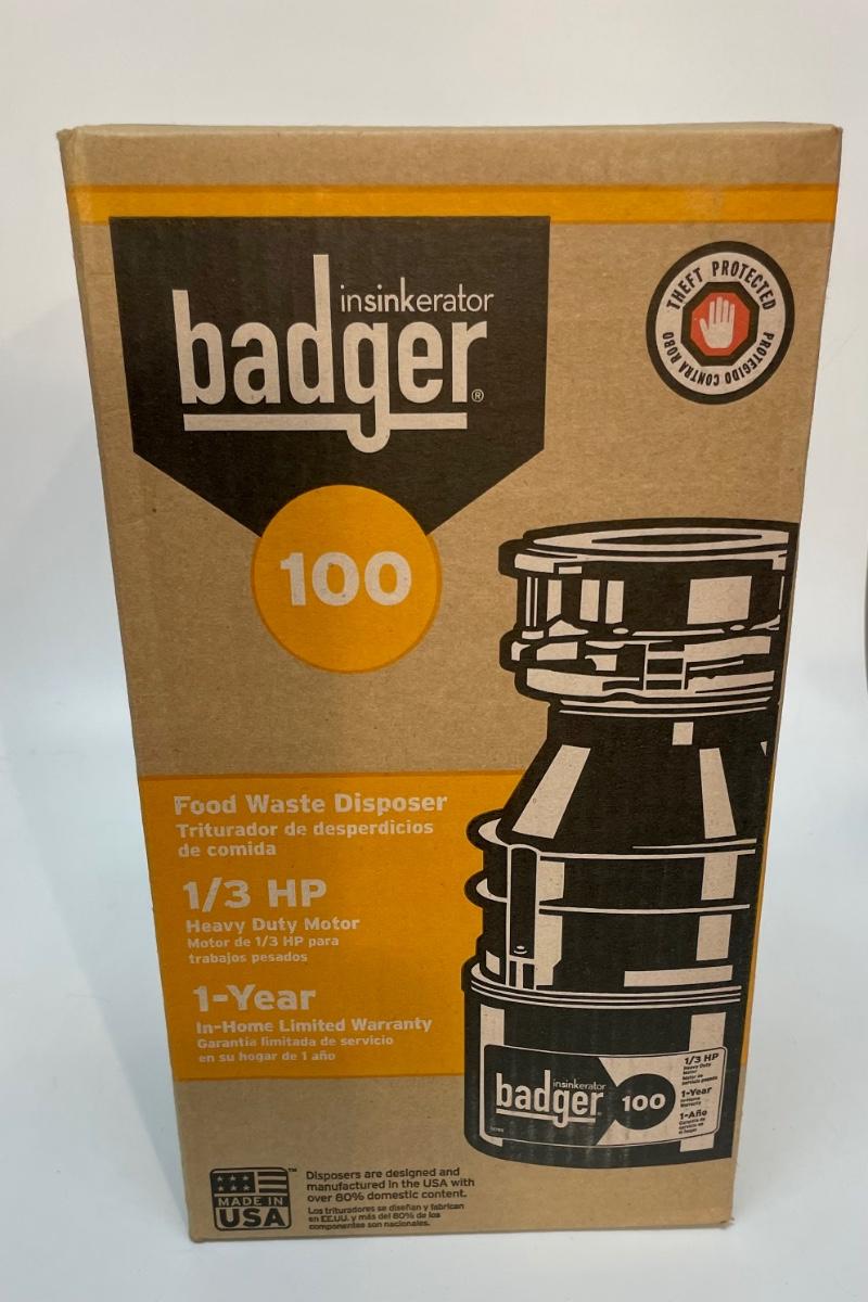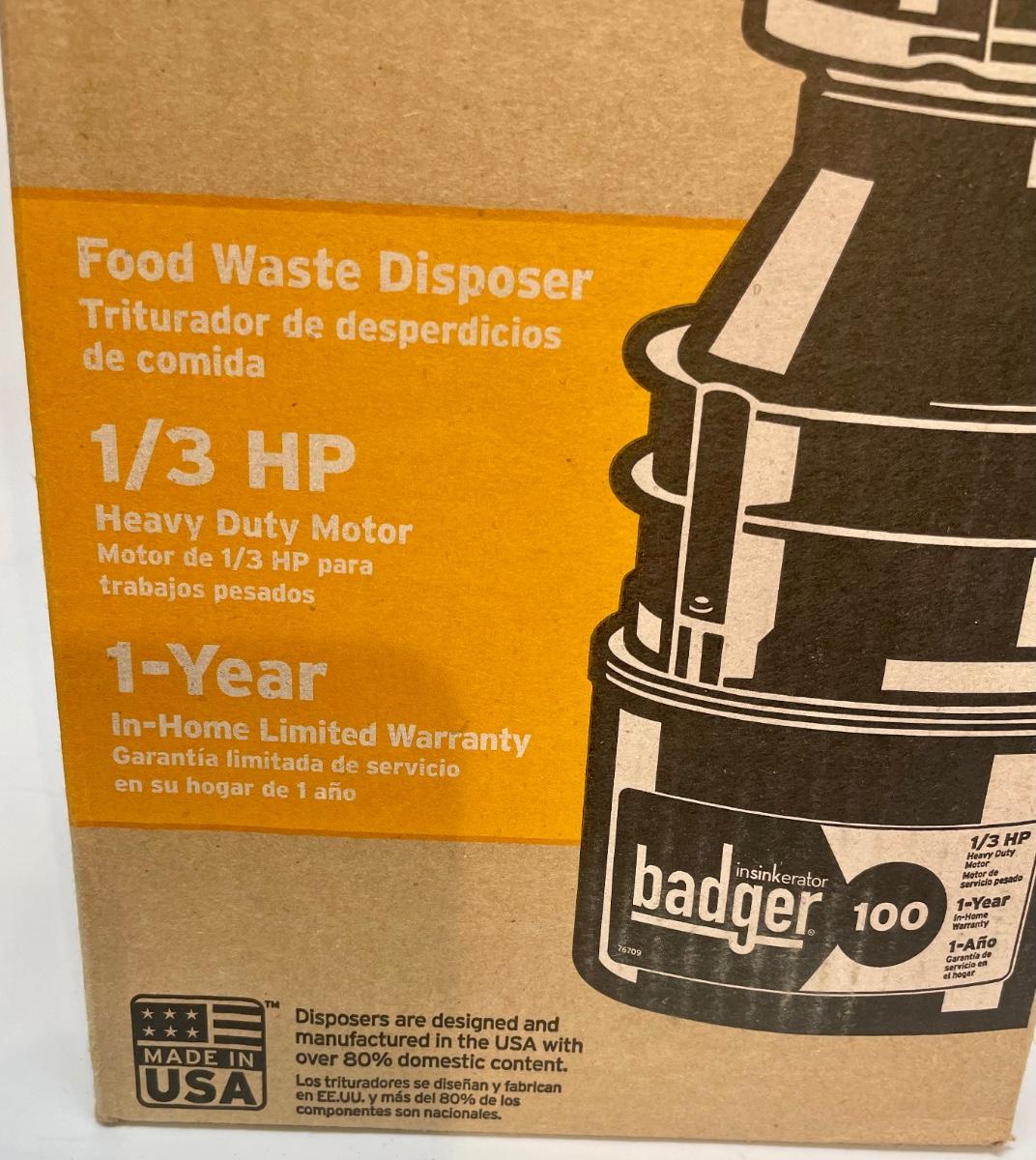 New in box 1/3 HP garbage disposer. Badger 100 model. Made in USA.