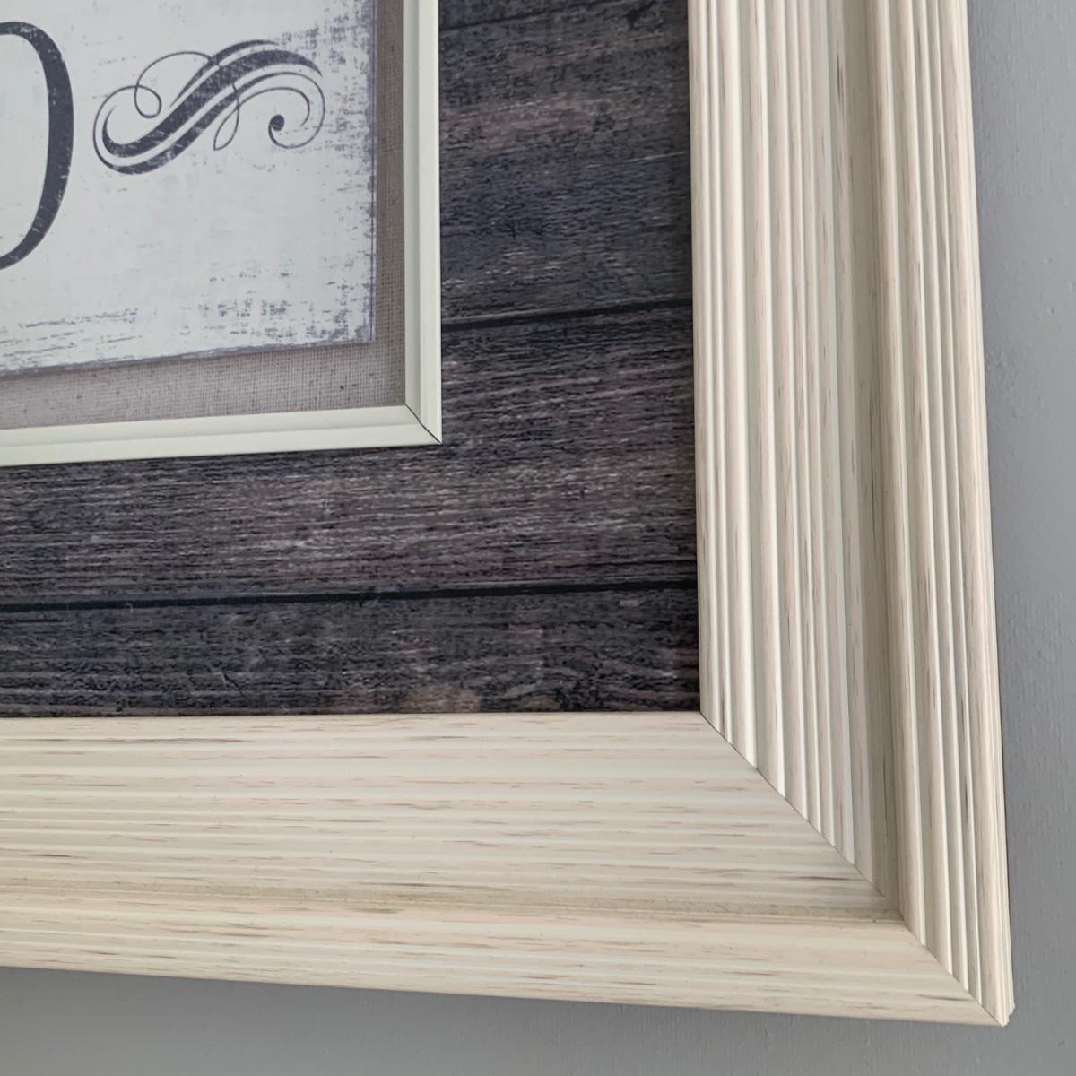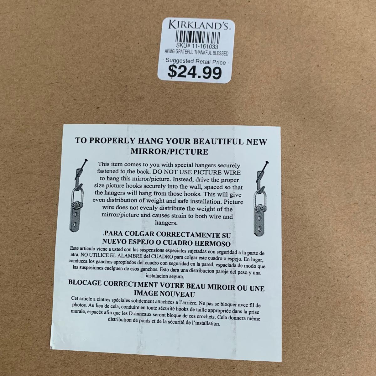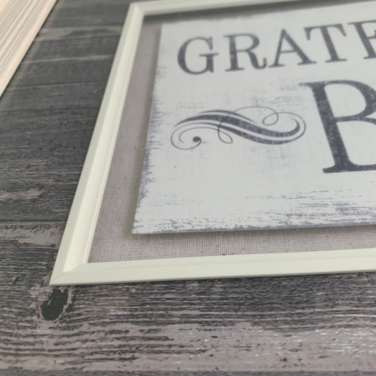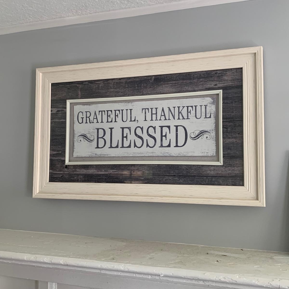 Three inspirational art/decor pieces. “Grateful, Thankful, Blessed” is in a white frame that measures 29.75” x 17.75”. Its frame has a wood appearance but feels like plastic. The decor with the butterfly appears to be a square piece of particle board with paper covering it. There is a small white scratch/imperfection and it has some damage on the back that is not seen from the front. The framed “Without Much” is 6” x 8”.