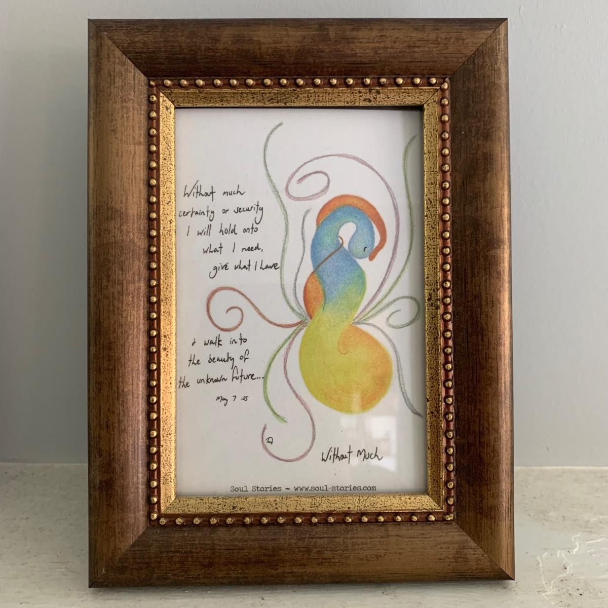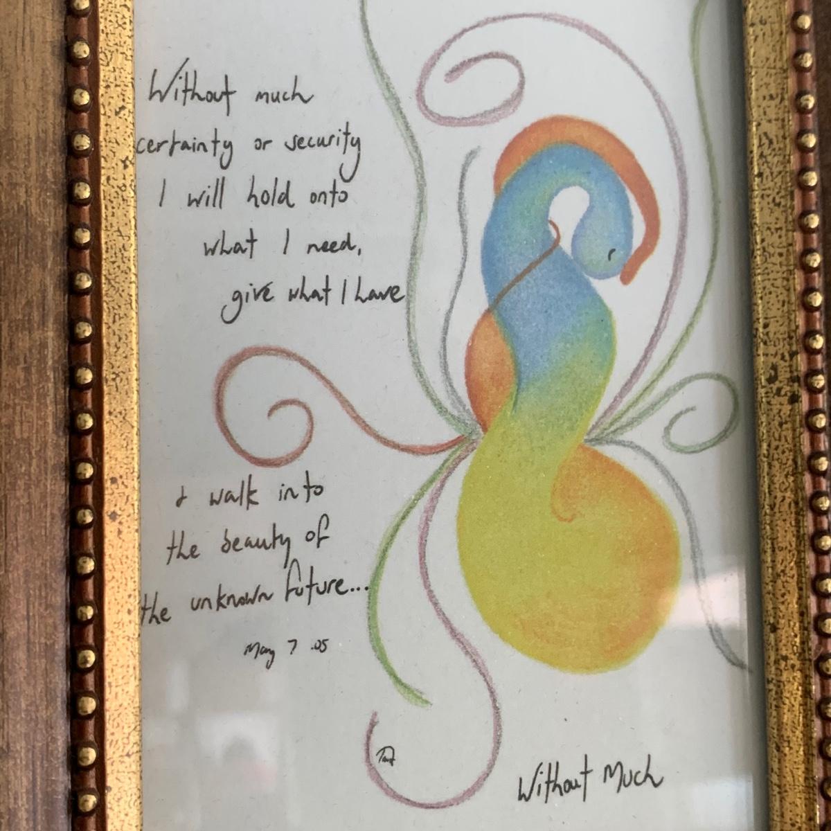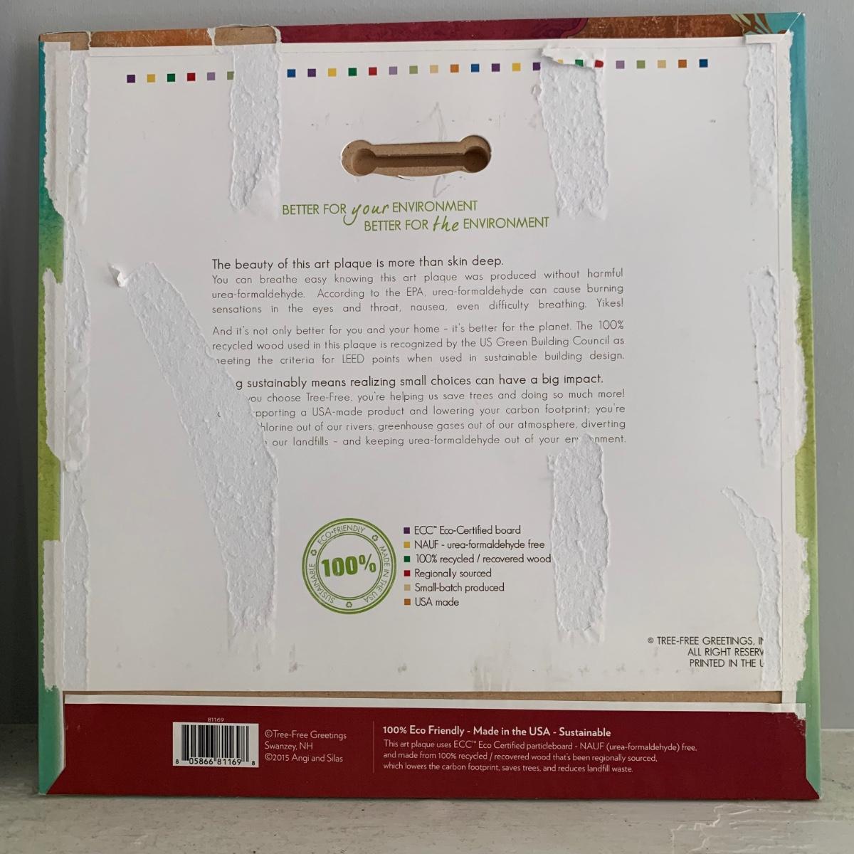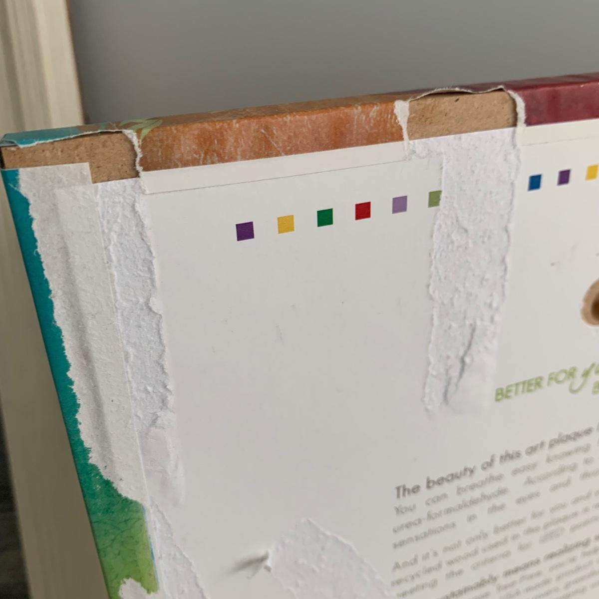 Three inspirational art/decor pieces. “Grateful, Thankful, Blessed” is in a white frame that measures 29.75” x 17.75”. Its frame has a wood appearance but feels like plastic. The decor with the butterfly appears to be a square piece of particle board with paper covering it. There is a small white scratch/imperfection and it has some damage on the back that is not seen from the front. The framed “Without Much” is 6” x 8”.