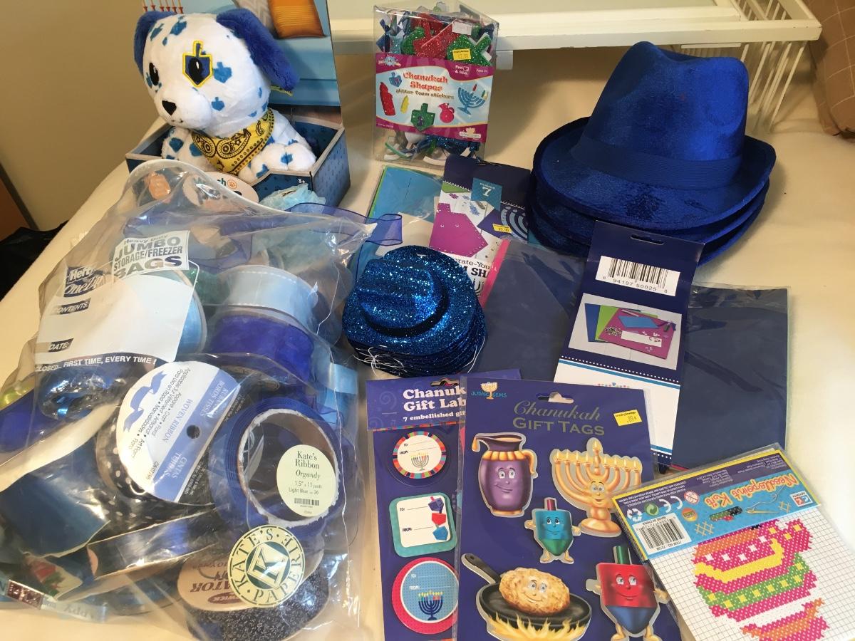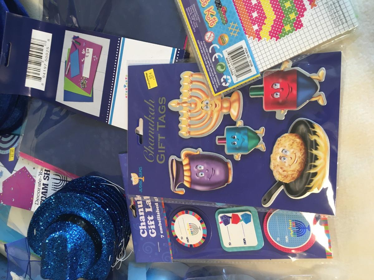 Assortment of Chanukah items included ribbon, stuffed animal, hats, stickers.