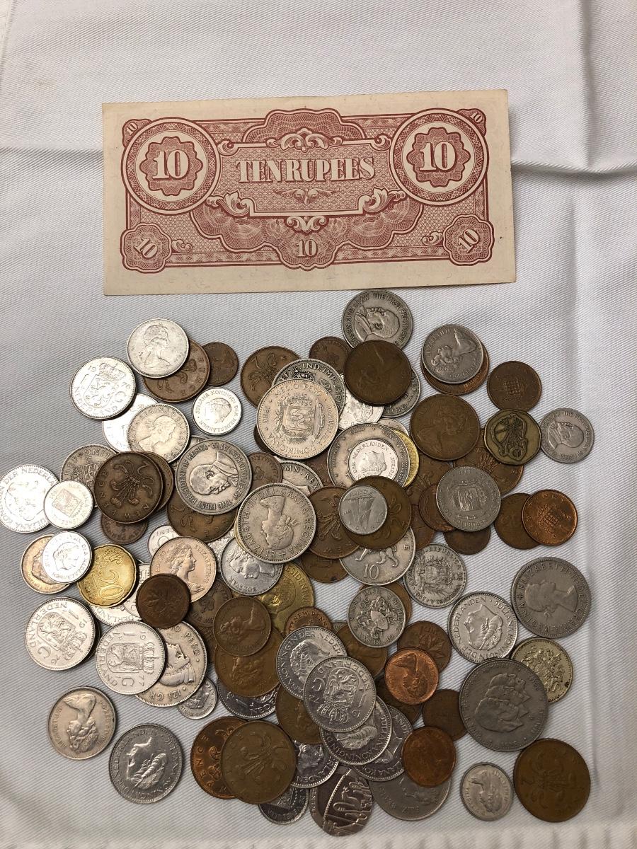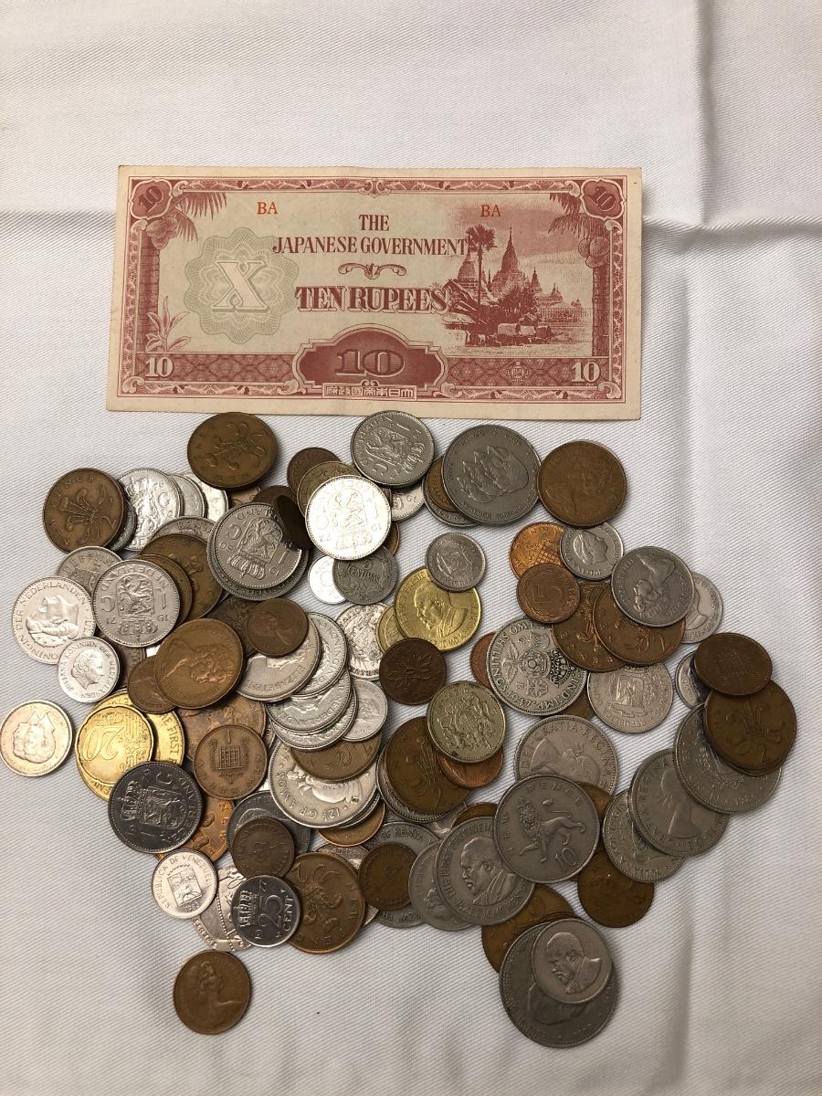 Over 100 foreign coins with a wide variety of dates. Also a 10 Rupees note issued from the Japanese government. No date. Excellent condition.