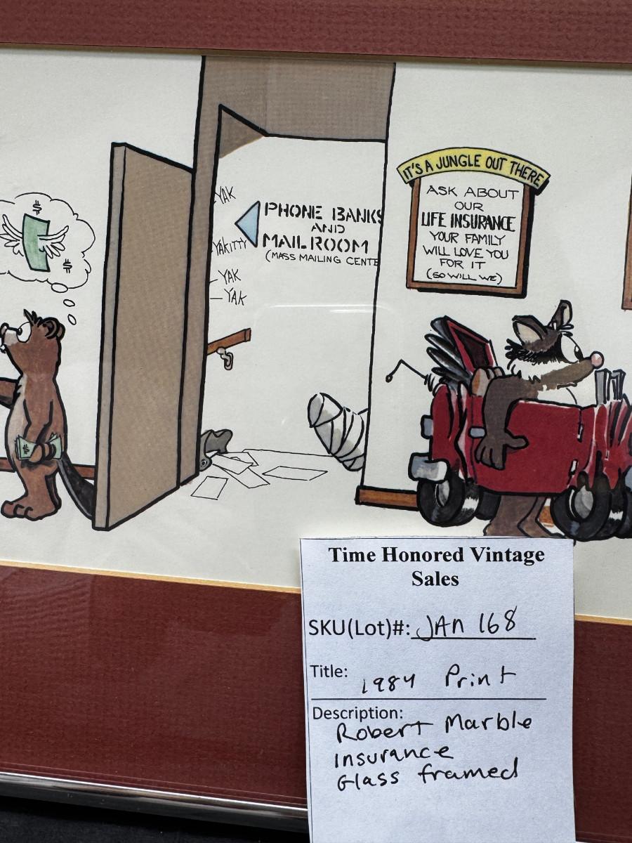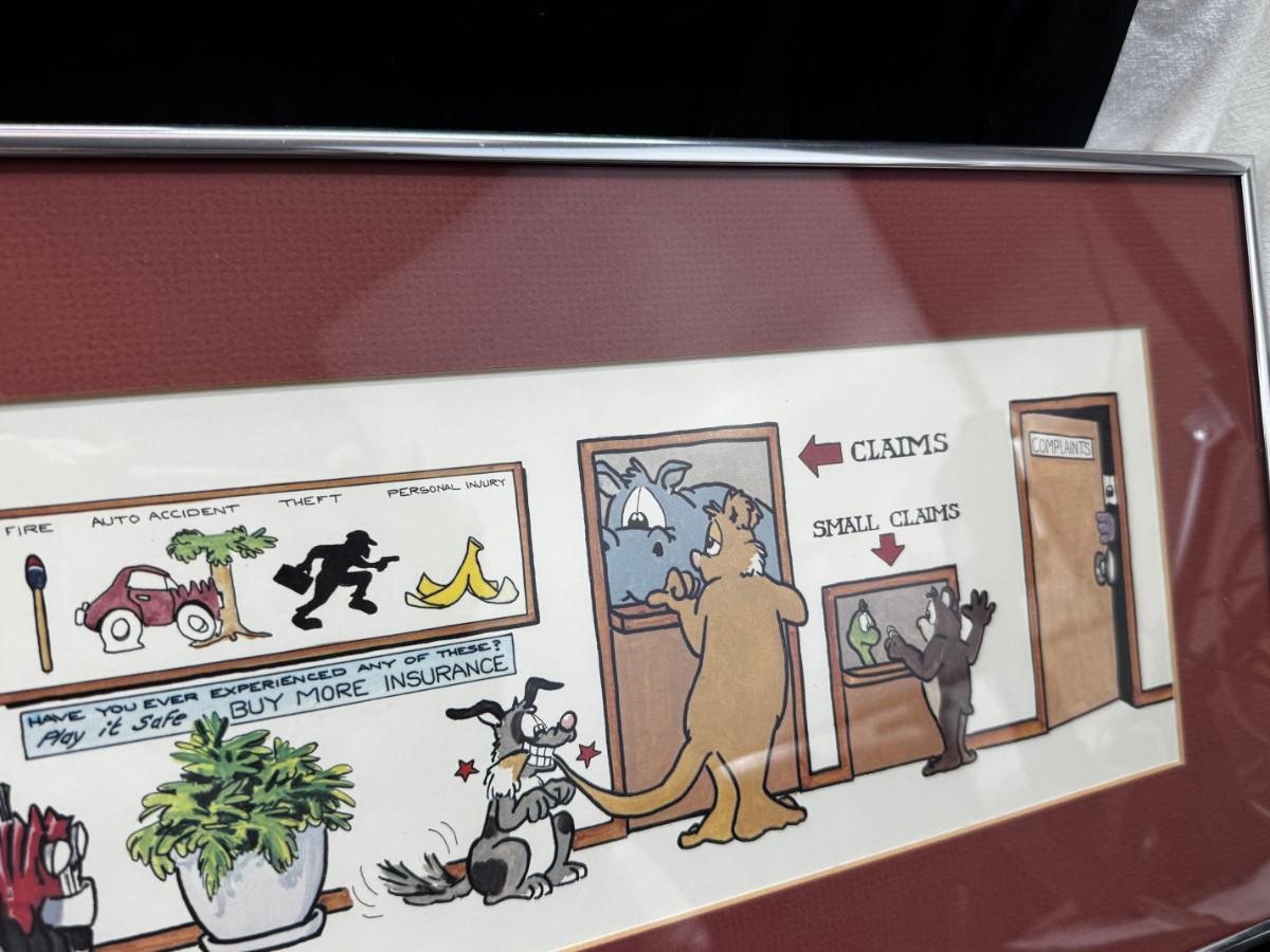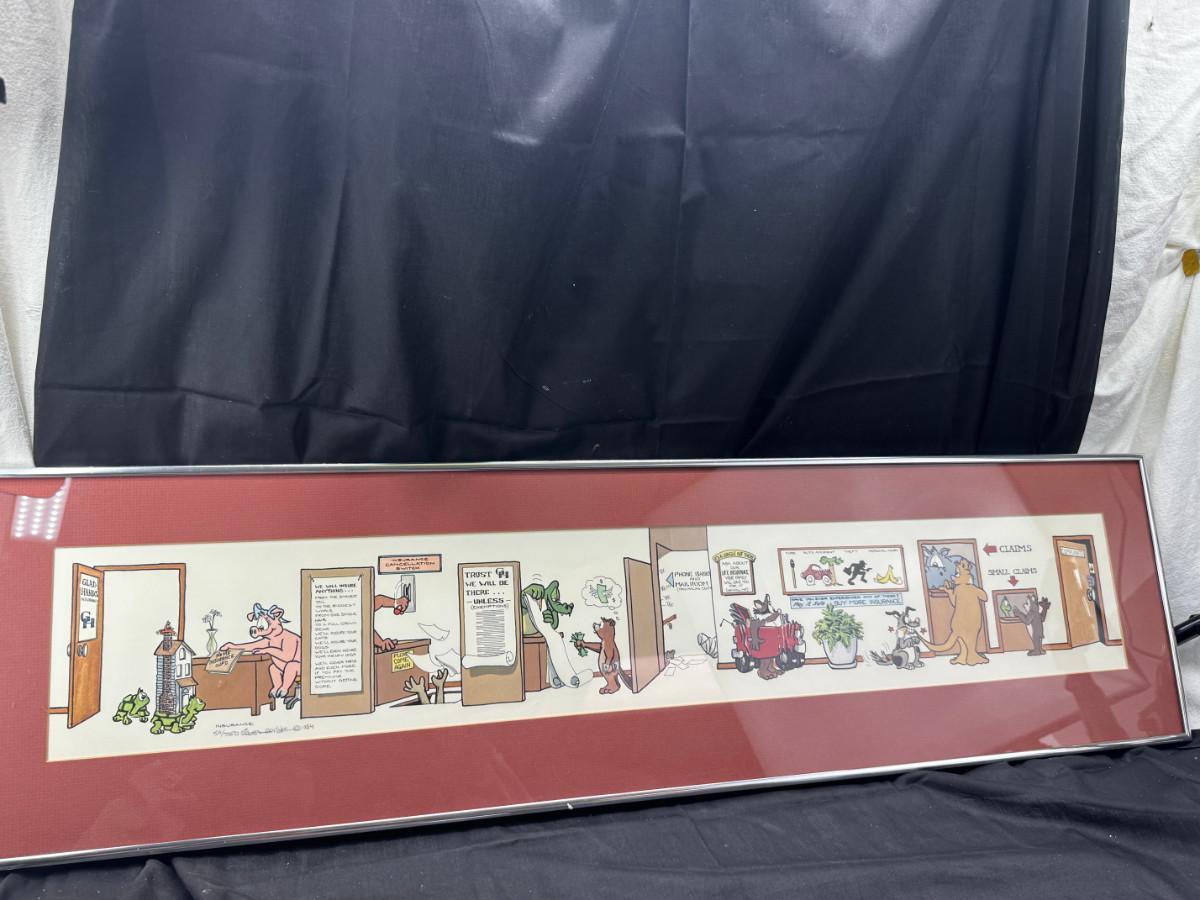 This Robert Marble signed lithograph print is a must-have for insurance professionals or anyone who loves amusing office cartoons. The colorful artwork features animals and is printed on quintessence paper using the lithography technique. The print comes matted and framed, with a size of 38 inches by 10 inches. The artwork was created in 1984 and is an original, licensed reprint. The print is signed by the artist and is one of only 750 copies produced. The aspects of the item include the artist's name, the print's size and framing, the printing technique, culture, subject, and theme. Robert Marble Insurance 54/750 Signed Lithograph Print 1984 office cartoon decor Glass is cracked in one corner.