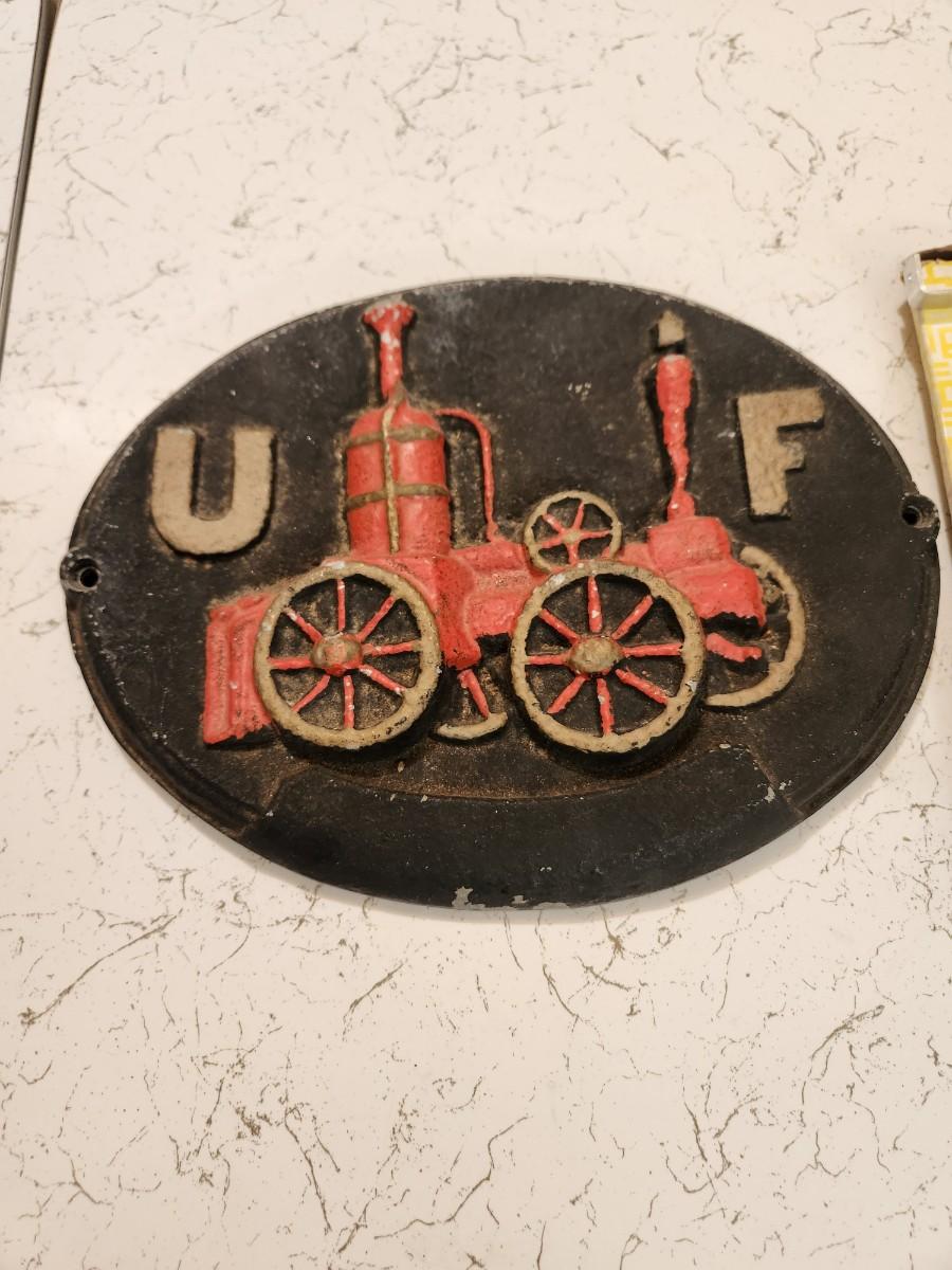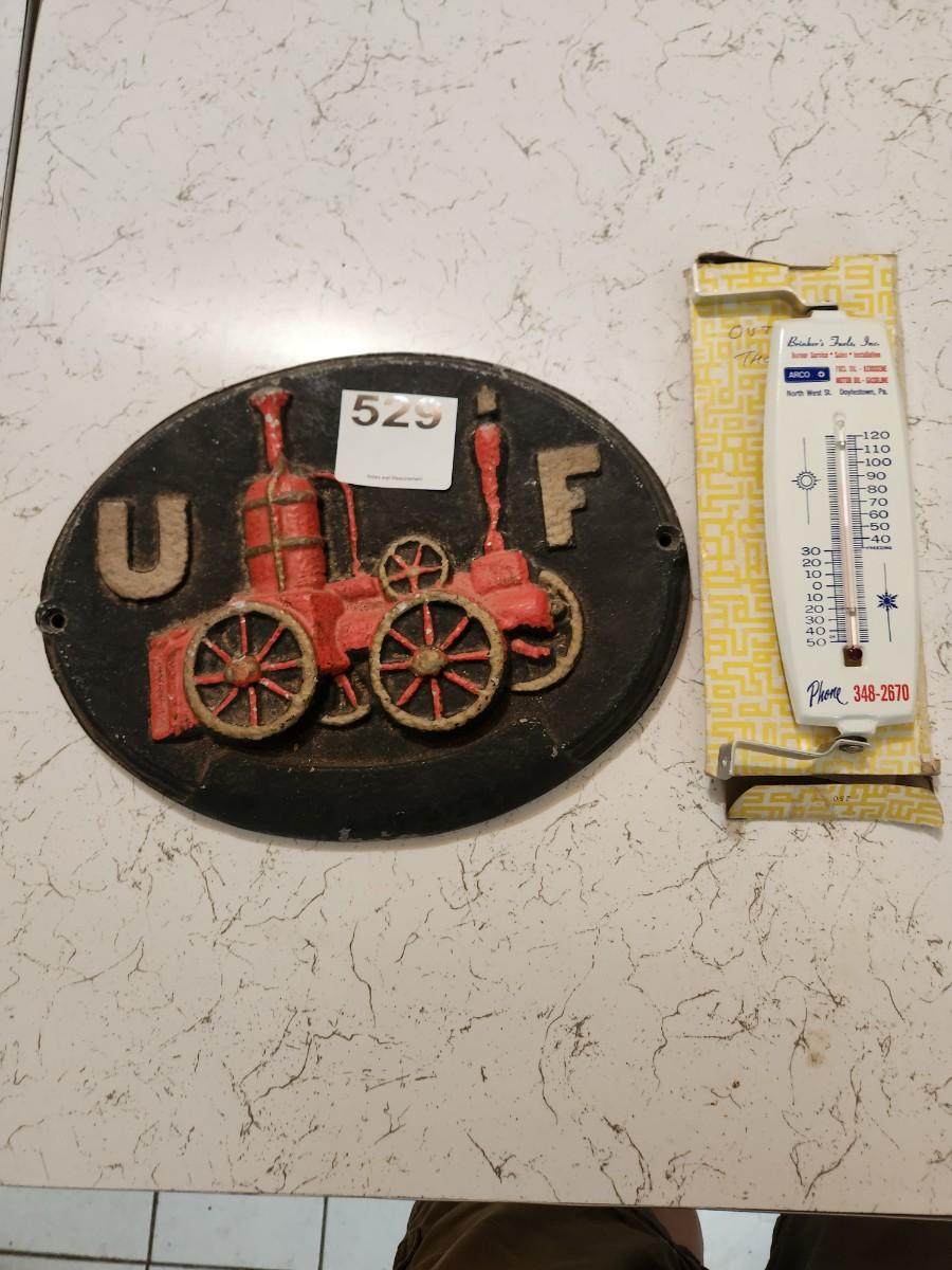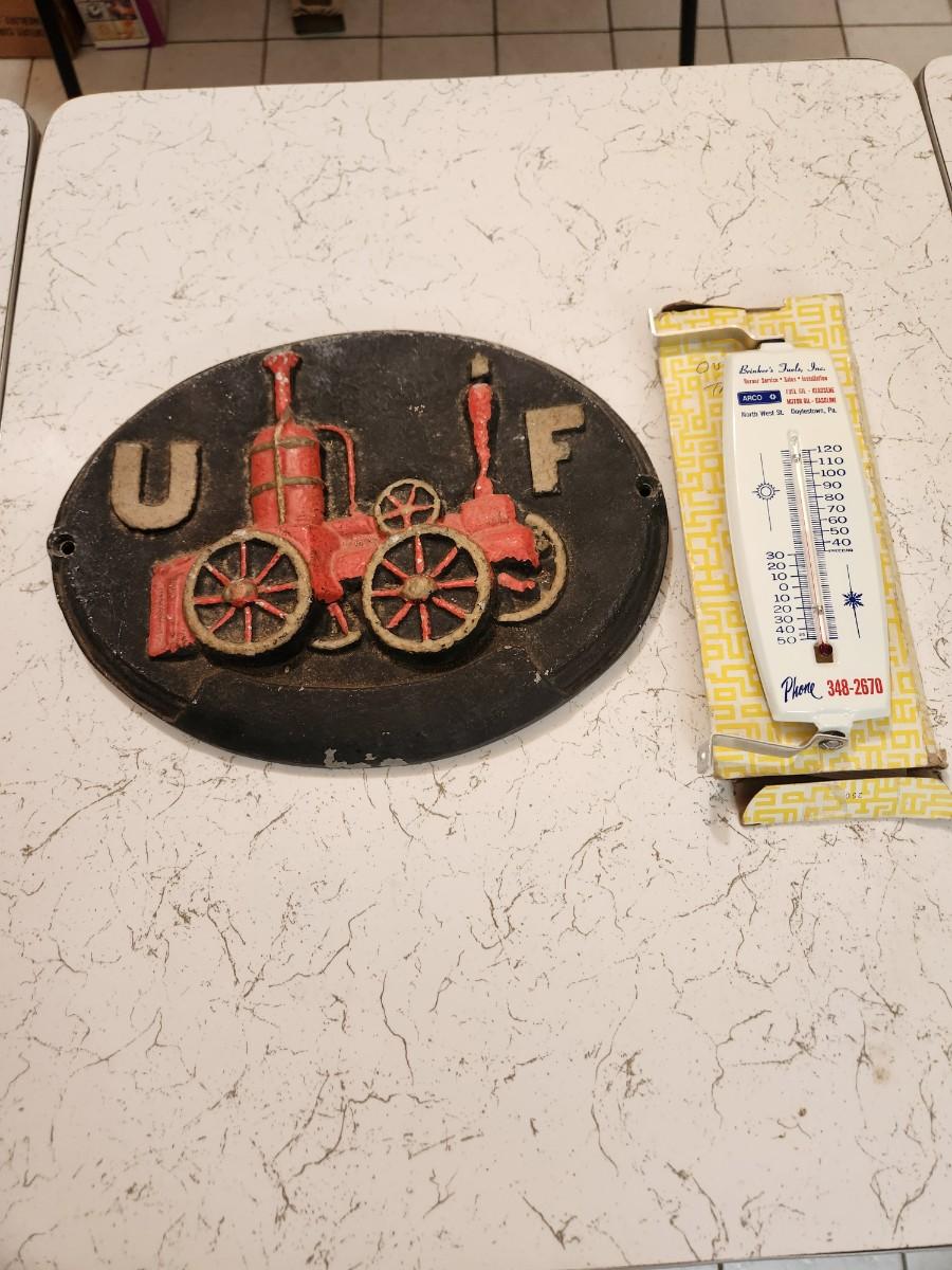 Vintage Cast Iron Metal United Fireman Insurance Plaque fire engine sign & Arco thermometer
