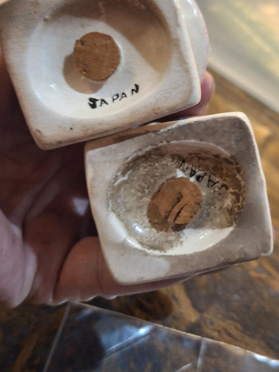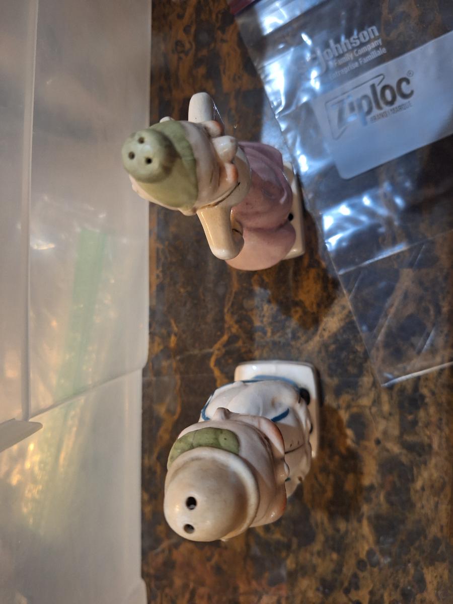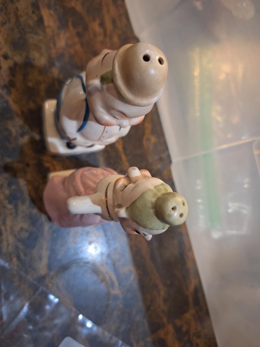 intage ceramic "Turnabout" salt and pepper shakers, likely made in Japan in the 1940s or 1950s.